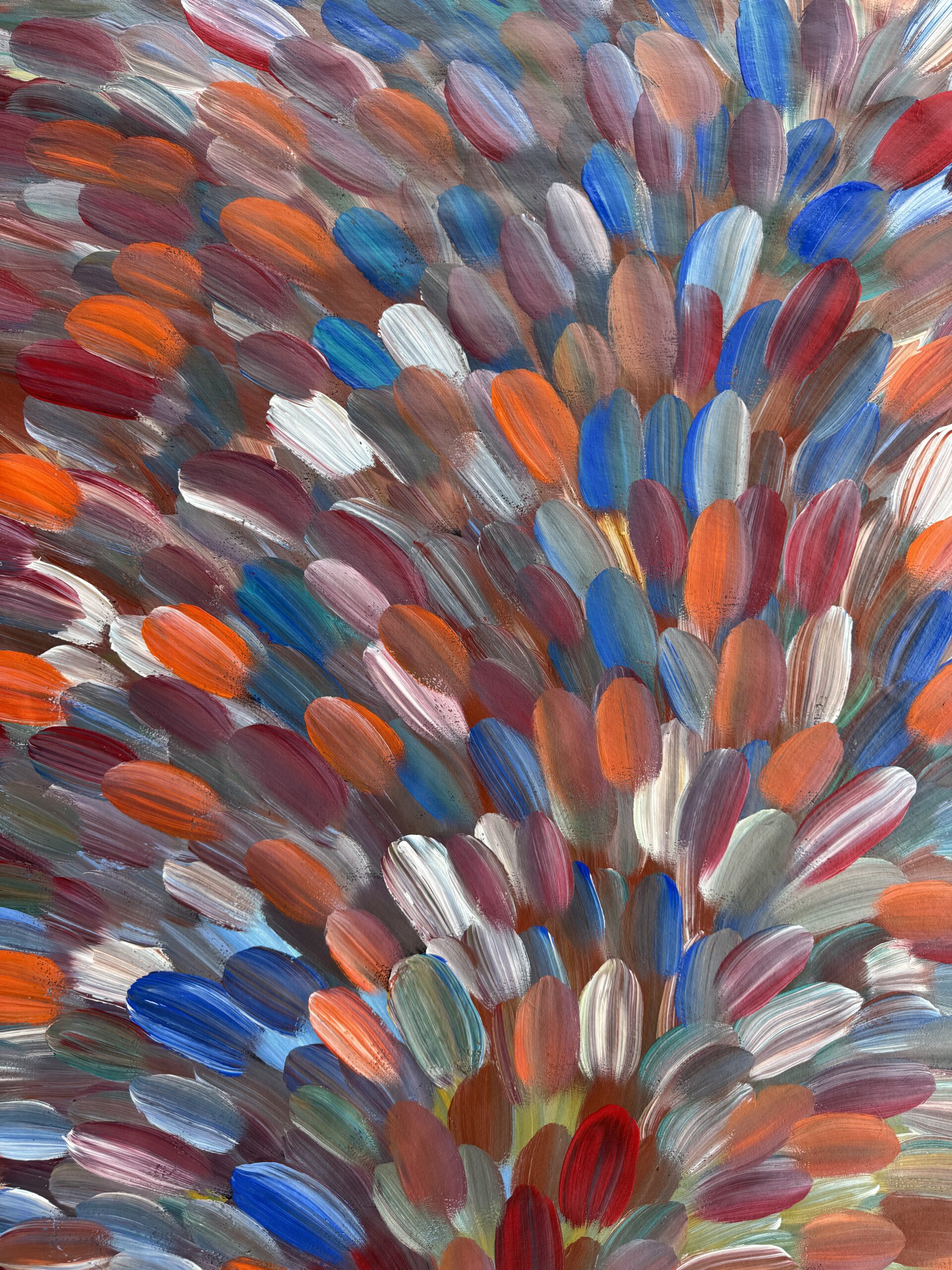 Louise, her sisters and two brothers were born to Barbara Pananka Price and the late Douglas Petyarre. Their artistic lineage runs deep: two of Douglas’ sisters, the internationally acclaimed artists Gloria and Kathleen Petyarre, passed down their knowledge, teaching their nieces the Bush Medicine Leaf ceremony (Aunty Gloria) and the Thorny Lizard Dreaming (Aunty Kathleen). The Numina sisters are also great-nieces to iconic artists Emily Kngwarreye and Kudditji Kngwarreye, and share connections with Minnie Pwerle and Ada Bird Petyarre—towering figures of the Utopia art movement that emerged in the Eastern Desert in the 1970s.