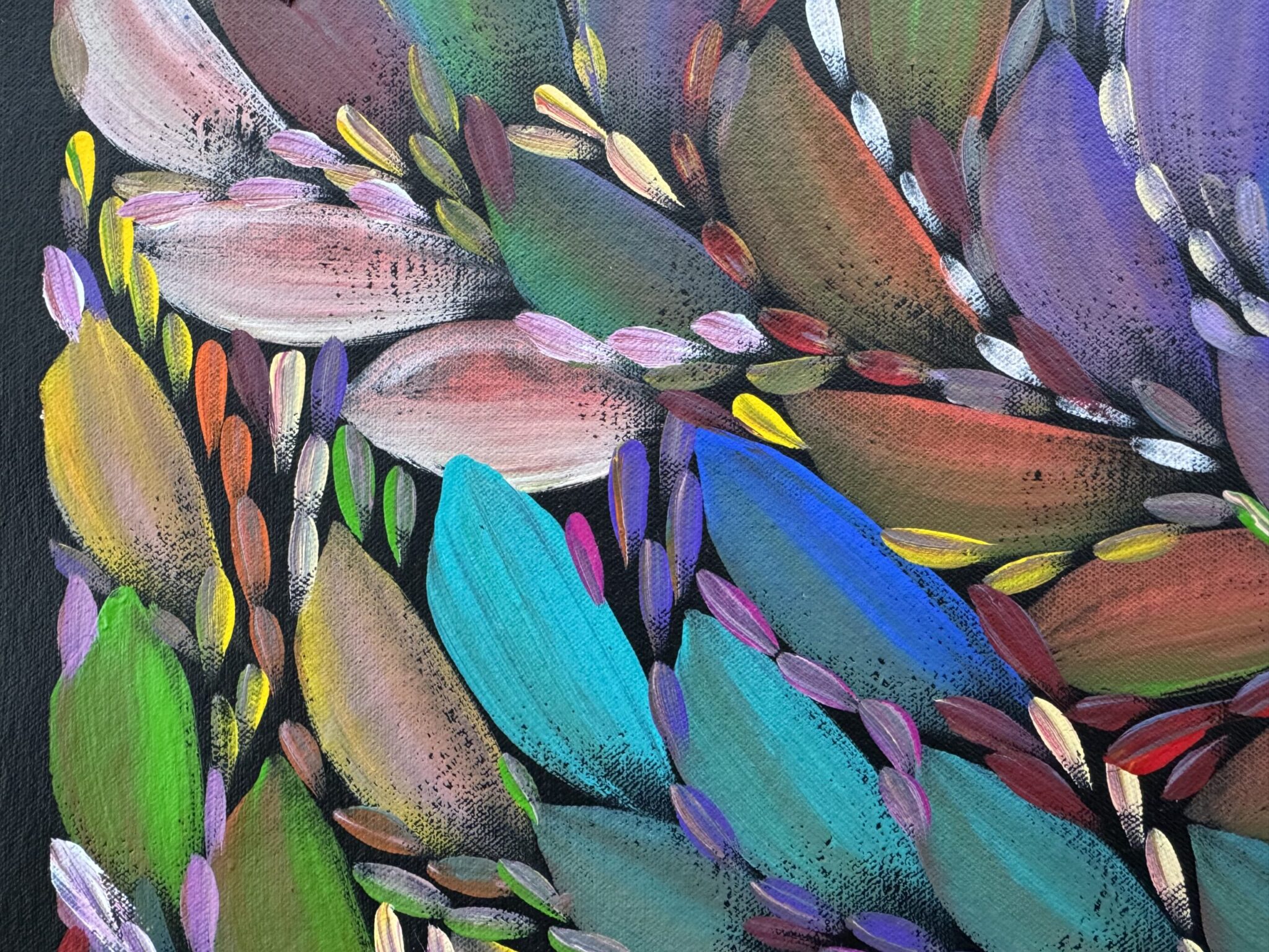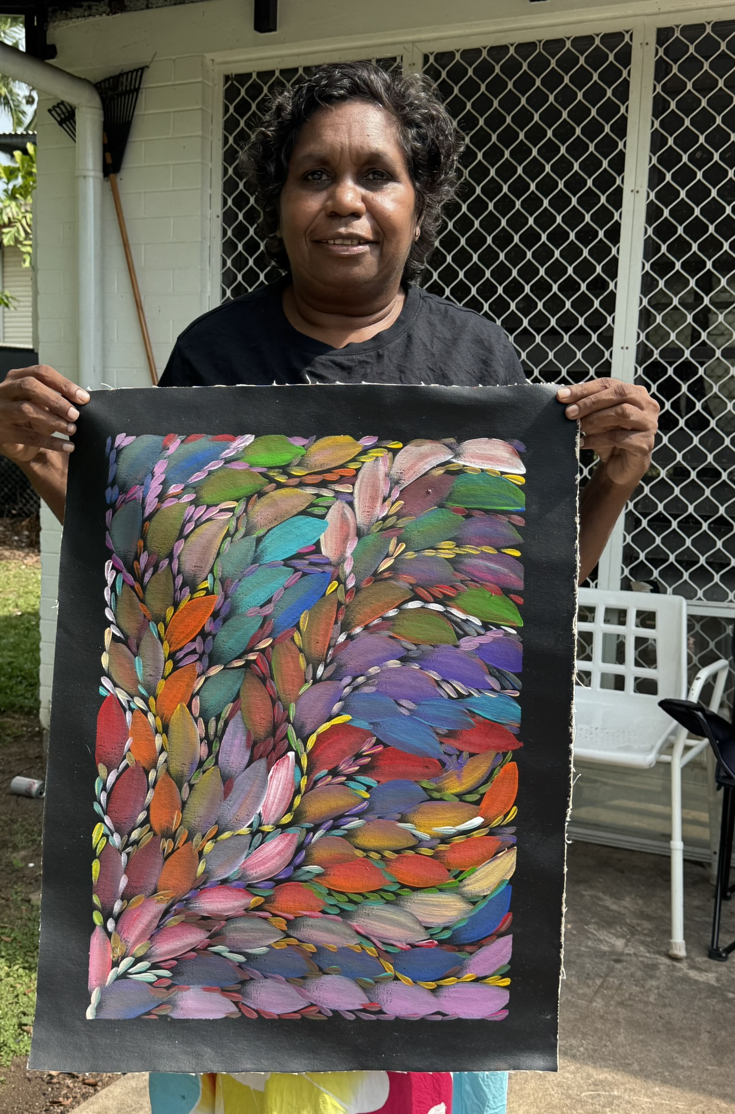 In the early 1990s Selina moved to Darwin, where she continues to live, paint and support her extended family. Her art practice is not just creative — it is cultural caretaking. Every stroke, pattern and layered movement carries memory, story, country and lineage.