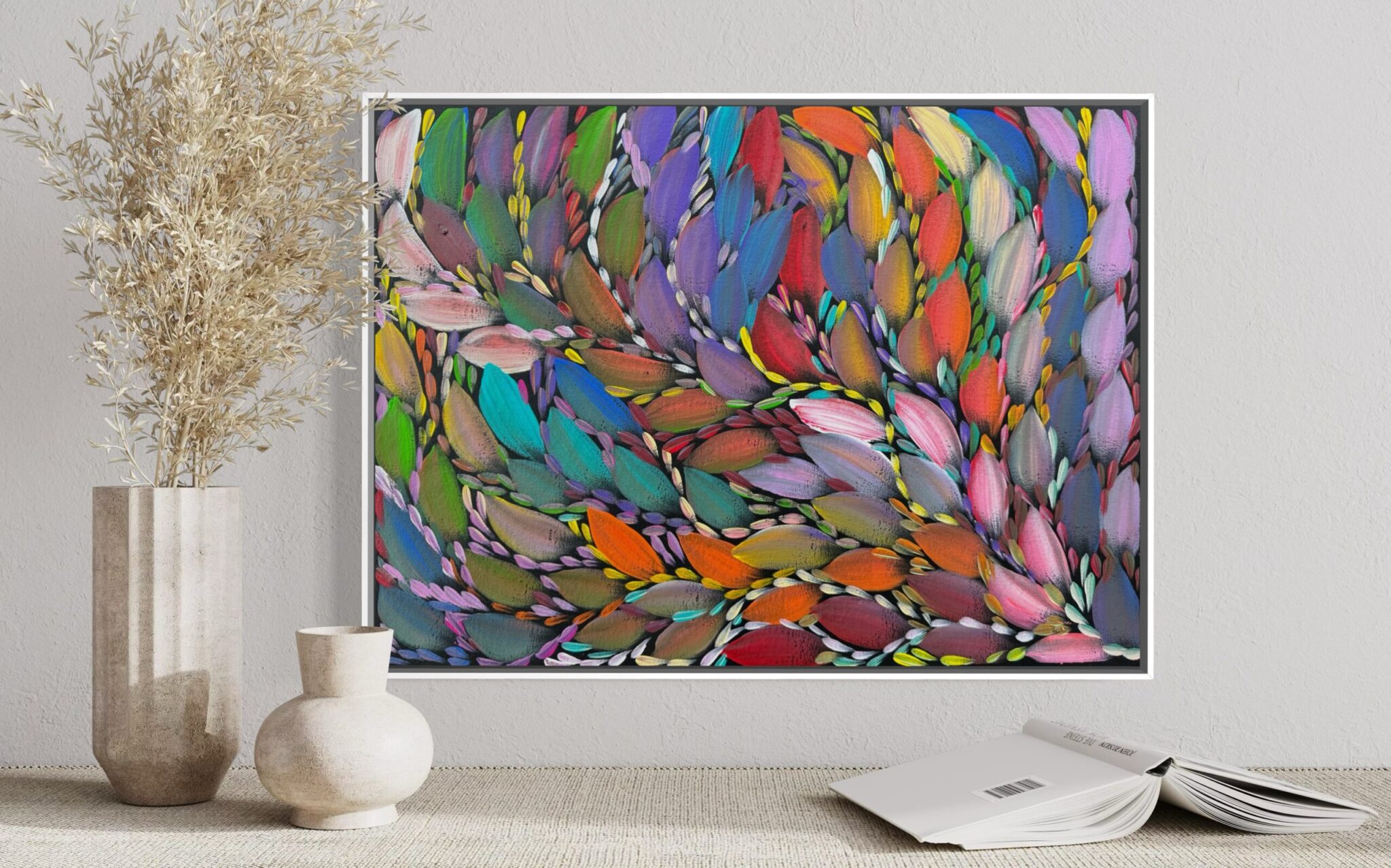 This painting tells the story of bush medicine — the traditional knowledge of healing plants, leaves, roots, and bark that has been passed down through generations. Bush medicine is central to life on Country, used to treat sickness, cleanse the body, protect spirit, and maintain balance between people and the land.