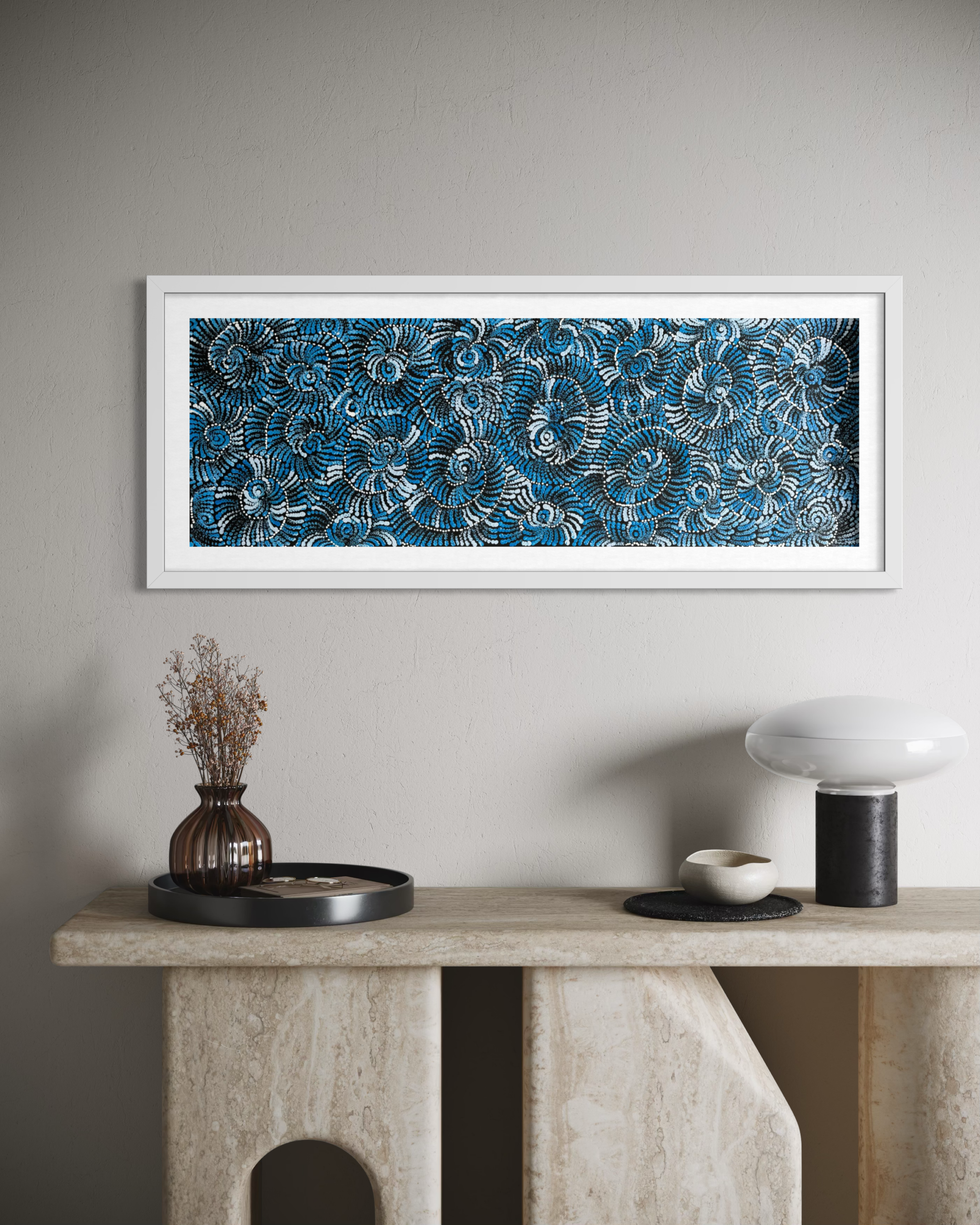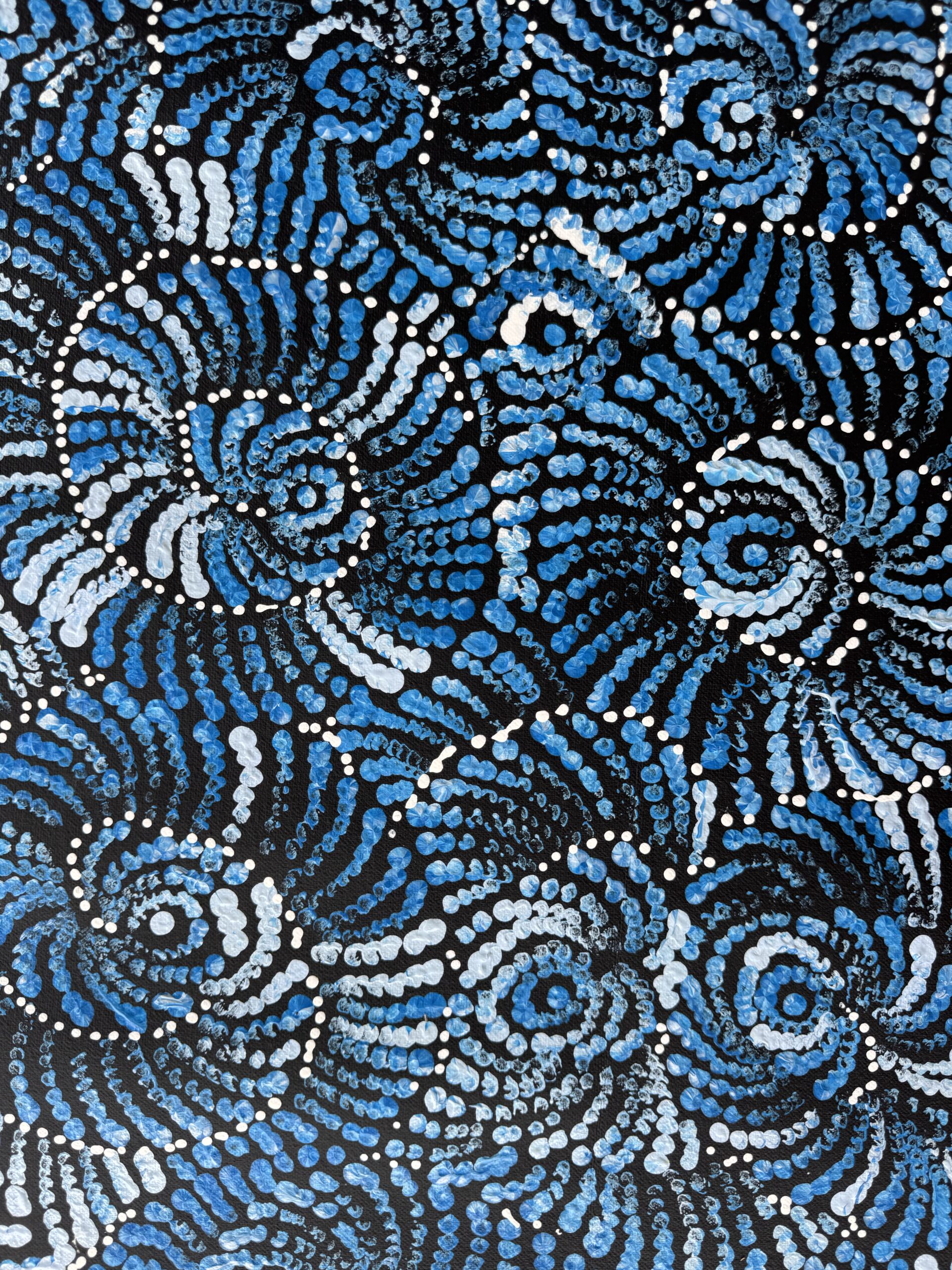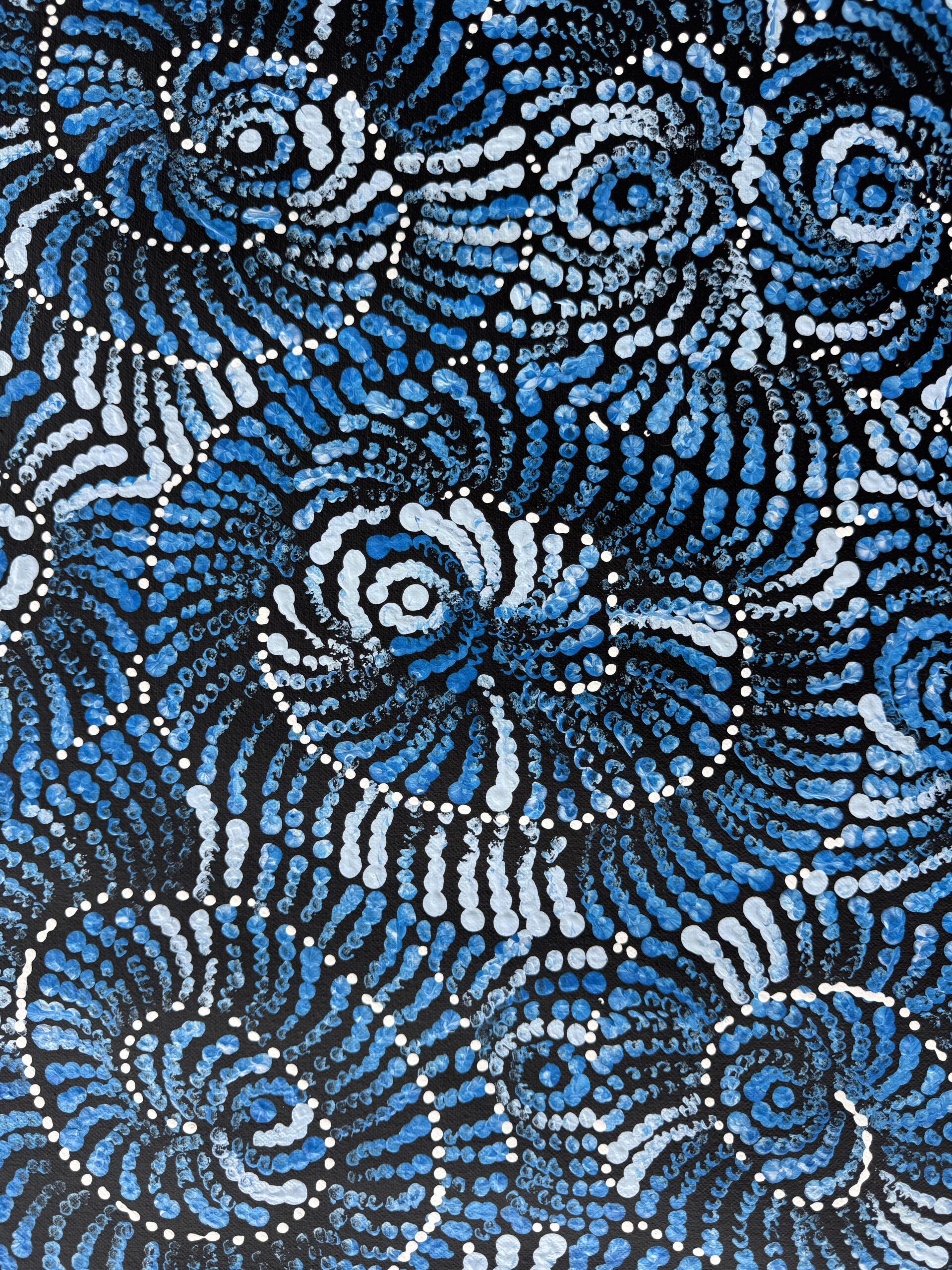Maria’s work blends traditional iconography with her own modern style, bringing her cultural heritage to life. When she’s not painting, you can find her sharing stories with her grandchildren, hunting for honey ants during the rain, or collecting firewood to cook kangaroo tails. Her life and art are beautifully intertwined, reflecting the rich tapestry of her heritage and the stories she cherishes.