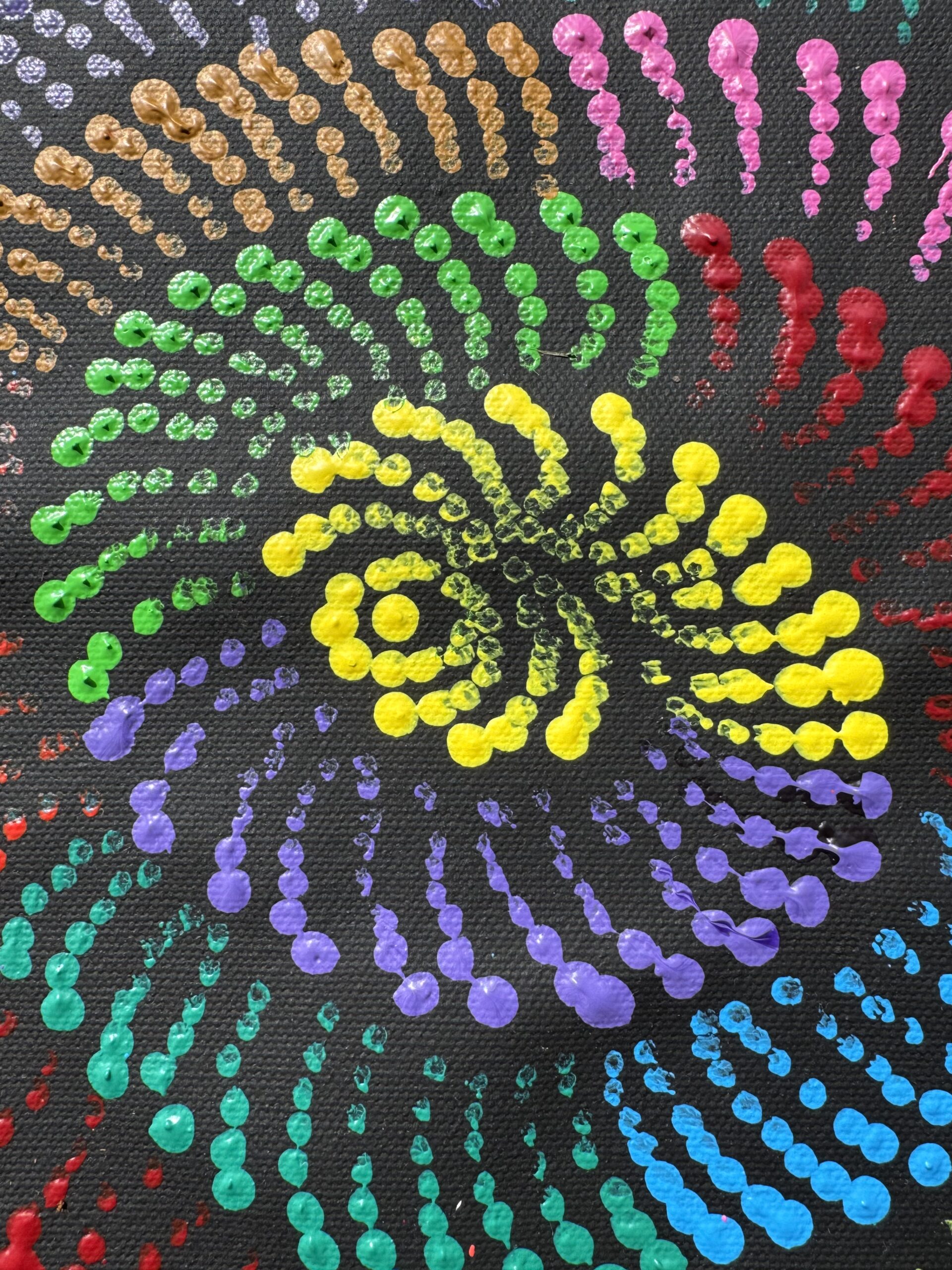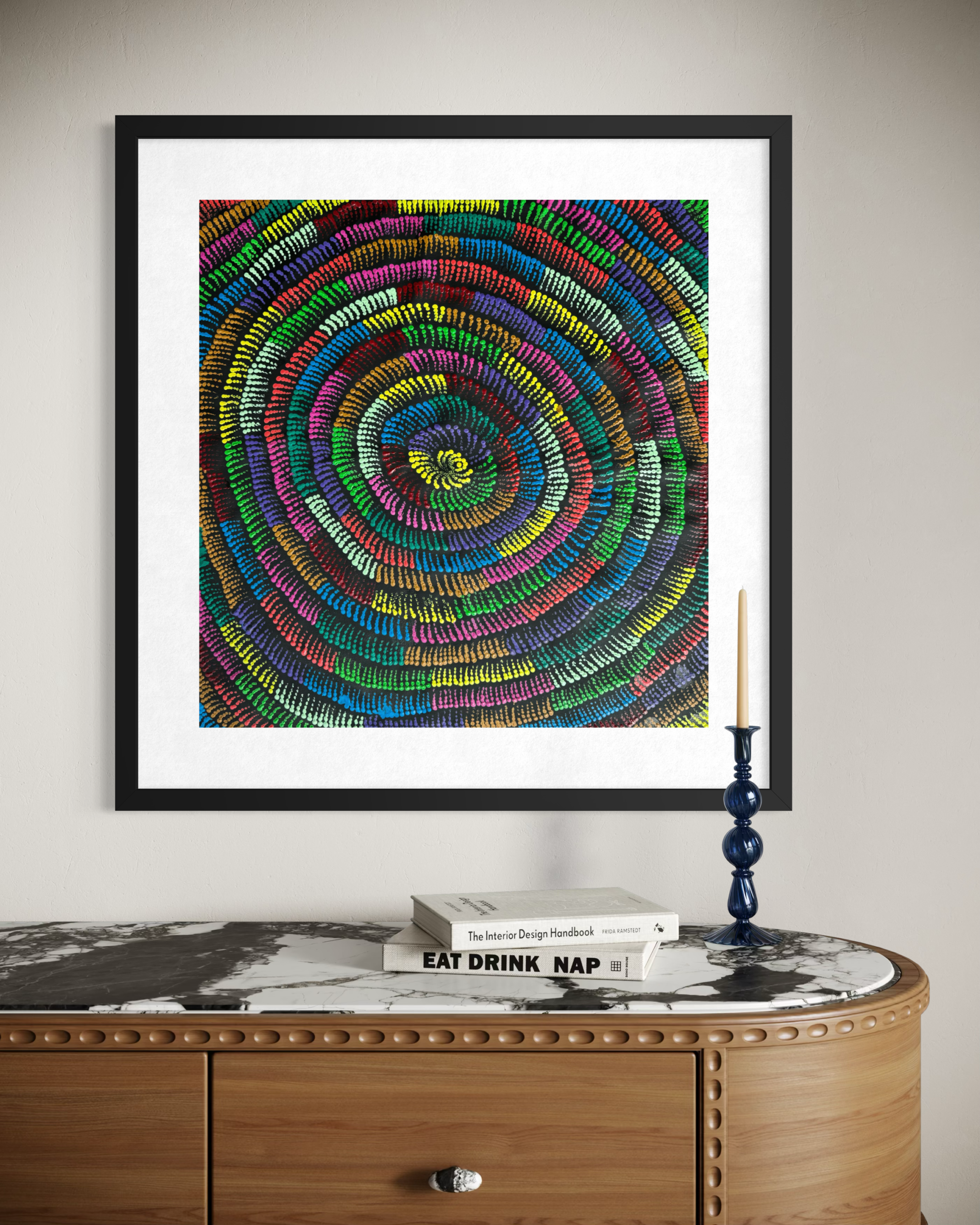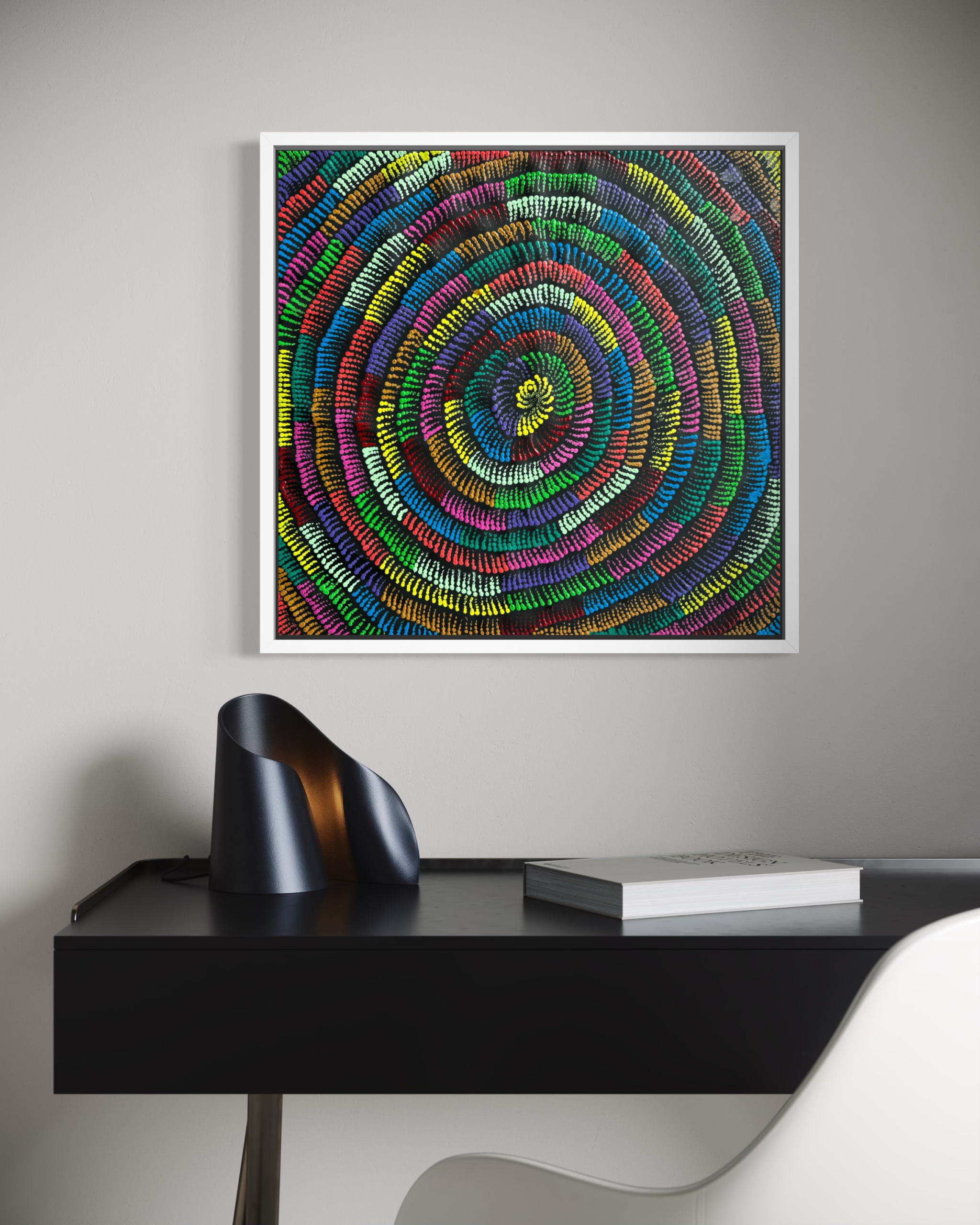 Maria’s work blends traditional iconography with her own modern style, bringing her cultural heritage to life. When she’s not painting, you can find her sharing stories with her grandchildren, hunting for honey ants during the rain, or collecting firewood to cook kangaroo tails. Her life and art are beautifully intertwined, reflecting the rich tapestry of her heritage and the stories she cherishes.