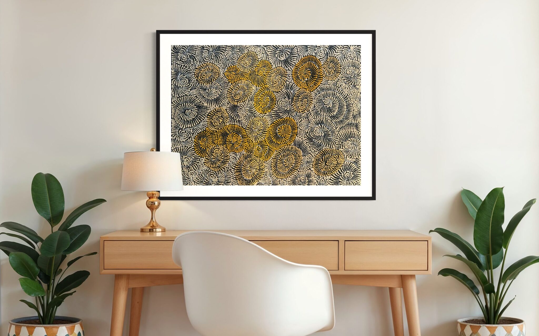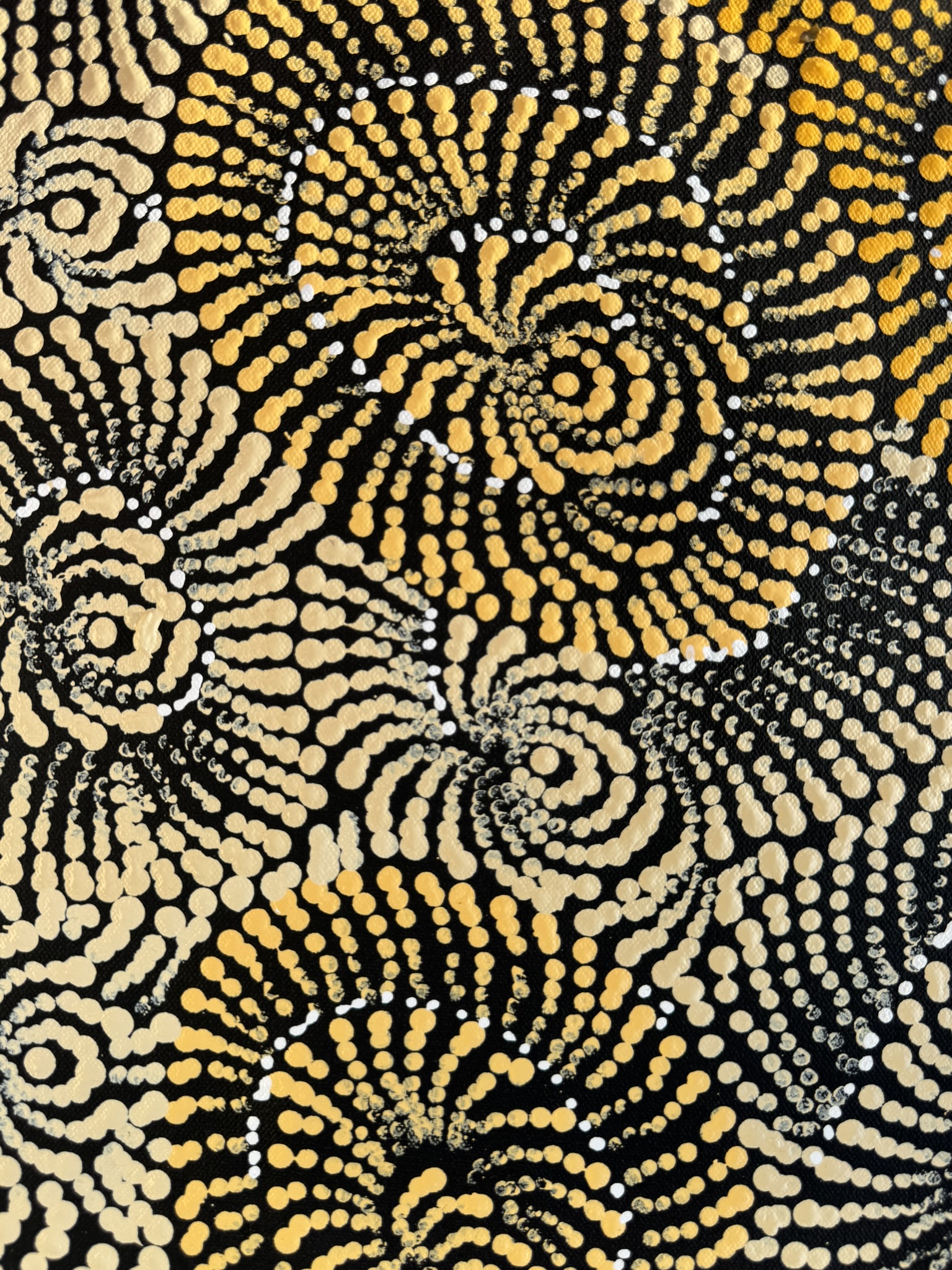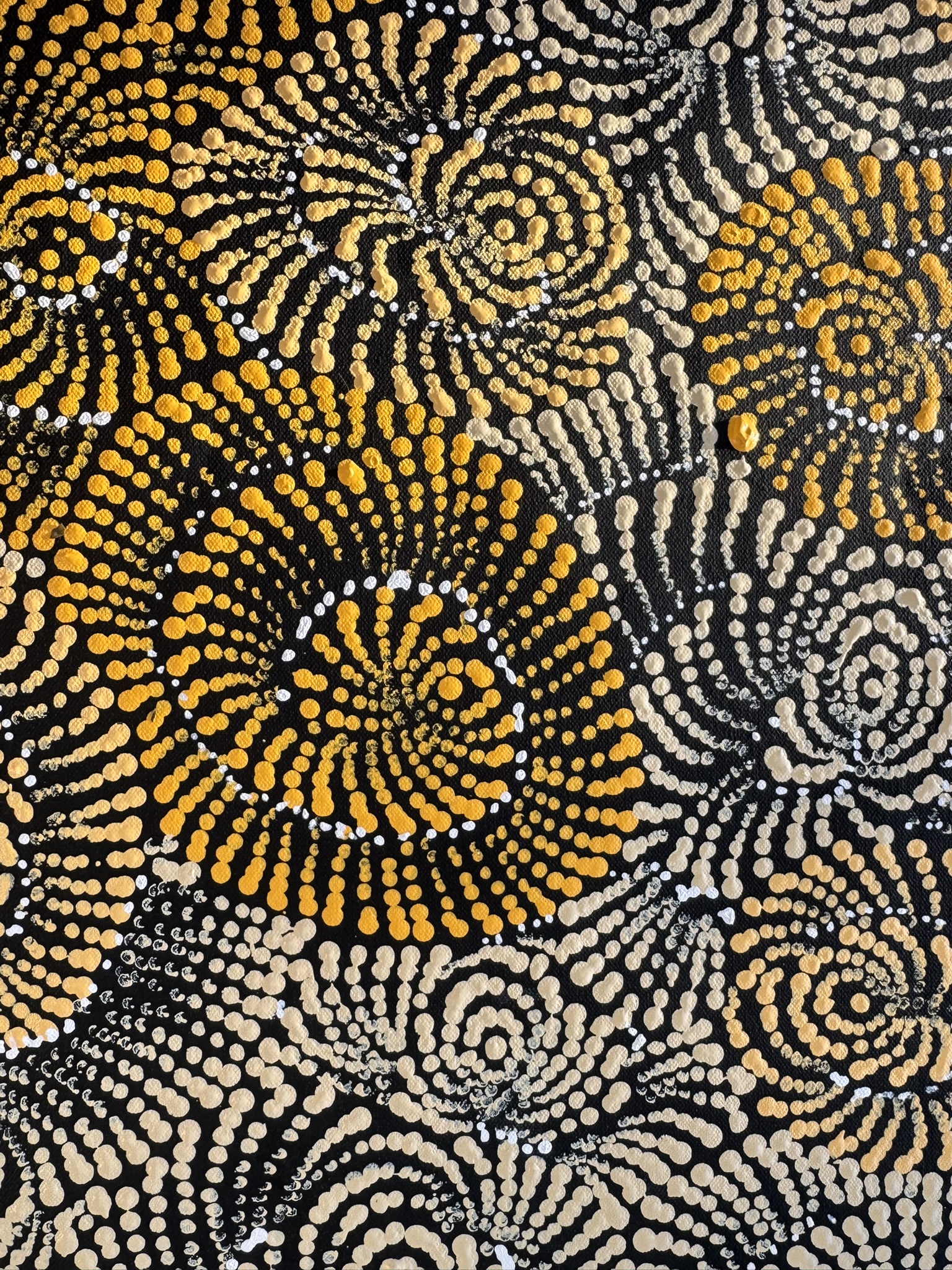 Maria’s work blends traditional iconography with her own modern style, bringing her cultural heritage to life. When she’s not painting, you can find her sharing stories with her grandchildren, hunting for honey ants during the rain, or collecting firewood to cook kangaroo tails. Her life and art are beautifully intertwined, reflecting the rich tapestry of her heritage and the stories she cherishes.
