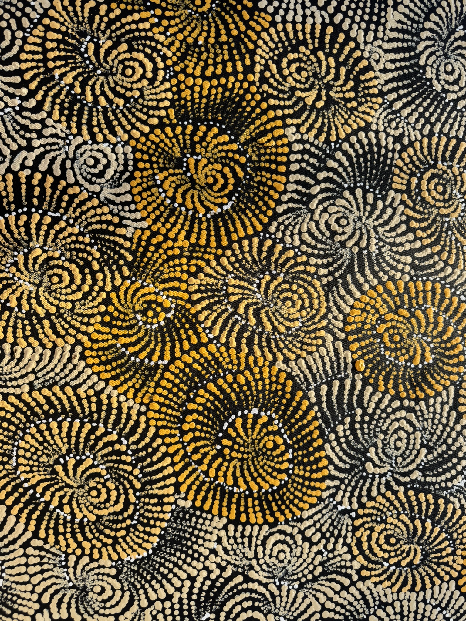 The artwork reflects a deep connection to the land and the ancestral stories that guide spiritual and practical knowledge. The rhythmic repetitions and geometric designs illustrate the harmony within nature, emphasizing the balance and interdependence of all living beings. Flying Ant Dreaming stands as a testament to the profound storytelling tradition of Aboriginal art, beautifully capturing the essence of cultural heritage and the natural world.
