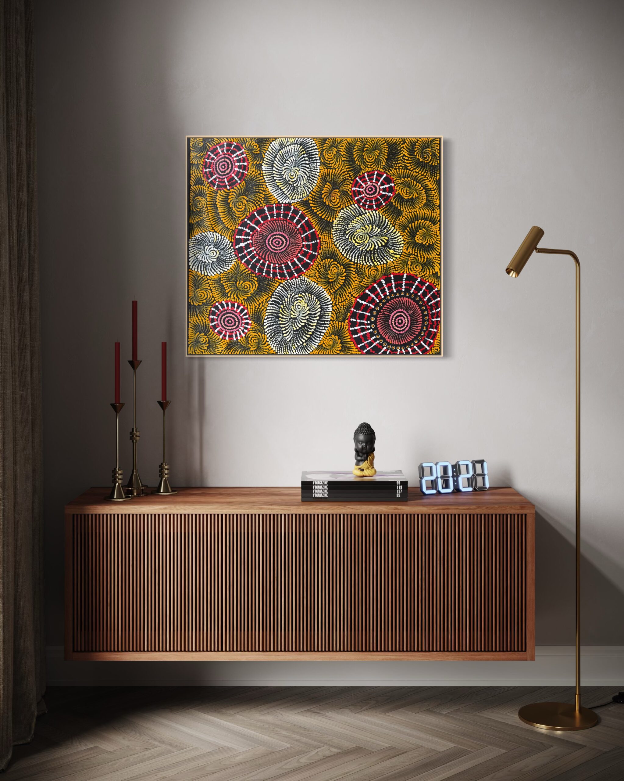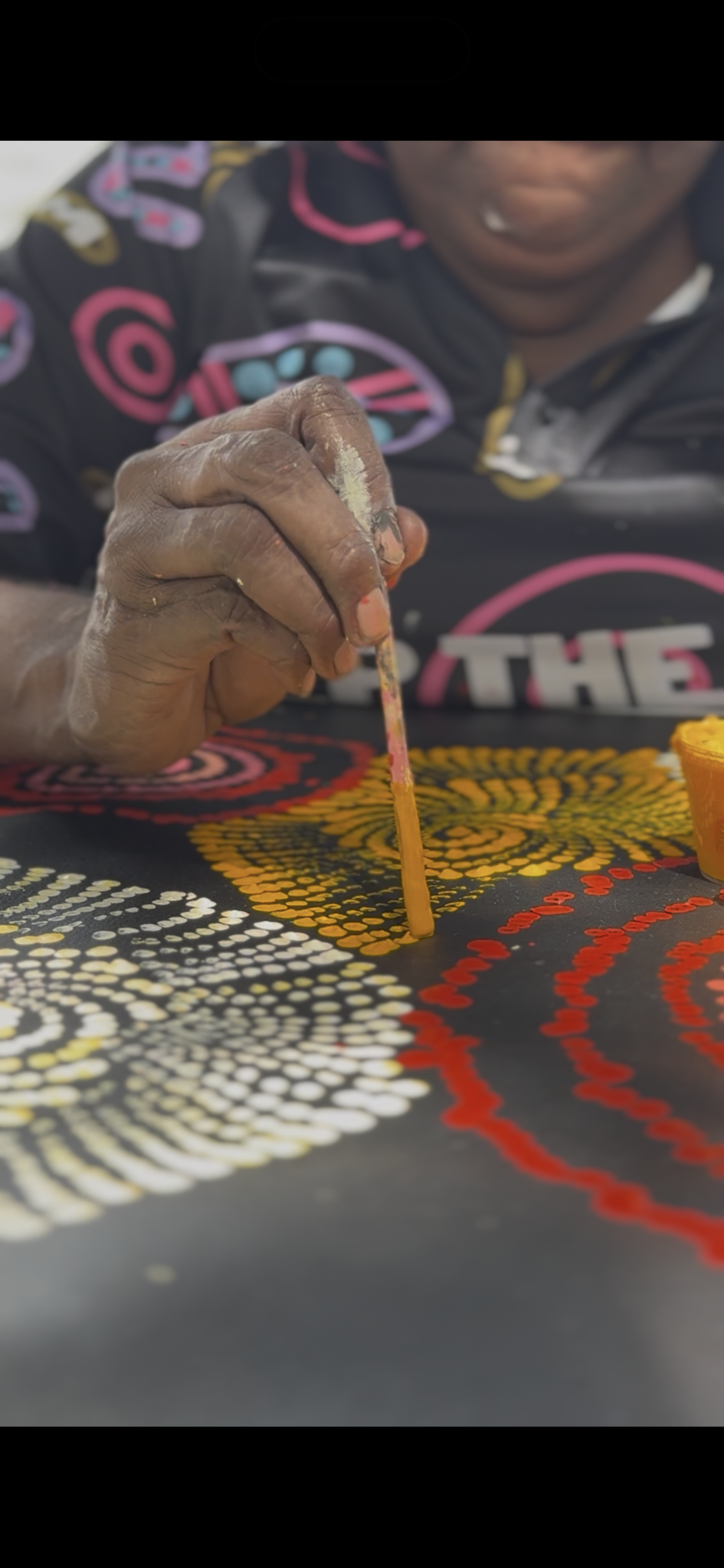 Maria’s work blends traditional iconography with her own modern style, bringing her cultural heritage to life. When she’s not painting, you can find her sharing stories with her grandchildren, hunting for honey ants during the rain, or collecting firewood to cook kangaroo tails. Her life and art are beautifully intertwined, reflecting the rich tapestry of her heritage and the stories she cherishes.