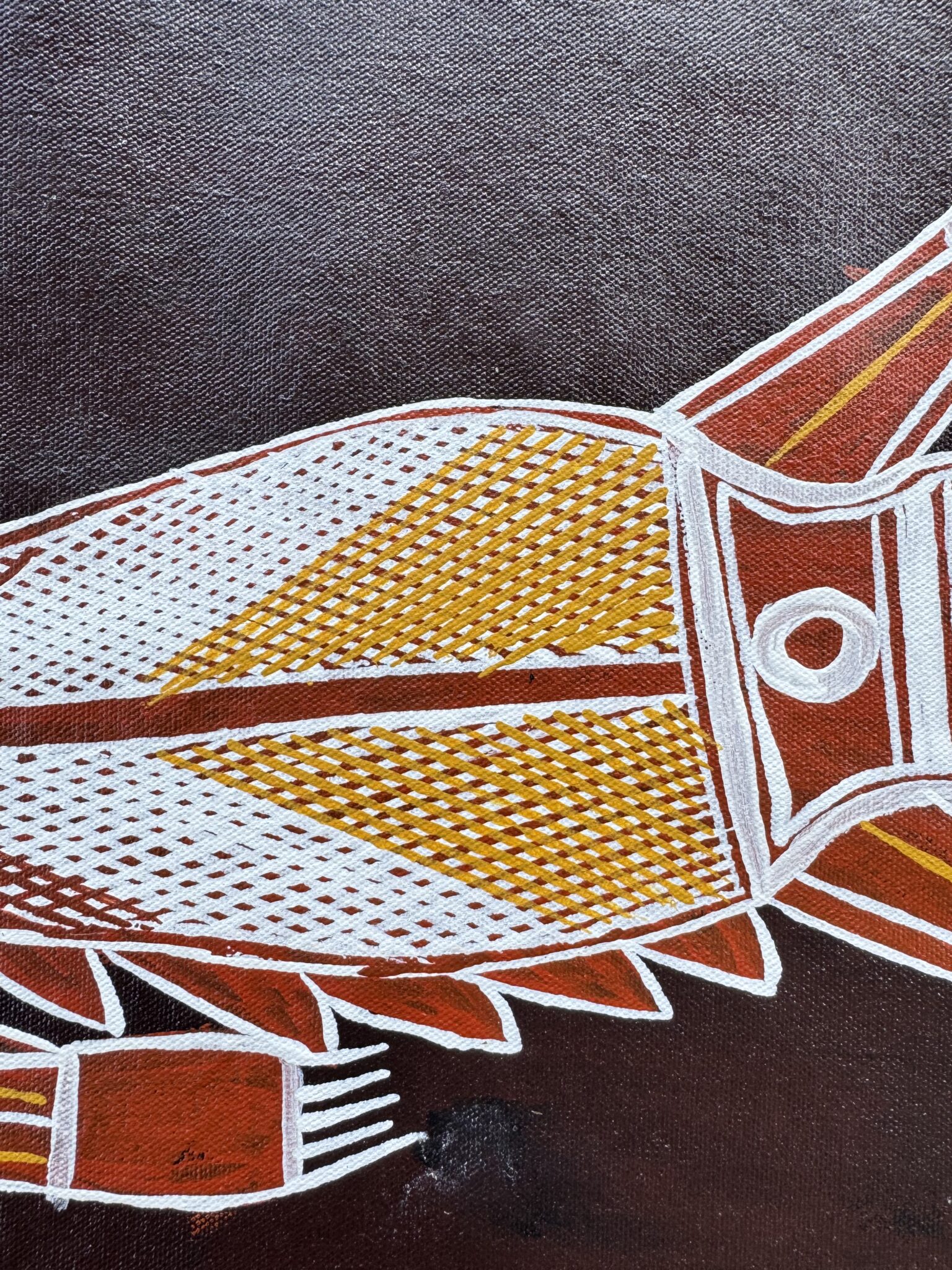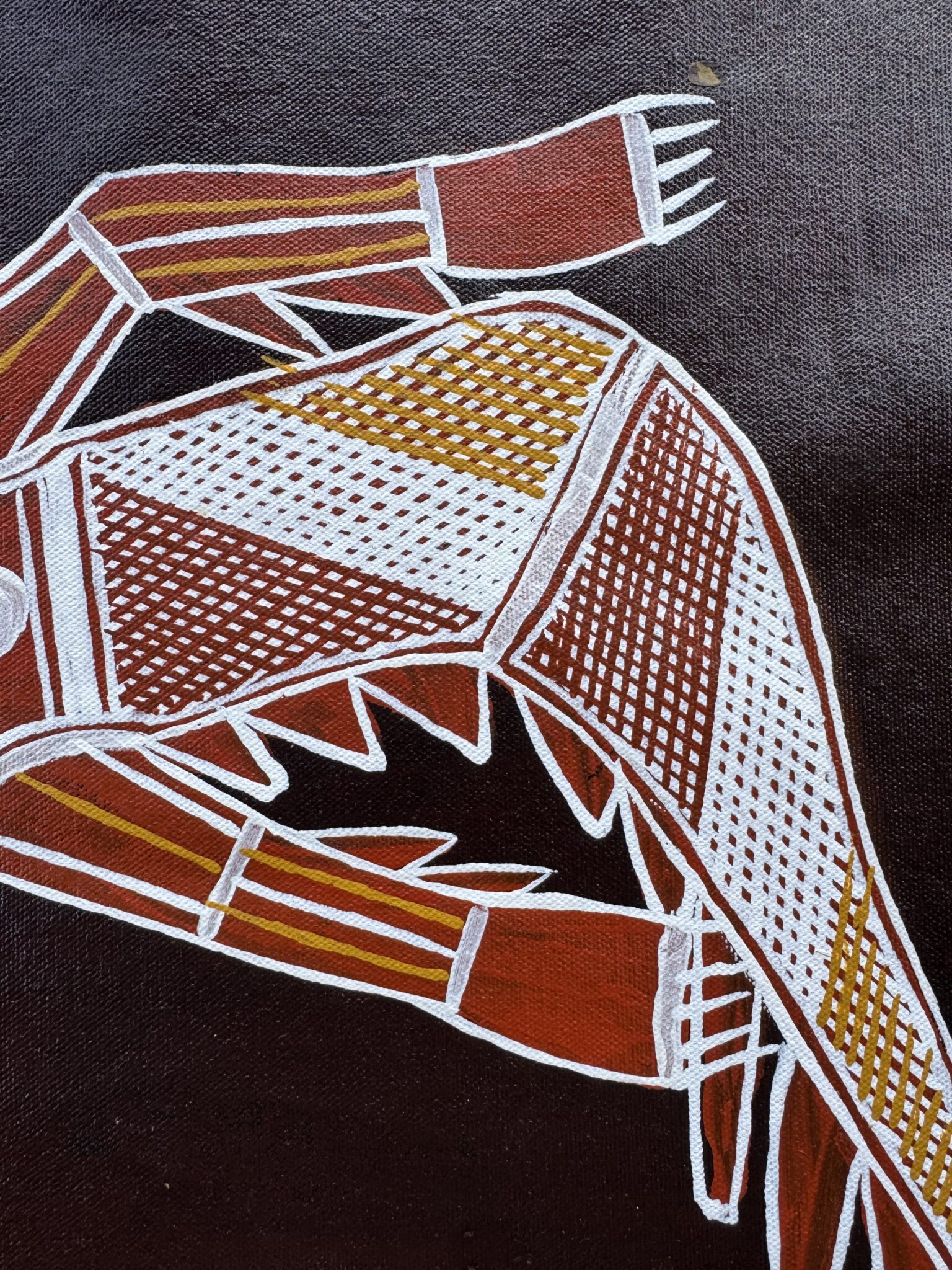 In this painting, Eric represents Ginga moving through the water, watching and waiting along the riverbanks. The patterns and flowing forms reflect the movement of the crocodile through its natural habitat and the life of the wetlands that surround it. These waterways have sustained people for thousands of years, providing food, knowledge, and stories passed down through generations.
