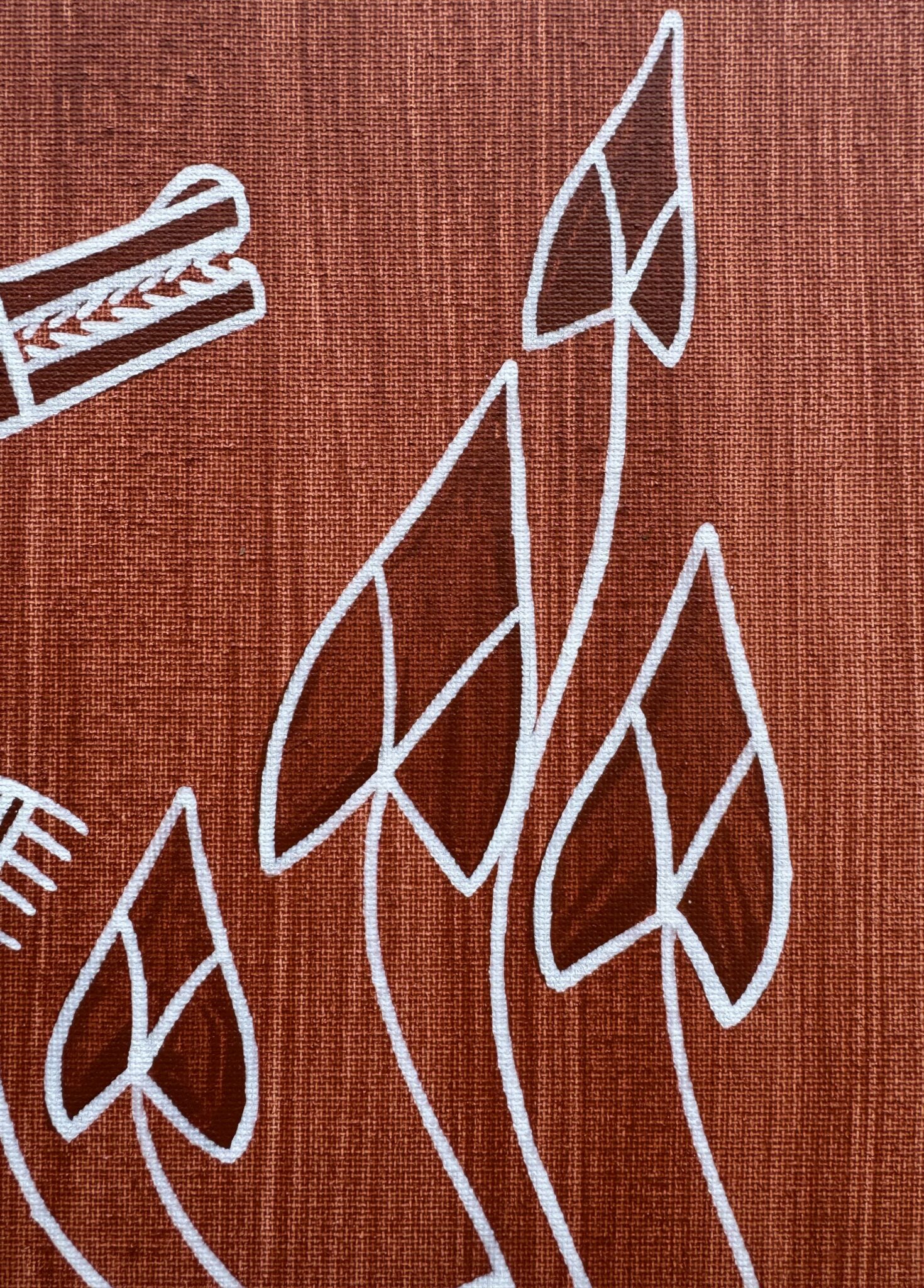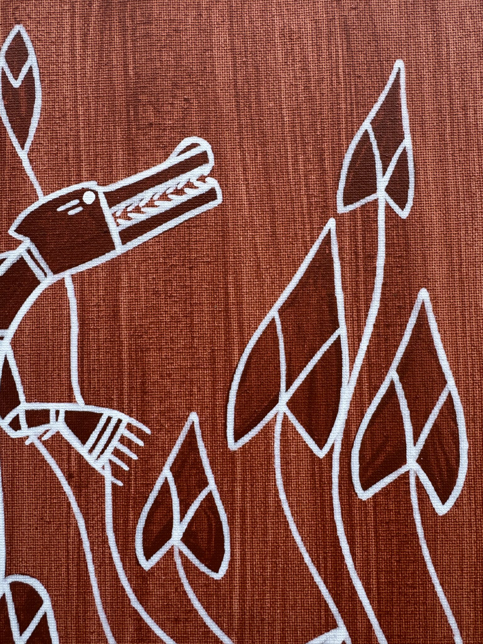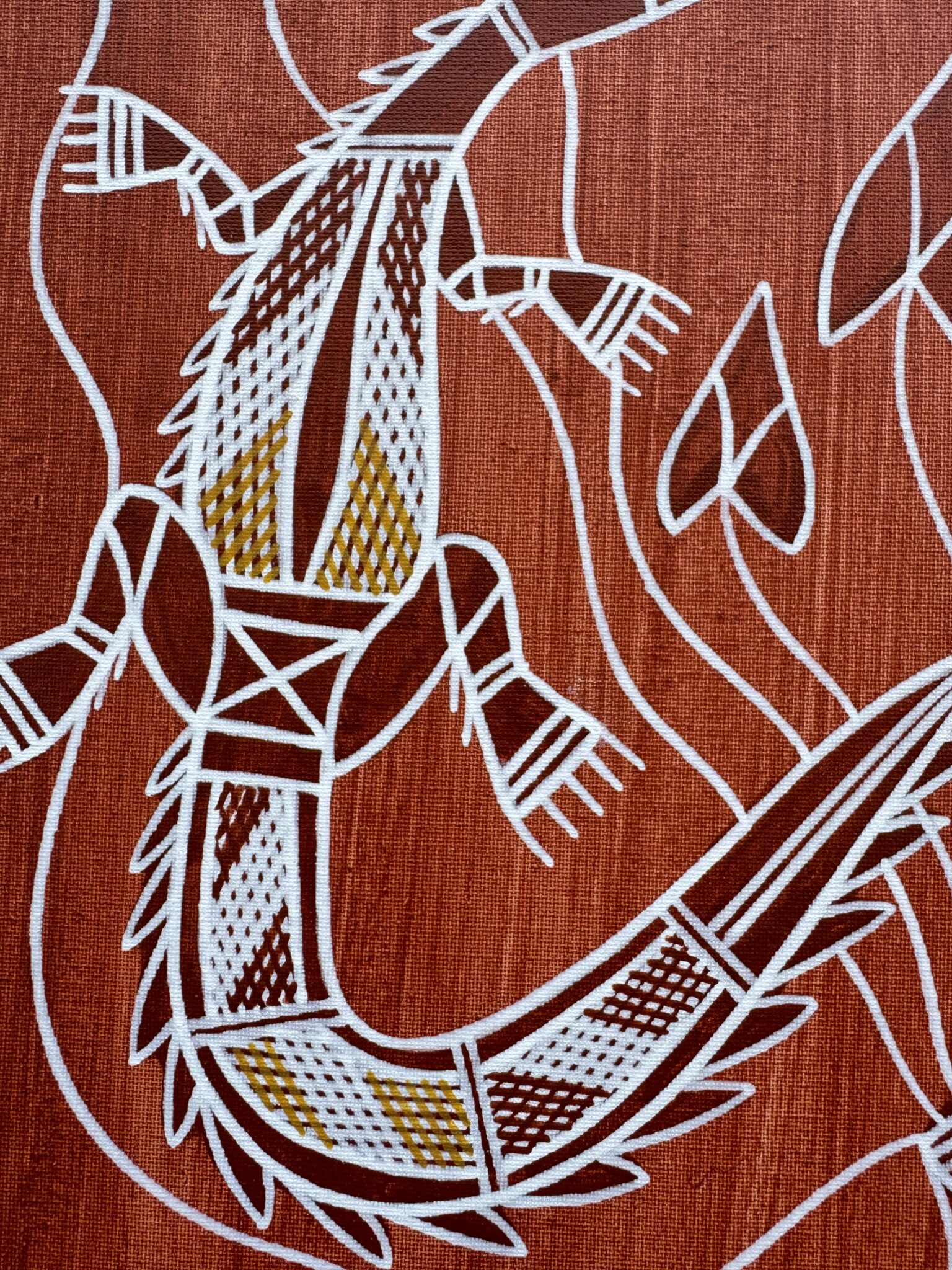 Growing up on Country, Terrence learned the significance of the land, its sacred sites, and the ancestral beings that shape the spiritual landscape of Arnhem Land. These teachings strongly influence his art, which often reflects the stories, animals, and spiritual elements that are central to his culture. Through painting, Terrence shares knowledge of Country and the deep relationship between people, land, and spirit that has existed for thousands of years.