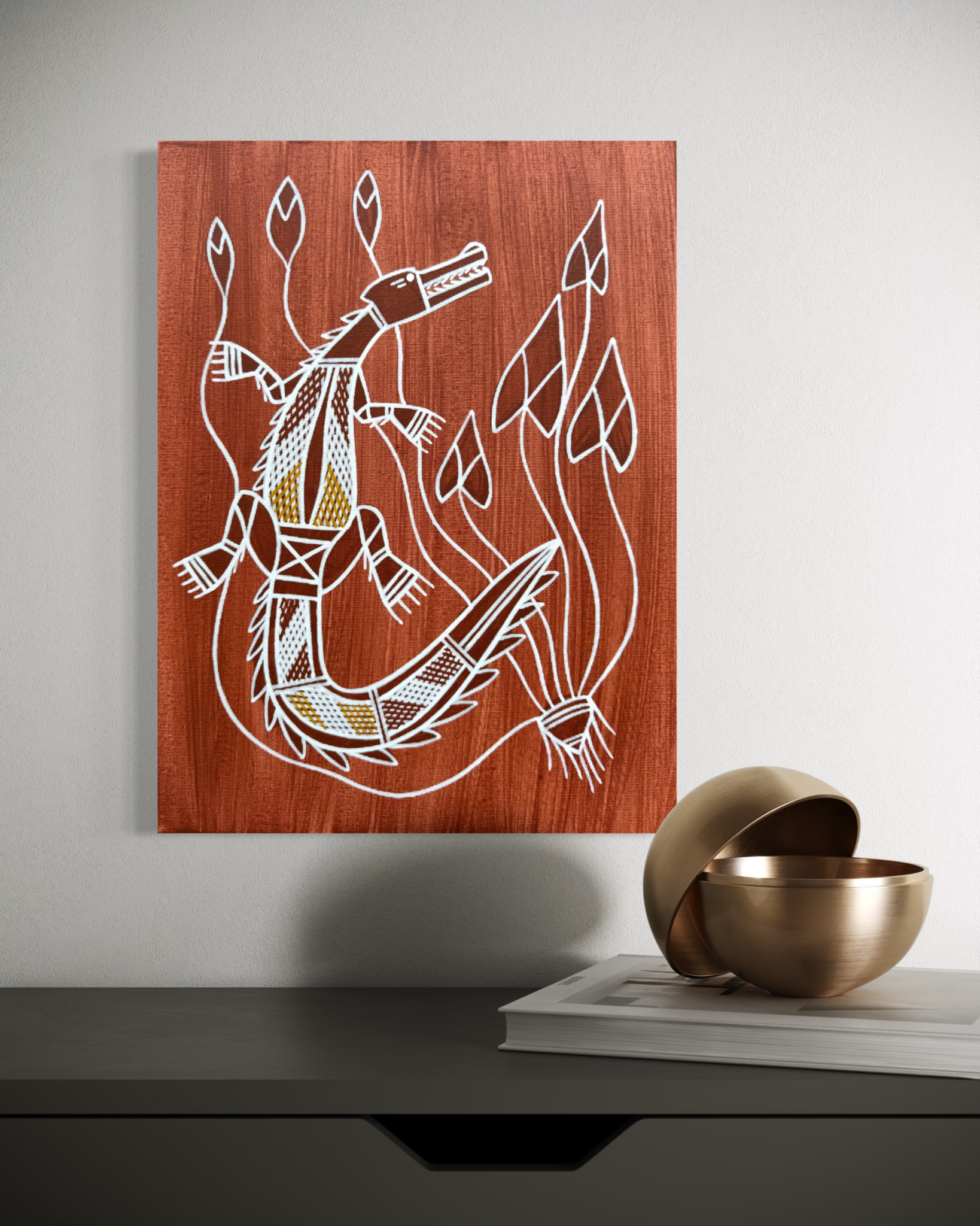 Terrence’s artwork is an extension of these stories and experiences. Each piece reflects the landscapes, ancestral narratives, and cultural knowledge that have shaped his life, offering viewers a glimpse into the living culture of West Arnhem Land. Through both his guiding and his art, Terrence plays an important role in sharing and preserving the traditions of his people for future generations.