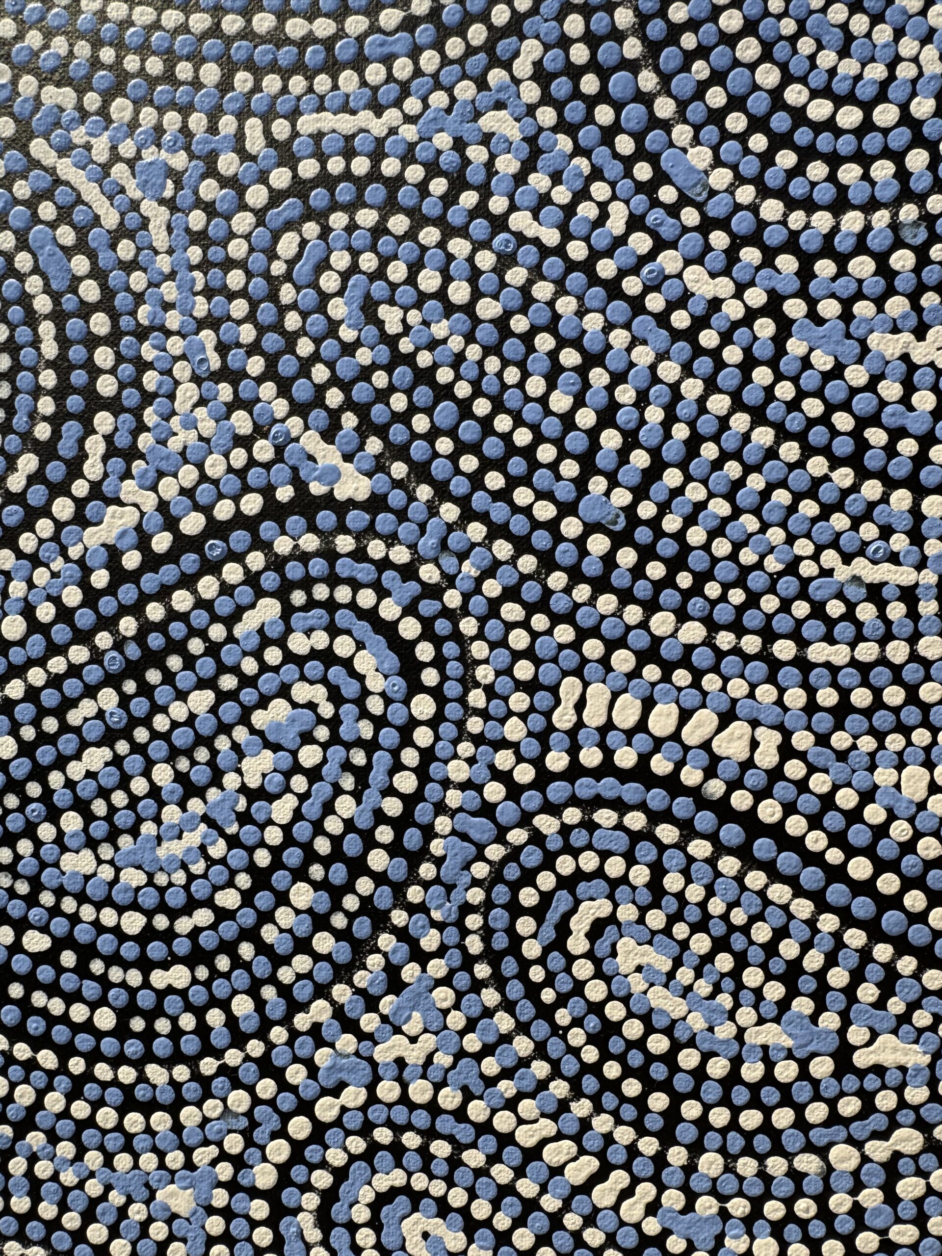 Valda’s painting style is recognisable for its rhythmic dotwork, subtle tonal movement, and gentle sense of flow. While her compositions may appear abstract to the untrained eye, every shape, line and pattern represents specific elements of Country: waterholes, desert blooms, ceremonial pathways, sandhills and the tracks of ancestral beings moving across the land.