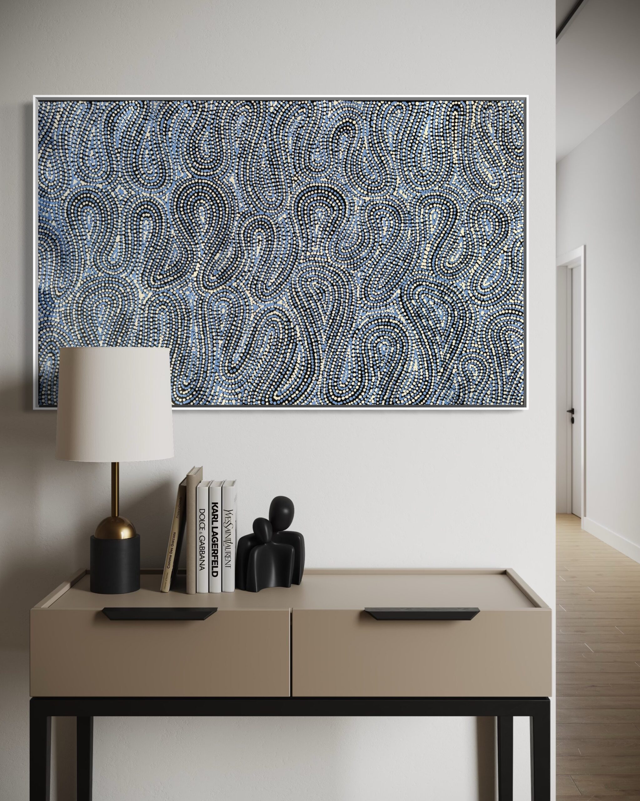 Growing up in Yuendumu, Valda was immersed in her culture from childhood. She learned directly from her elders, who passed down not only their artistic techniques, but the sacred Dreaming stories, ceremonial designs and deep knowledge of Country that shape Warlpiri identity. Her works are grounded in Jukurrpa (Dreaming) – ancestral narratives that hold spiritual, cultural and geographic meaning. These stories have been taught and shared across countless generations, and Valda takes great care to ensure they are represented with respect and cultural integrity.