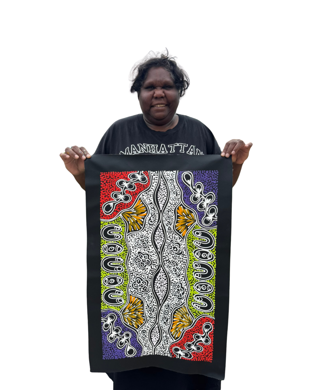 Today, Sharon lives in Darwin along with her sisters, where she continues to produce works that both honour her cultural lineage and shine as contemporary art pieces appreciated by collectors throughout Australia and internationally.