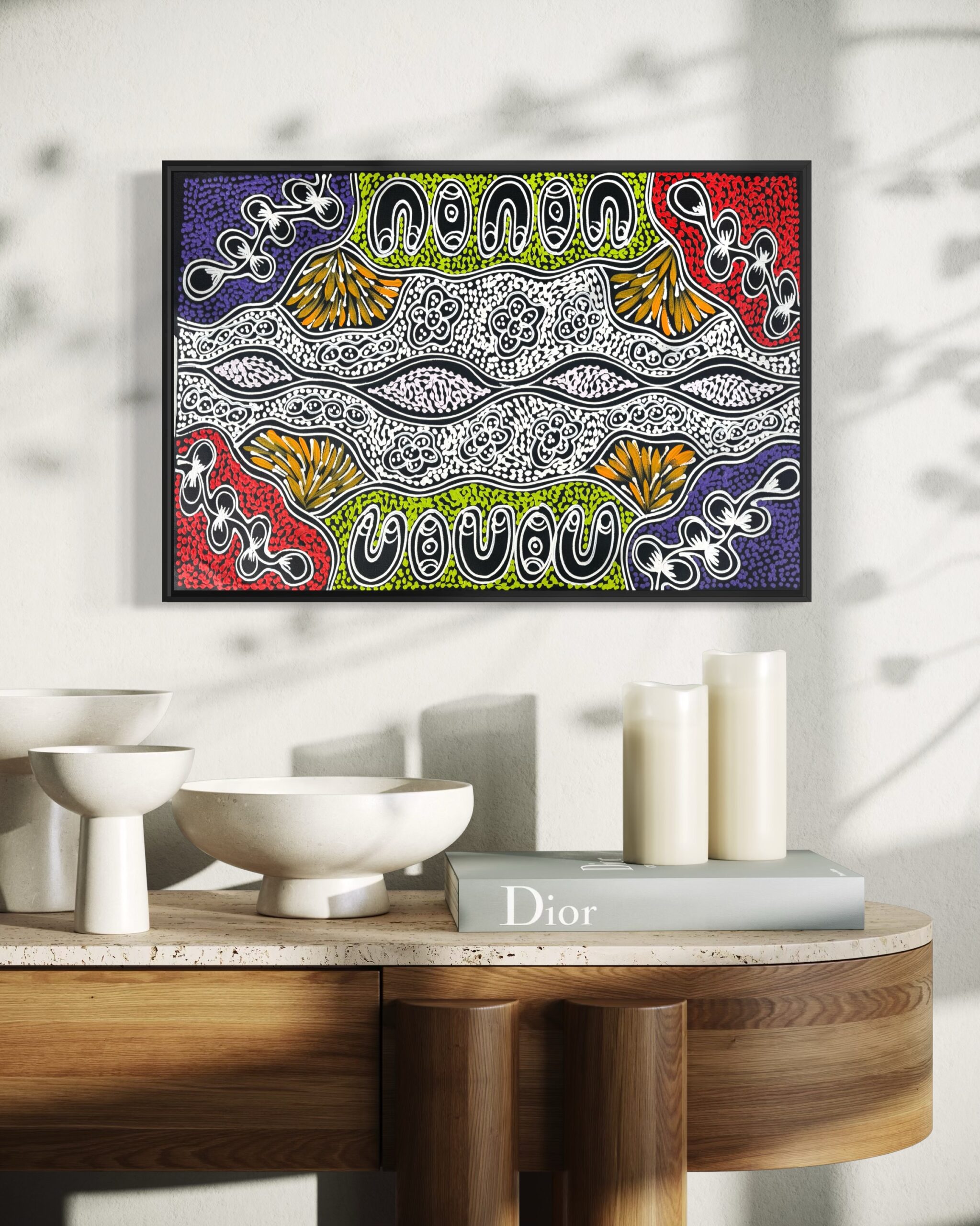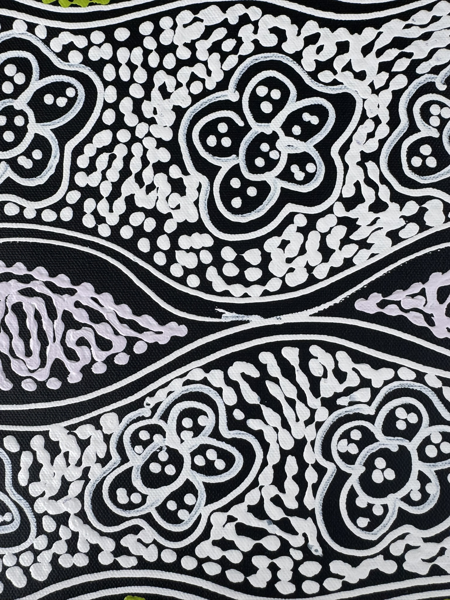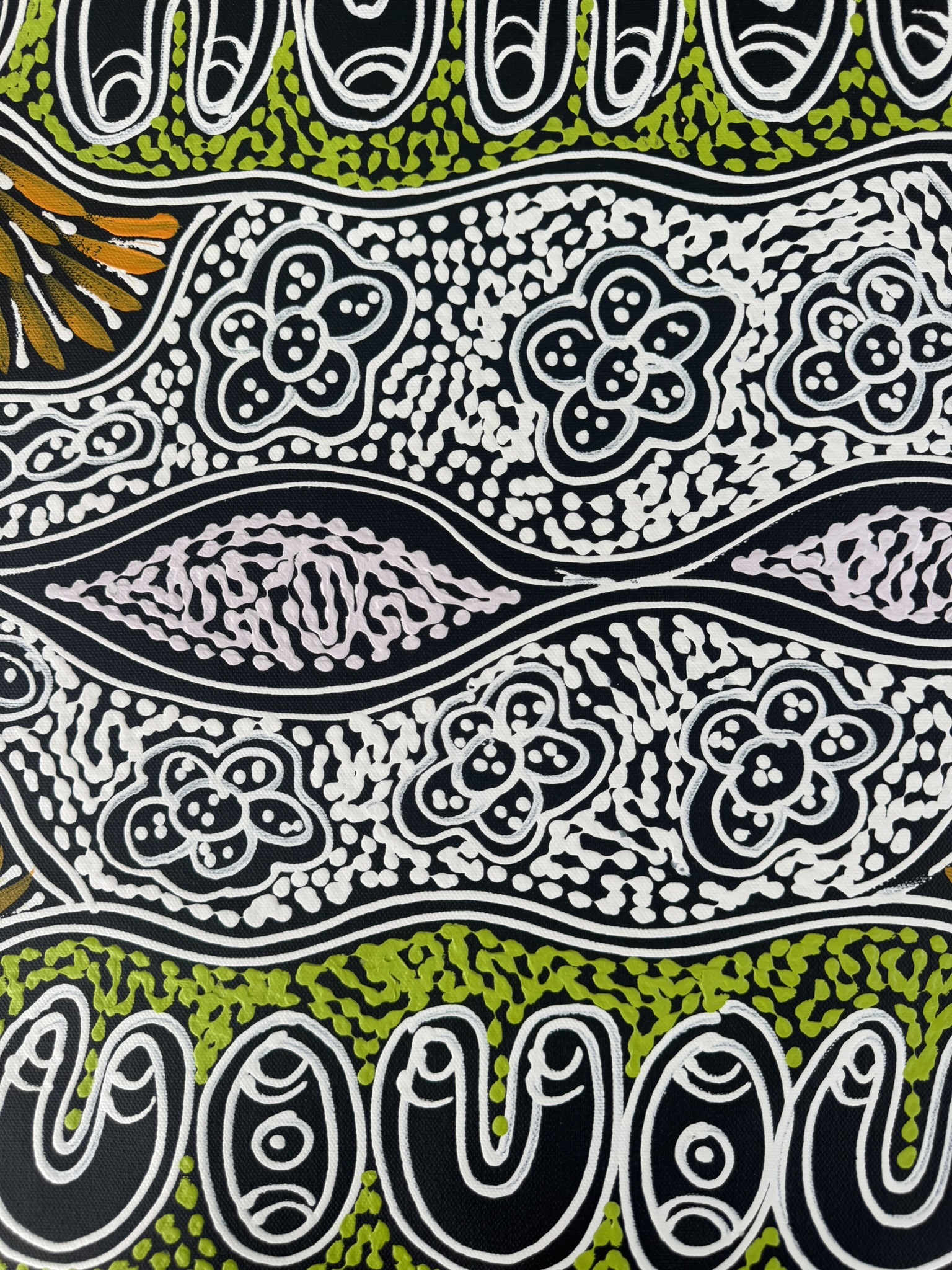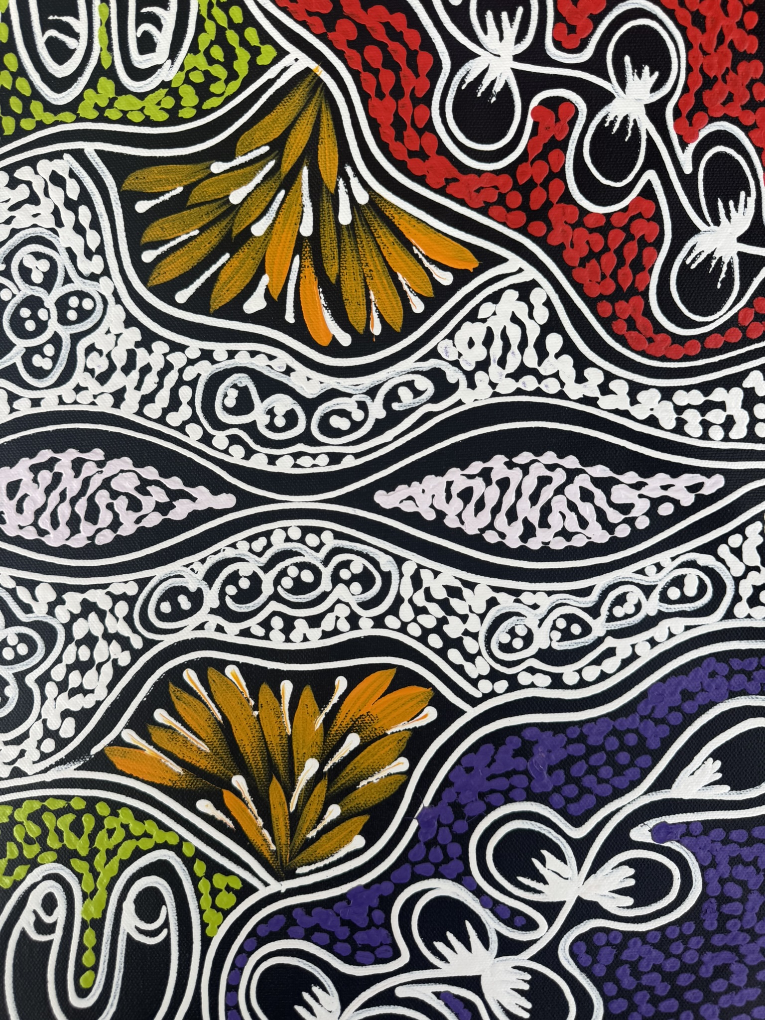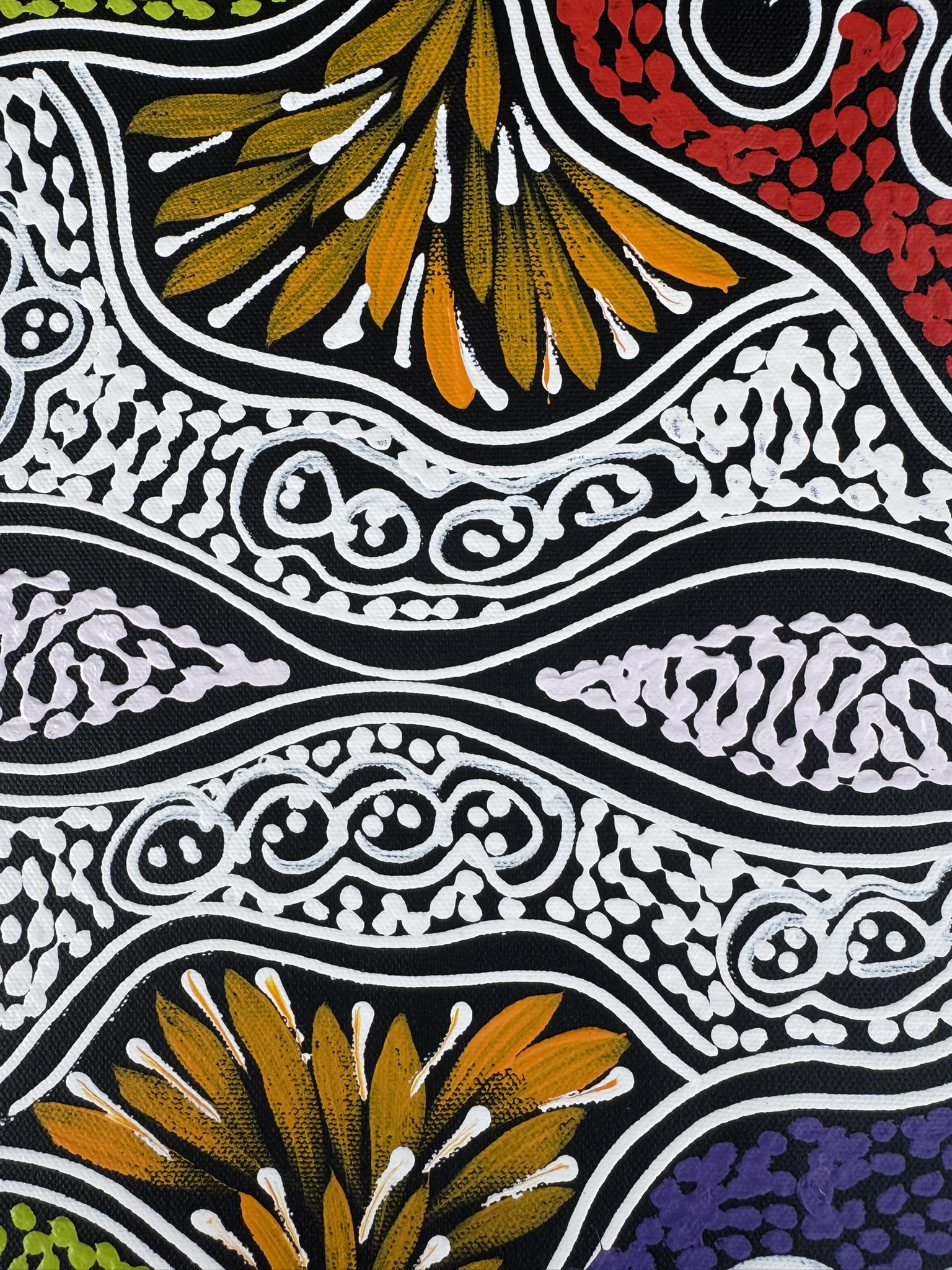 Sharon’s work focuses on themes such as bush medicine plants, bush tucker, “My Country” dreaming, emu and thorny‐lizard tracks, and women’s ceremonial body-painting designs. Through layered dots and fluid sweeping lines, she translates her cultural knowledge and connection to her ancestral landscape into vibrant acrylic on canvas works.