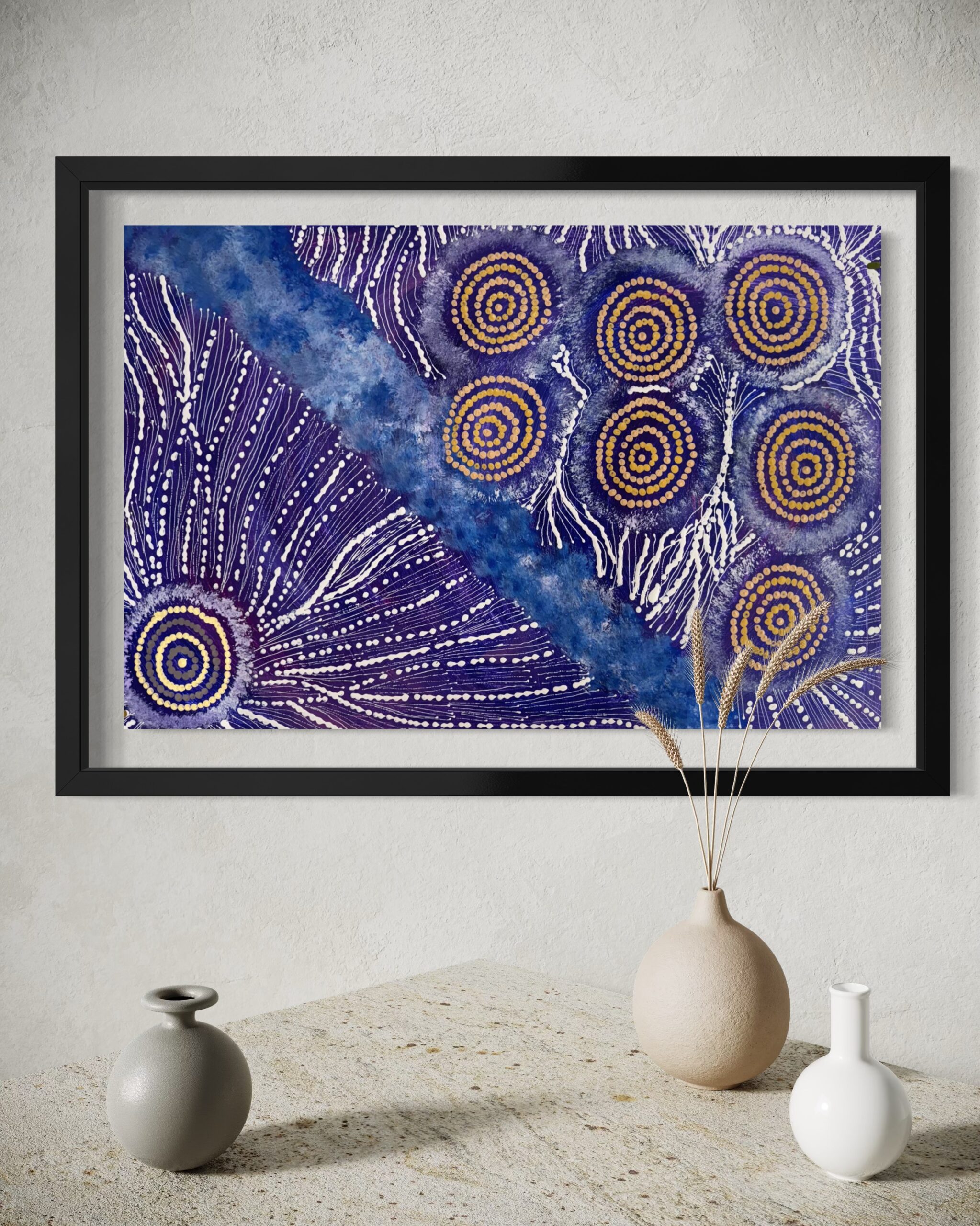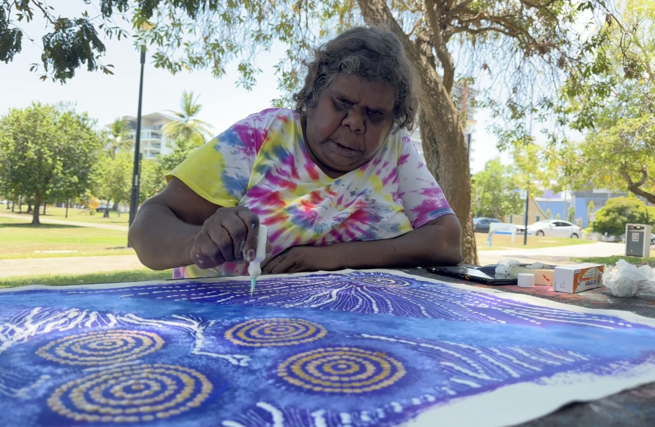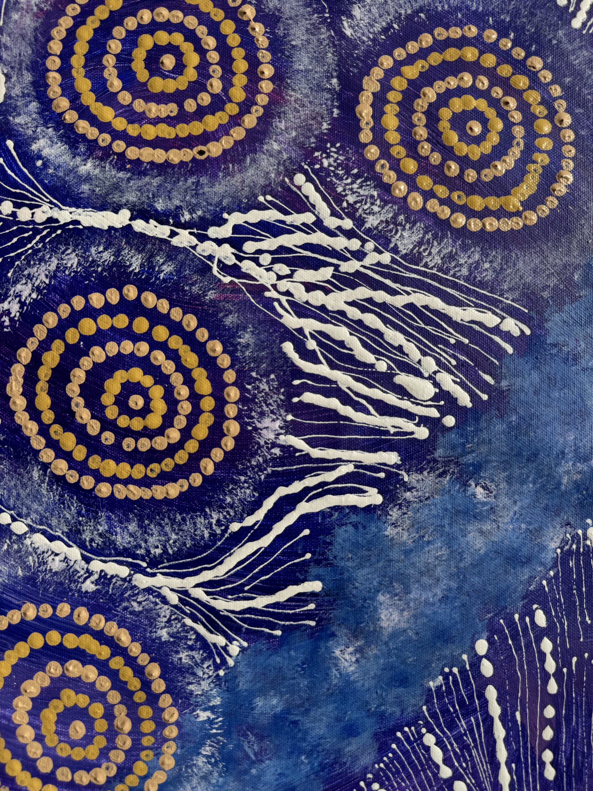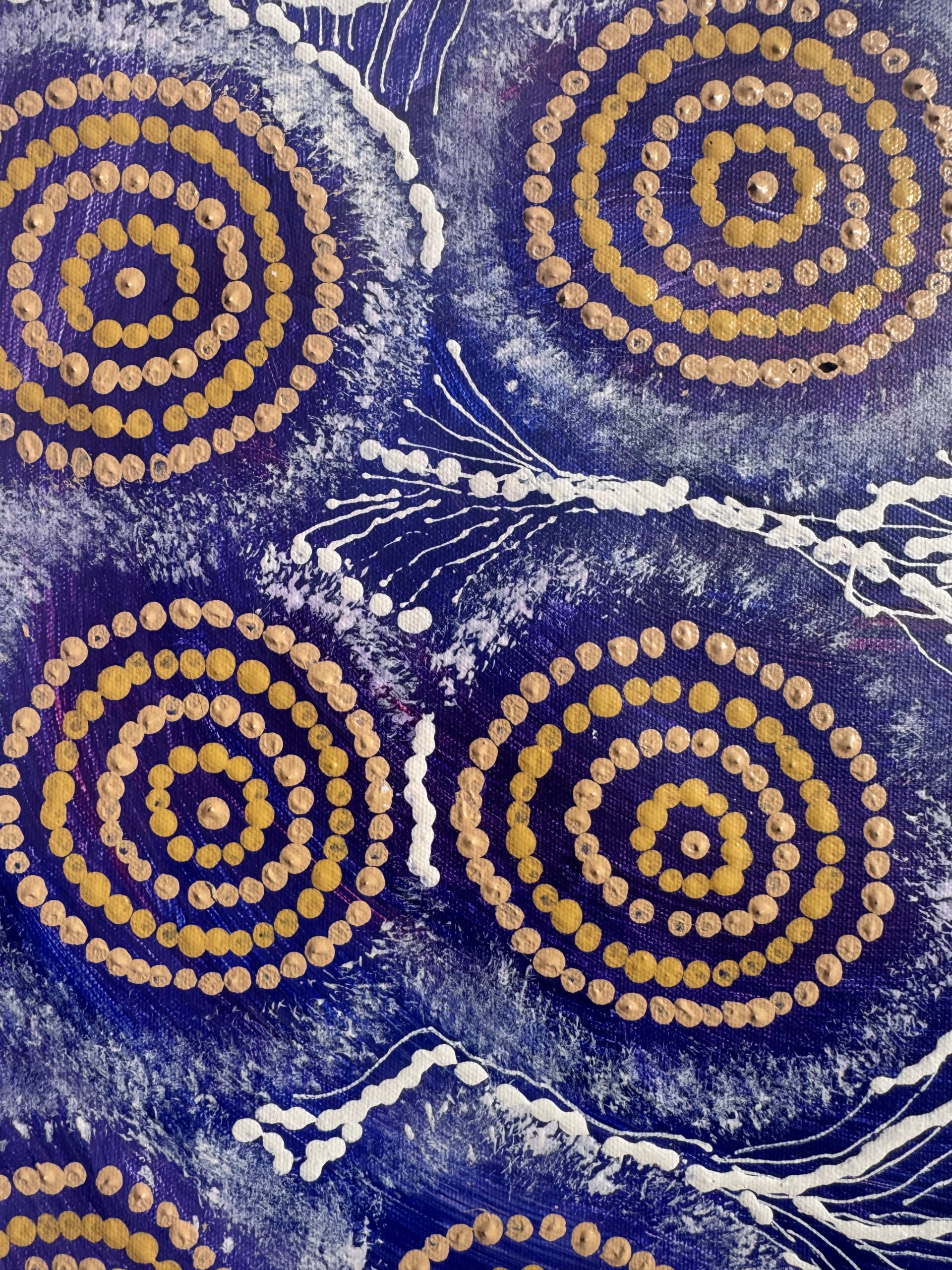 Maria’s work blends traditional iconography with her own modern style, bringing her cultural heritage to life. When she’s not painting, you can find her sharing stories with her grandchildren, hunting for honey ants during the rain, or collecting firewood to cook kangaroo tails. Her life and art are beautifully intertwined, reflecting the rich tapestry of her heritage and the stories she cherishes.