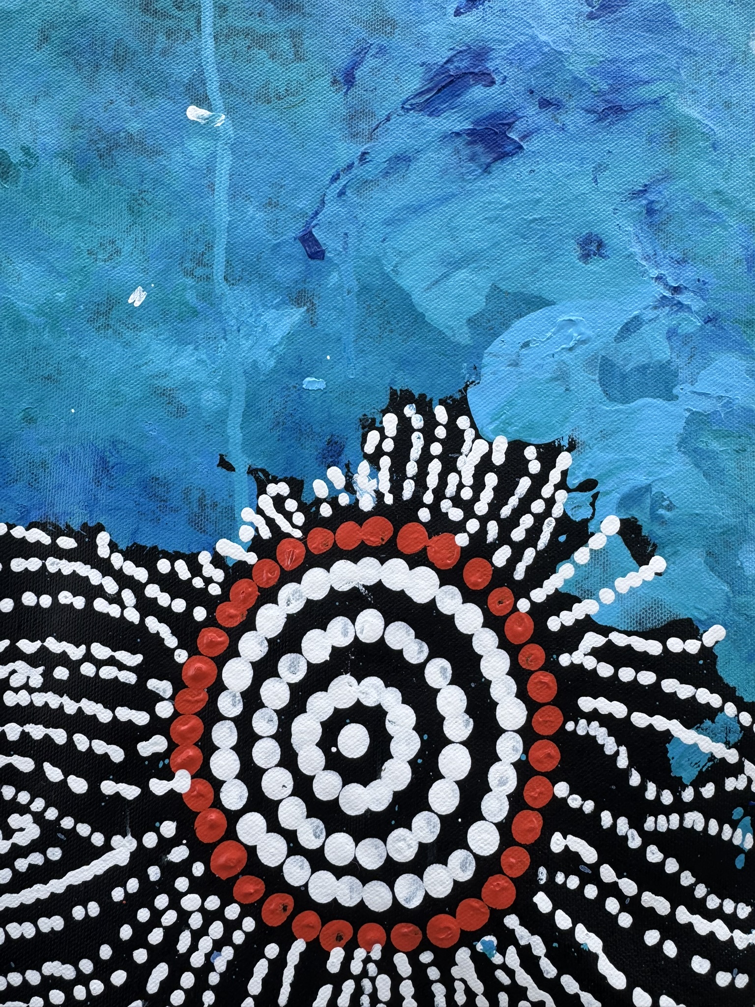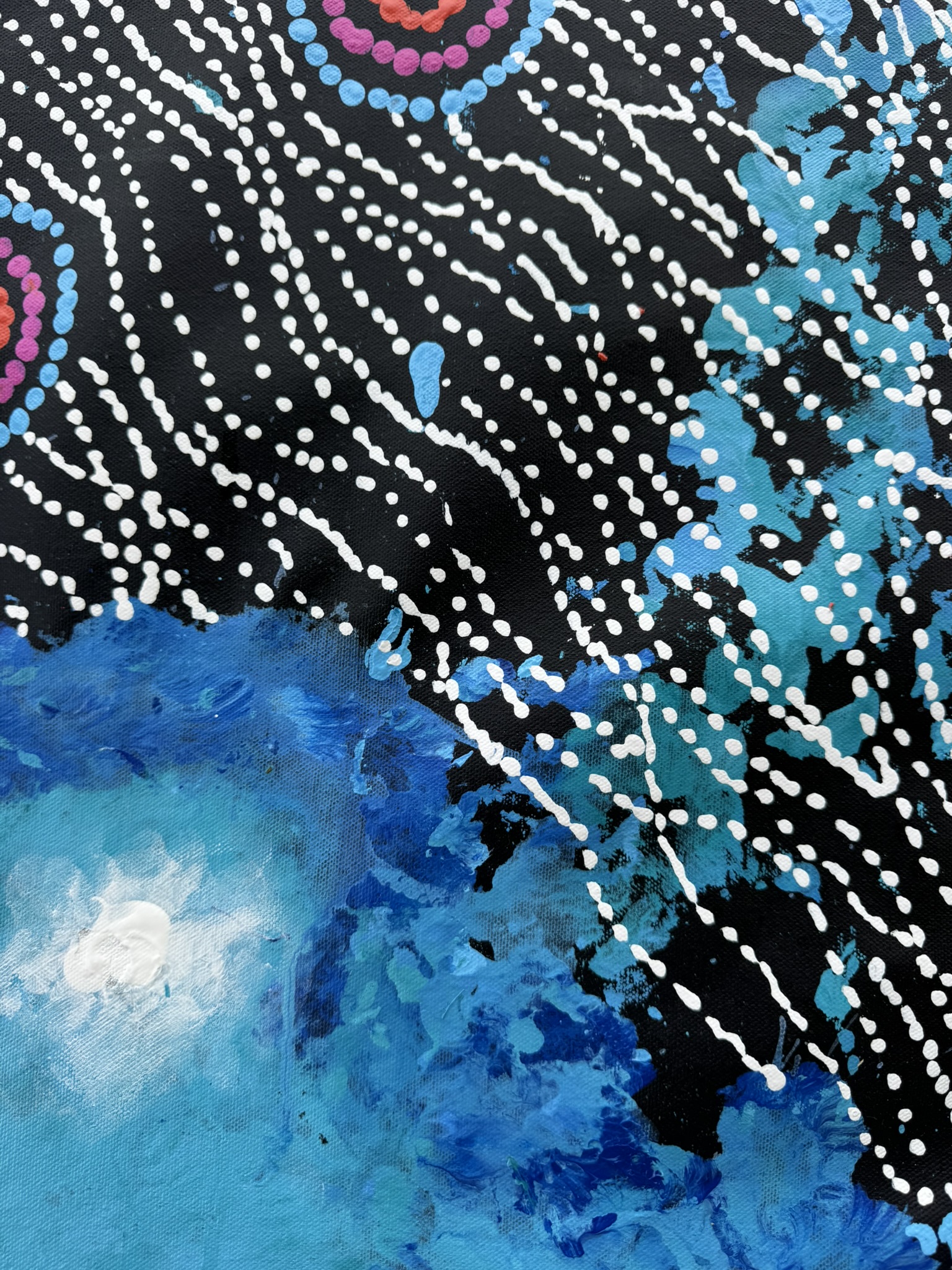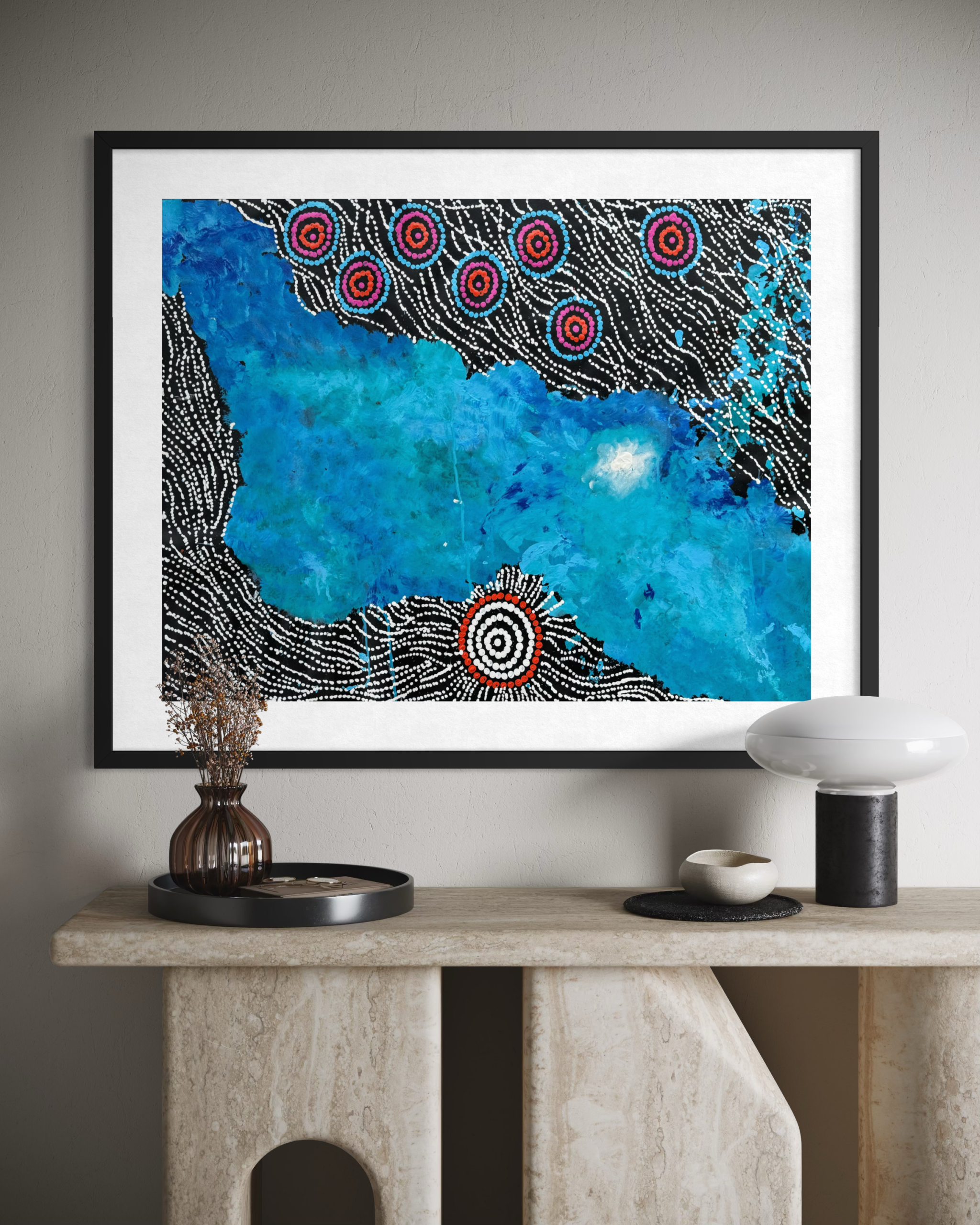 Seven Sisters Dreaming is a powerful Aboriginal artwork telling the ancestral story of the Seven Sisters as they travel across Country, shaping the land, sky, and sacred sites. Depicted through intricate dot work and symbolic pathways, the painting represents movement, protection, and the deep cultural knowledge passed down through generations.