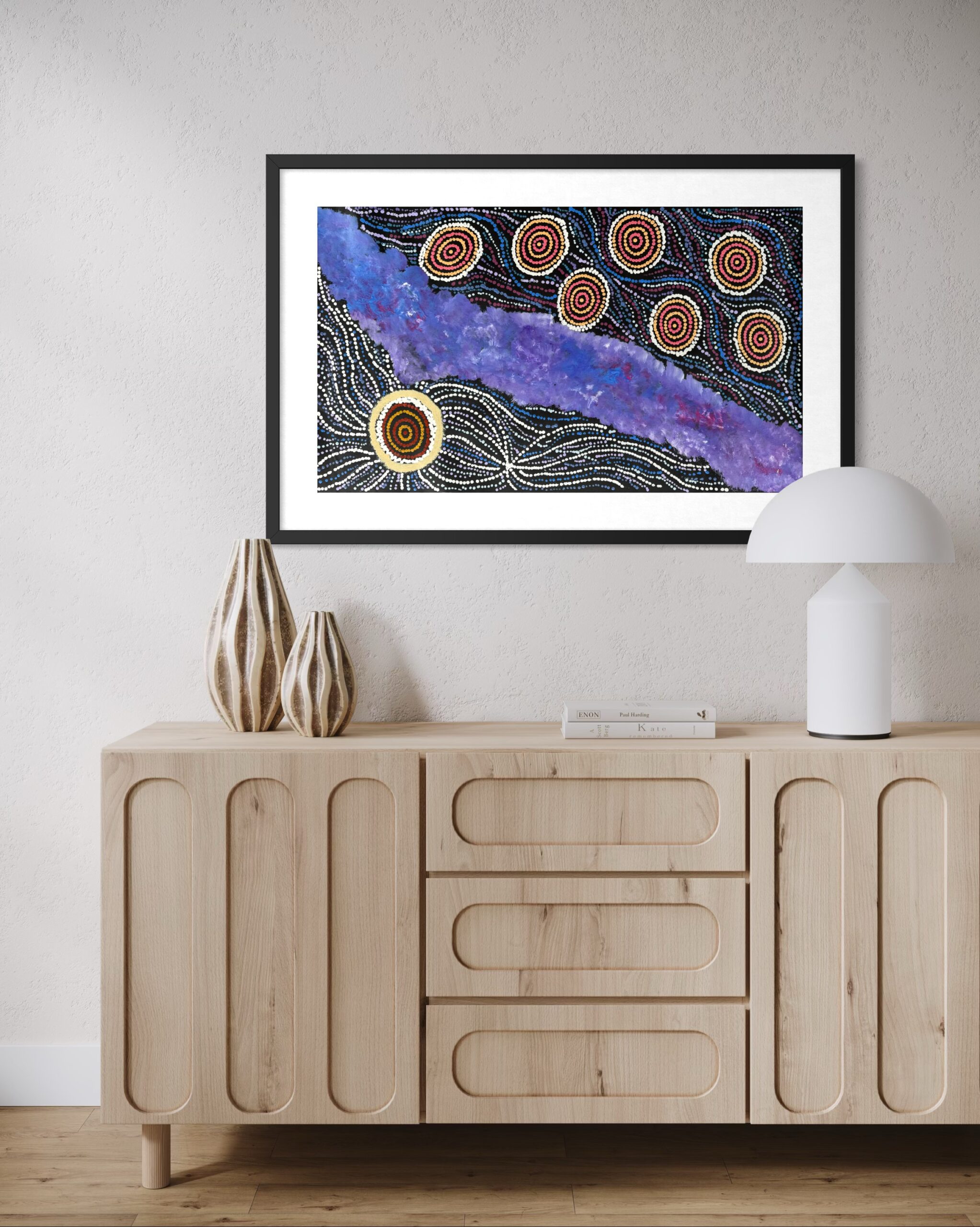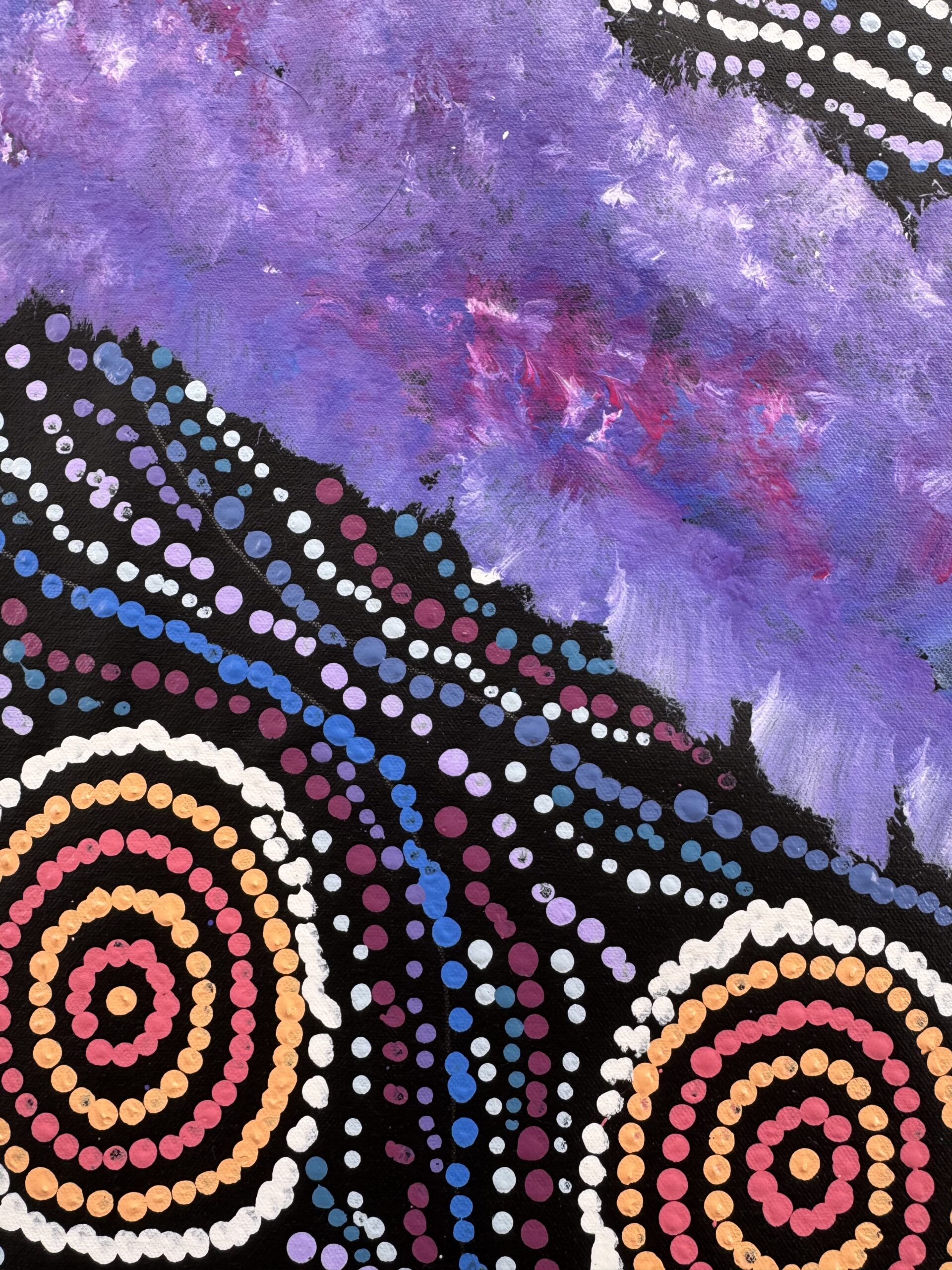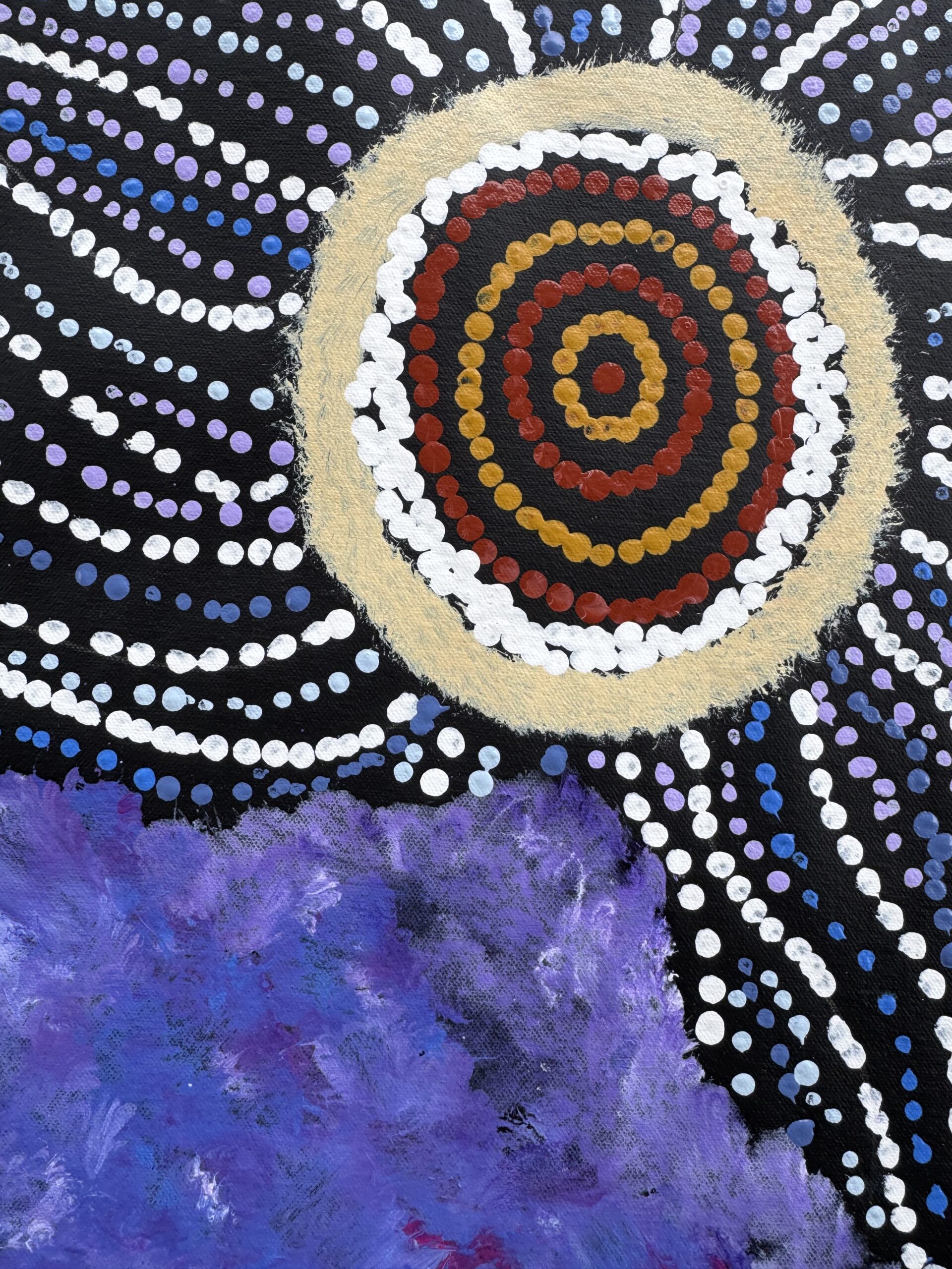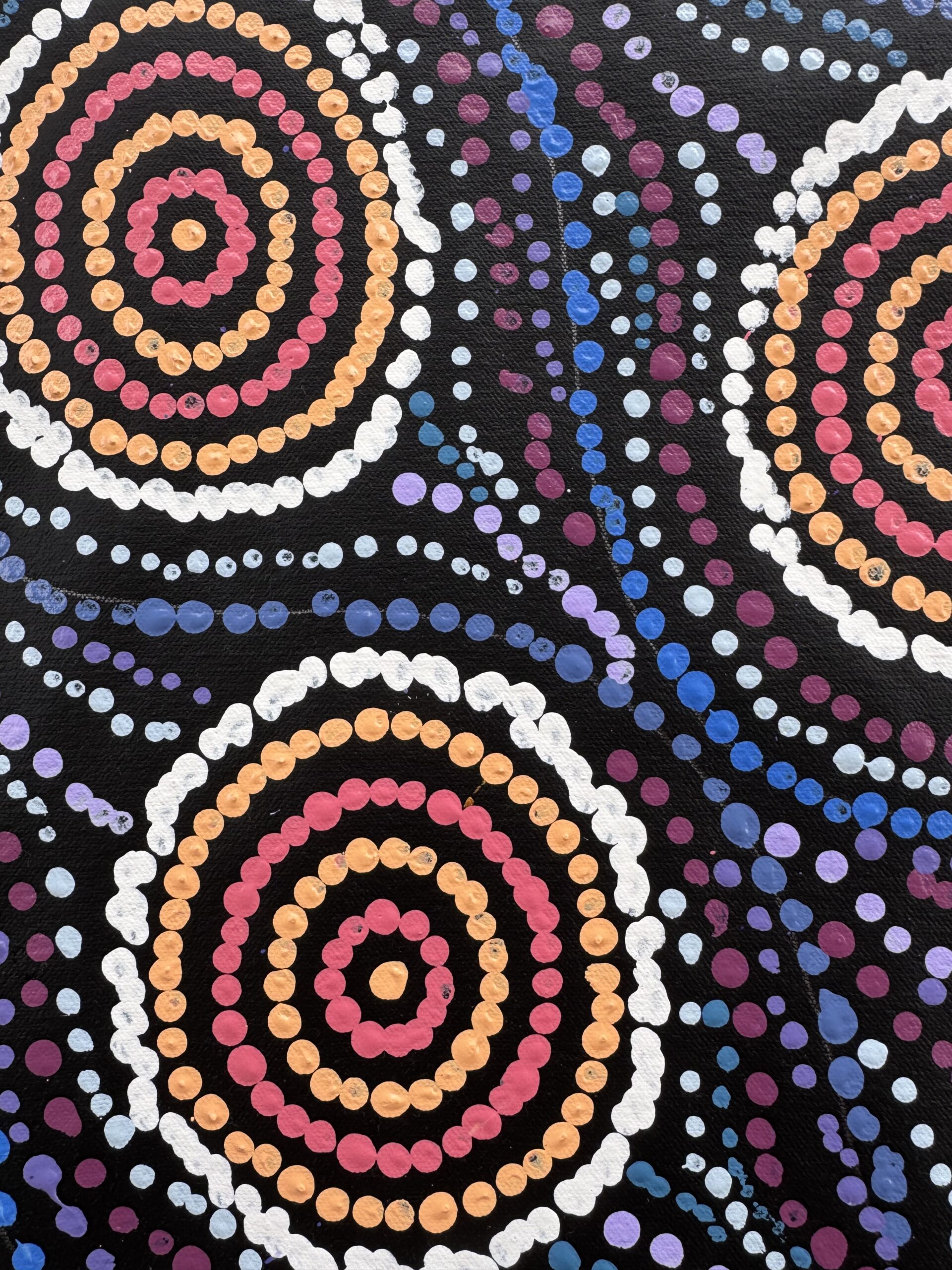 Seven Sisters Dreaming is a powerful Aboriginal artwork telling the ancestral story of the Seven Sisters as they travel across Country, shaping the land, sky, and sacred sites. Depicted through intricate dot work and symbolic pathways, the painting represents movement, protection, and the deep cultural knowledge passed down through generations.
