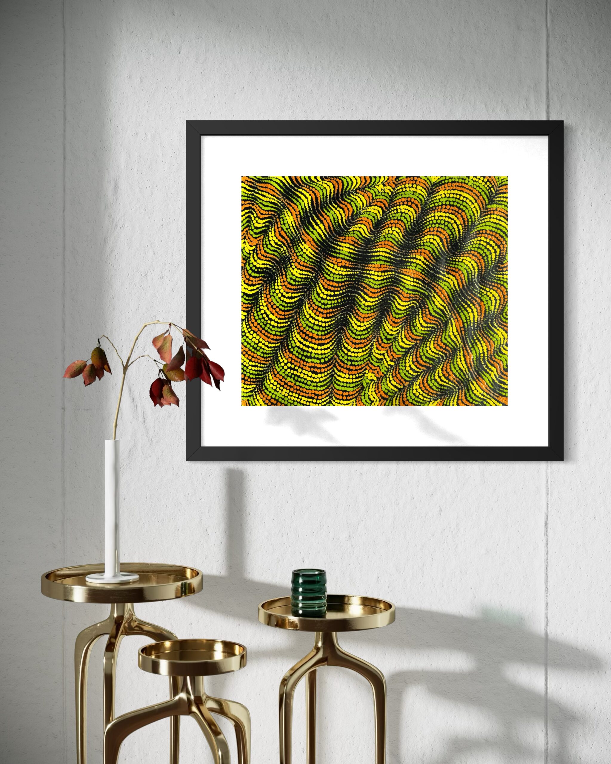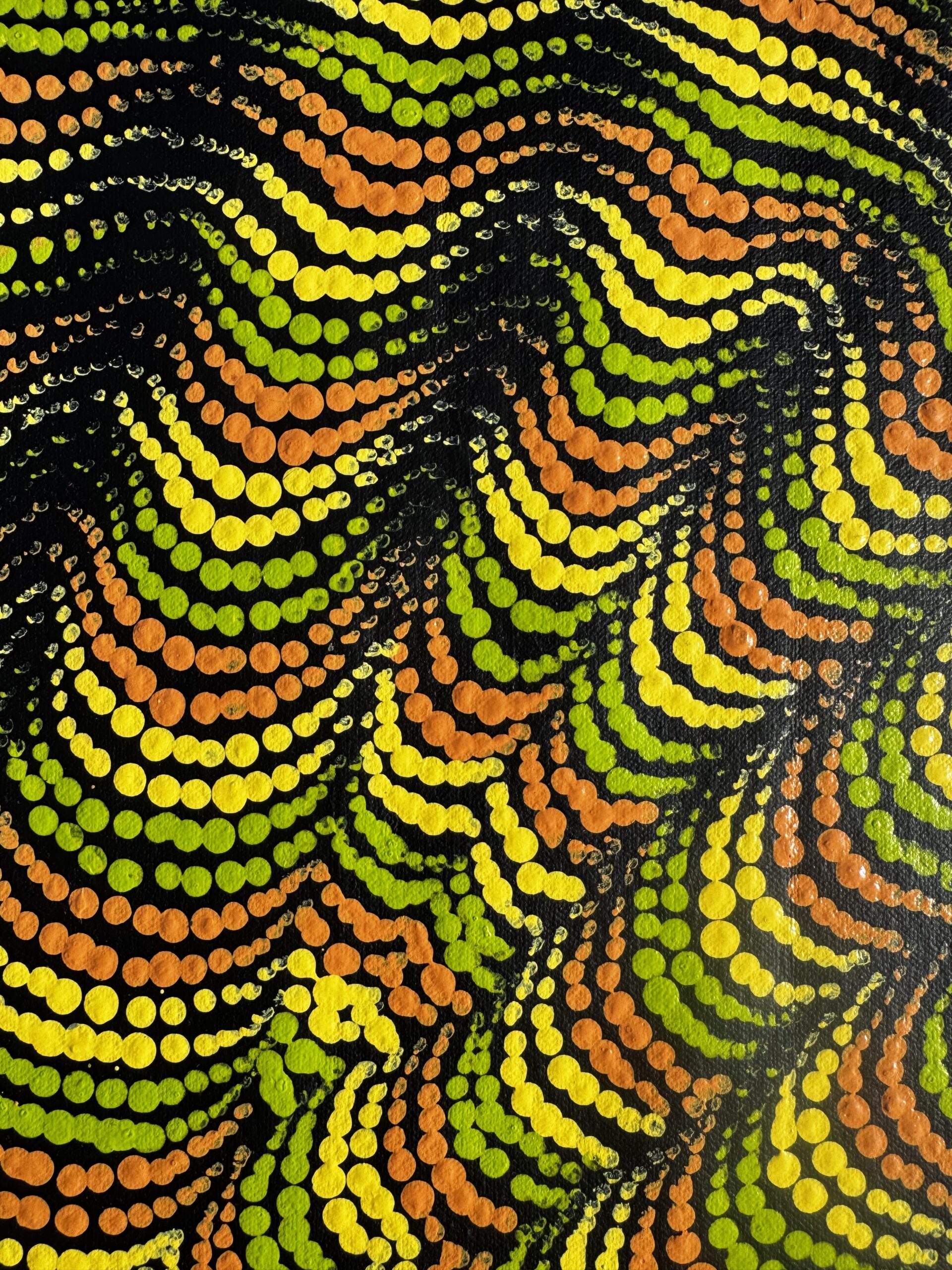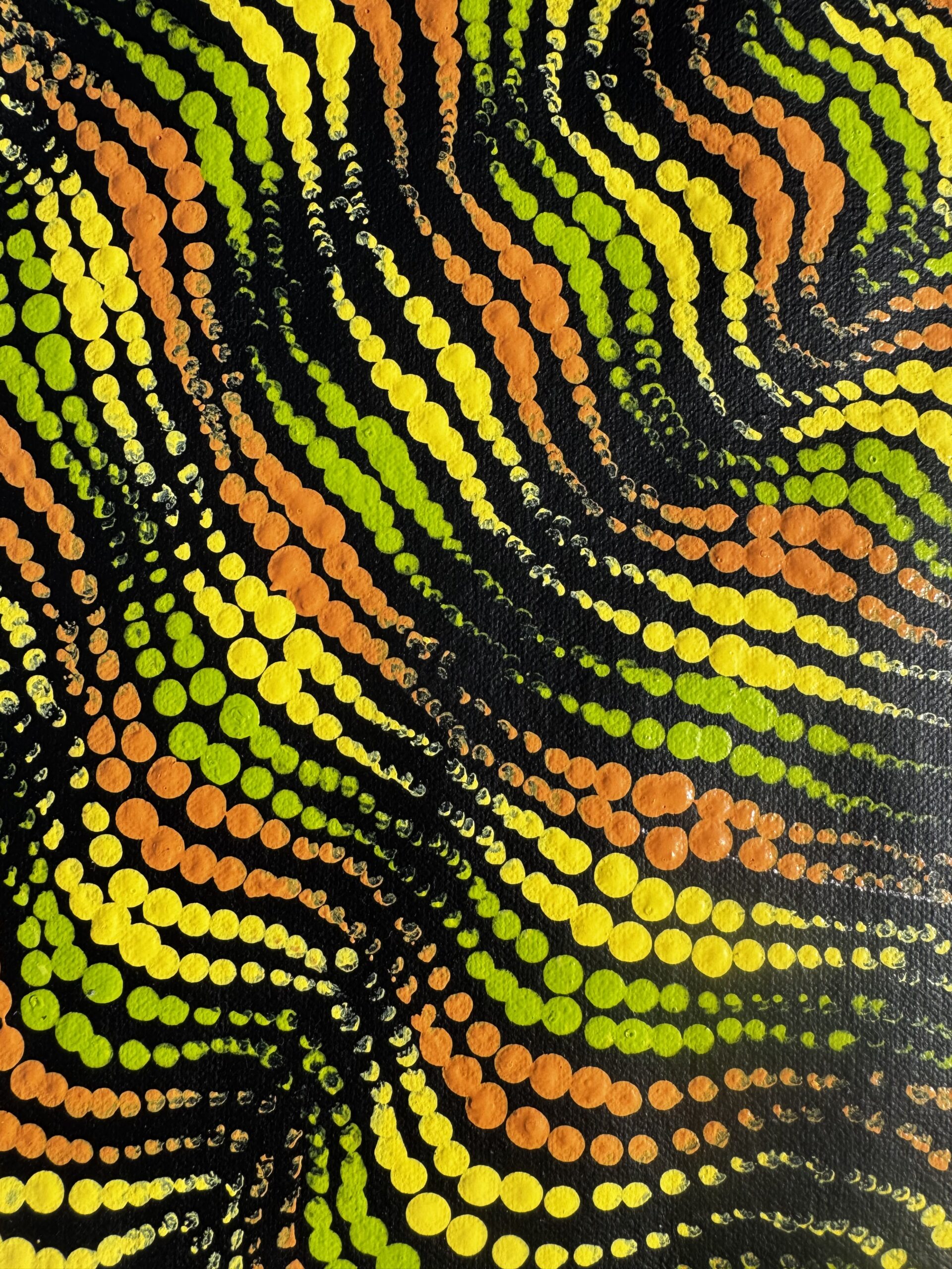 Tali refers to the sand hills that shape the desert landscape, formed and re-formed by wind, time, and ancestral movement. This painting tells the story of Country in constant motion, where the land holds memory, songlines, and the traces of those who have travelled across it for generations.