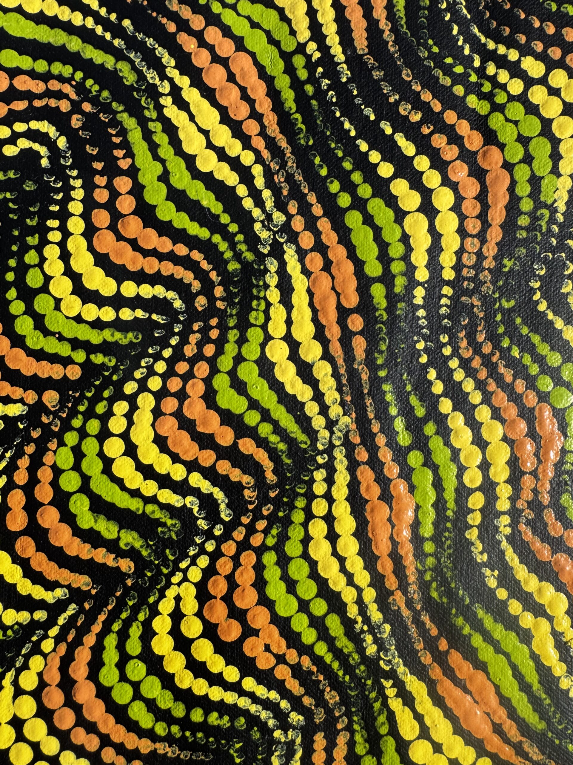 This artwork honours the strength of the desert landscape and the enduring relationship between people, land, and Dreaming, reminding us that even in harsh environments, Country sustains life, culture, and story.