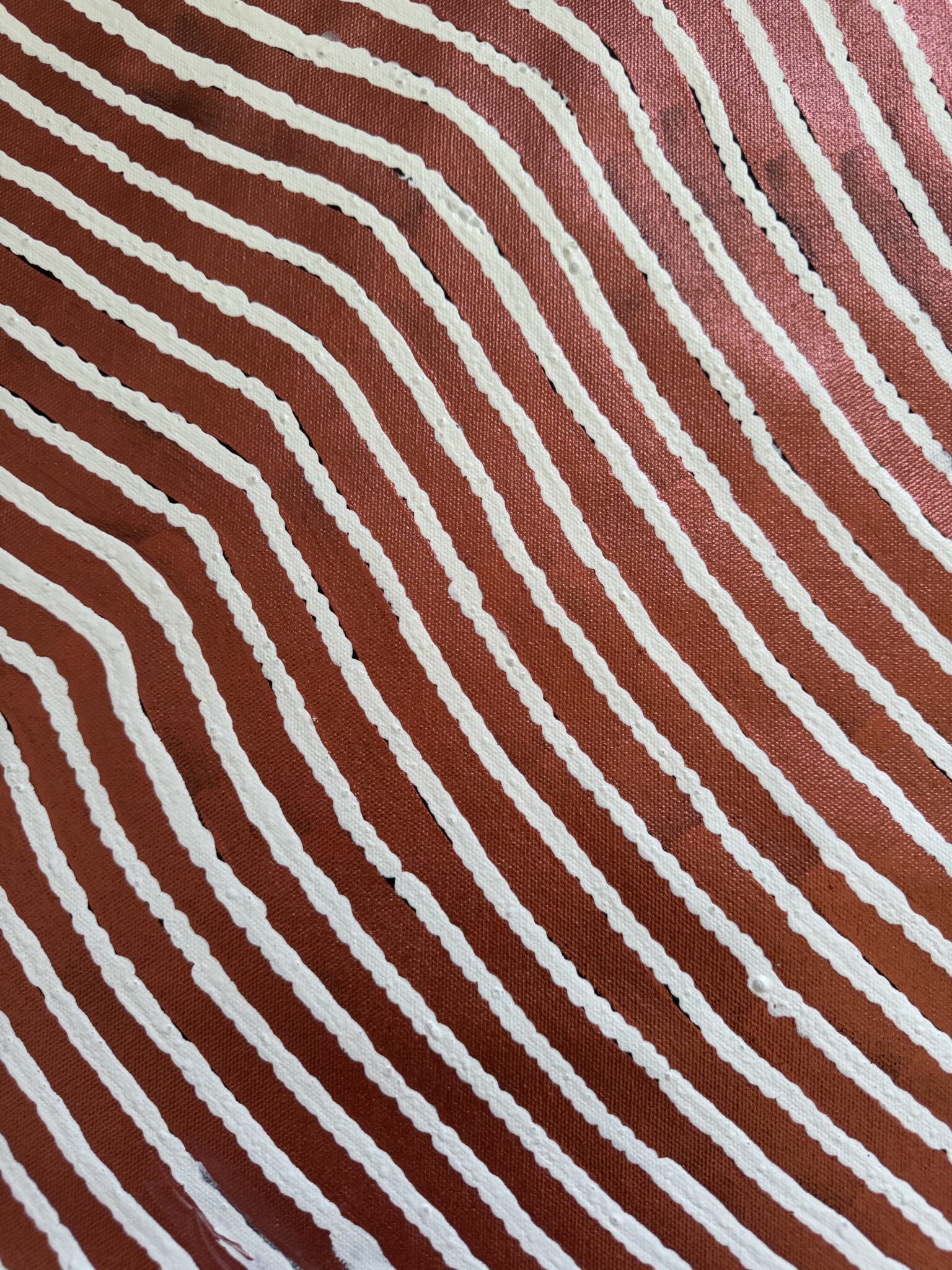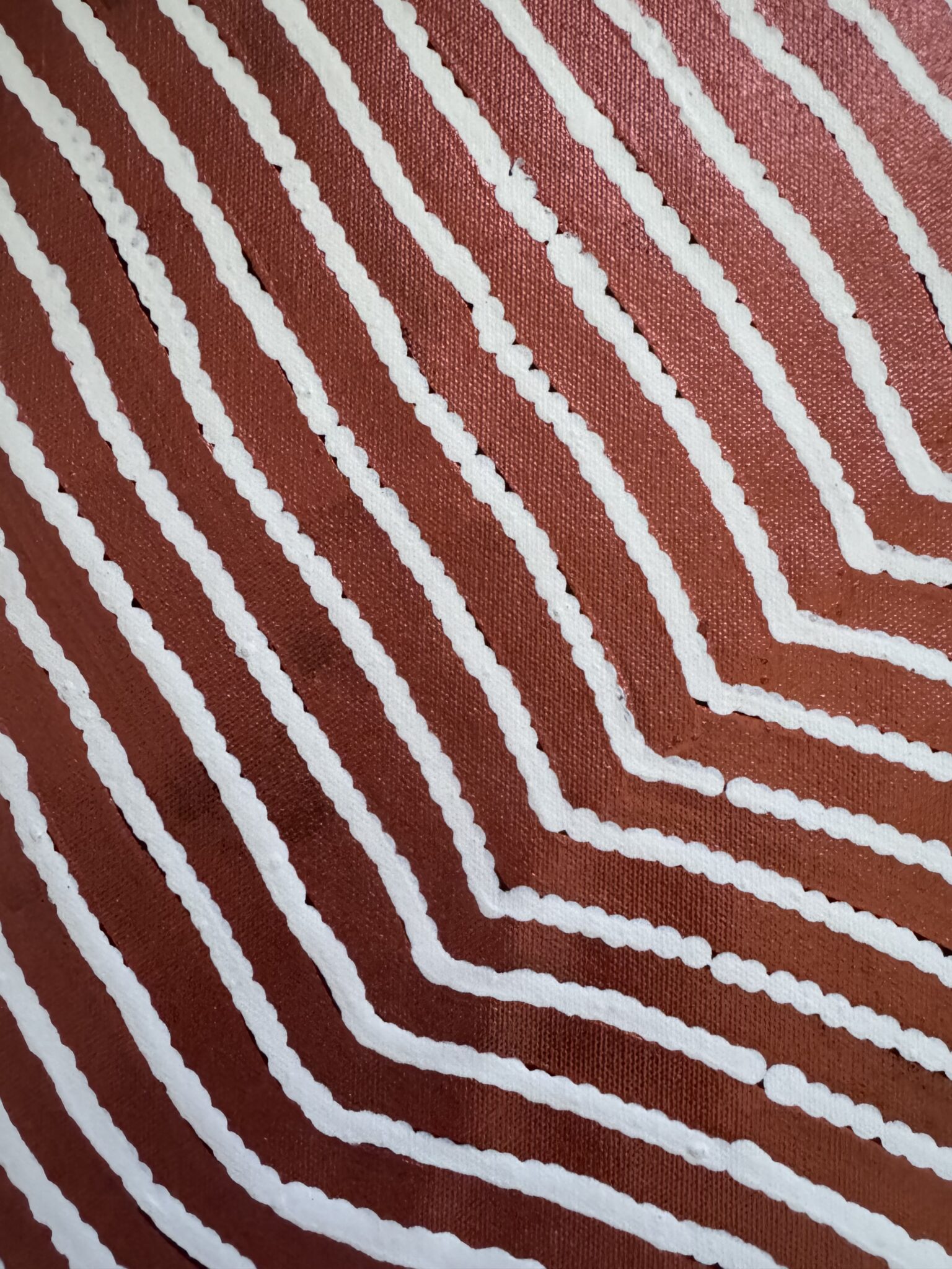 Using rhythmic patterns, flowing lines and layered dot work, Sharon represents the undulating dunes as they rise and fall across the land. These sand hills are not only physical landmarks but also hold deep cultural knowledge. They are pathways through Country, places where bush foods can be found, and where important Dreaming stories are remembered and passed down through generations.