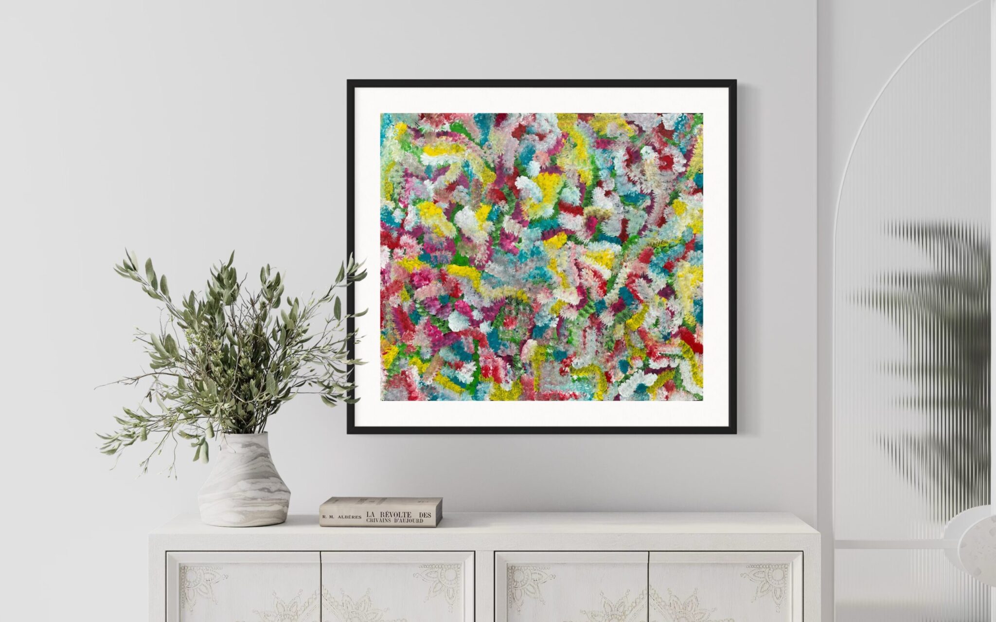 This painting tells the story of bush medicine — the traditional knowledge of healing plants, leaves, roots, and bark that has been passed down through generations. Bush medicine is central to life on Country, used to treat sickness, cleanse the body, protect spirit, and maintain balance between people and the land.
