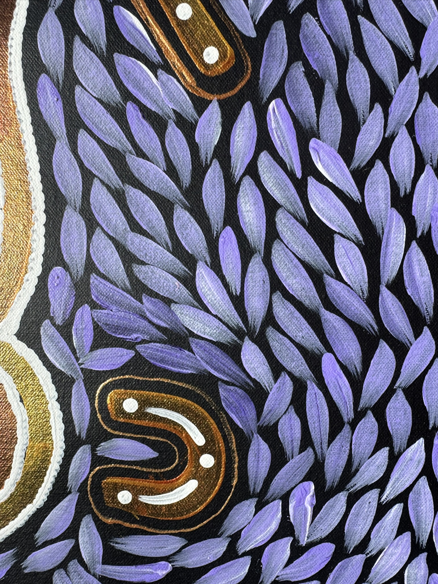 This painting tells the story of bush medicine — the traditional knowledge of healing plants, leaves, roots, and bark that has been passed down through generations. Bush medicine is central to life on Country, used to treat sickness, cleanse the body, protect spirit, and maintain balance between people and the land.