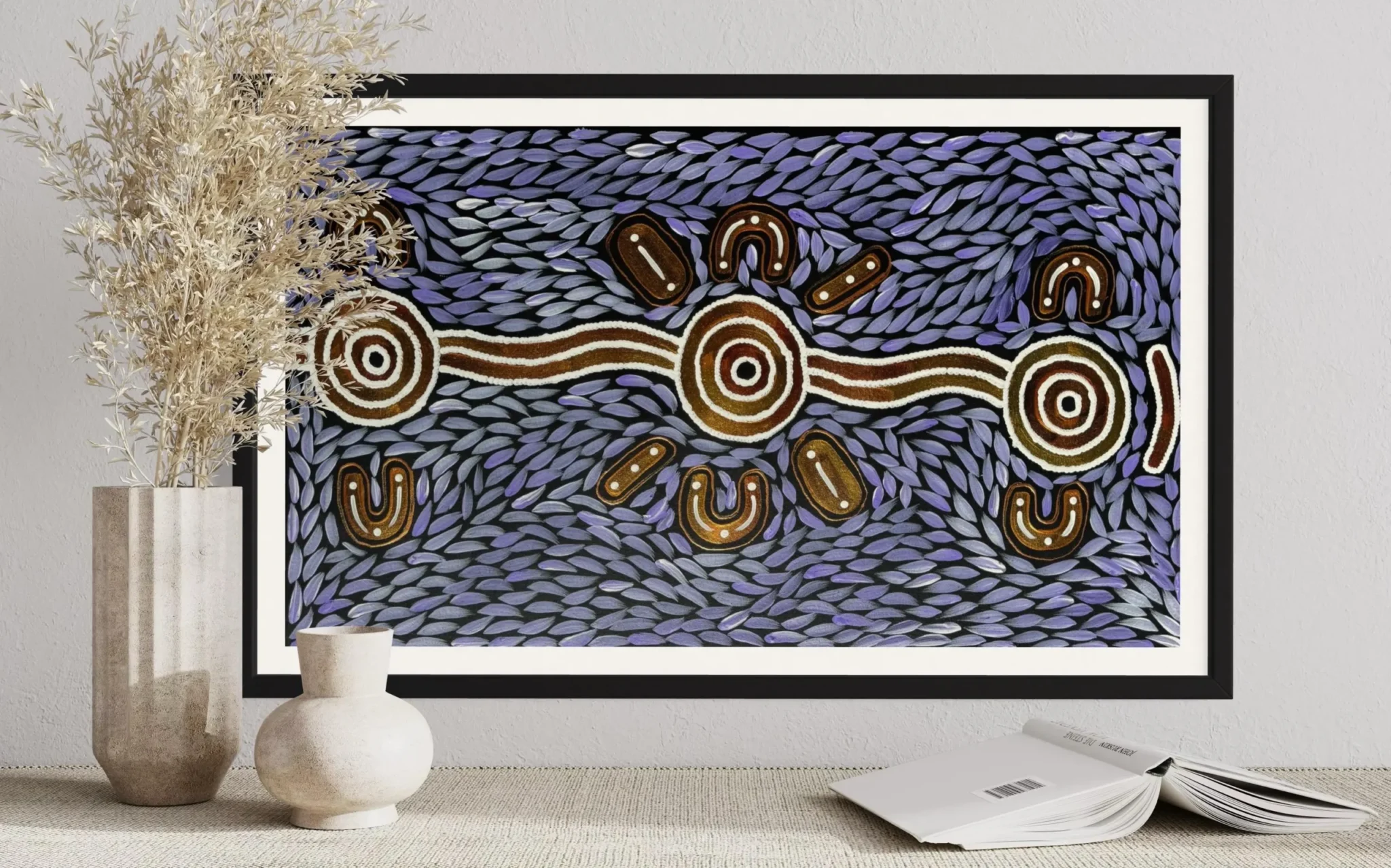 Sharon’s paintings vividly depict the waterholes, creeks, and sand hills surrounding Papunya. She is particularly renowned for her Kapi Tjukurrpa (Water Dreaming) works, which illustrate the elements of a storm—wind, rain, thunderclouds, and lightning. The lines in her pieces symbolize rain and the flow of water from the waterholes, often flooding the normally dry creek beds.