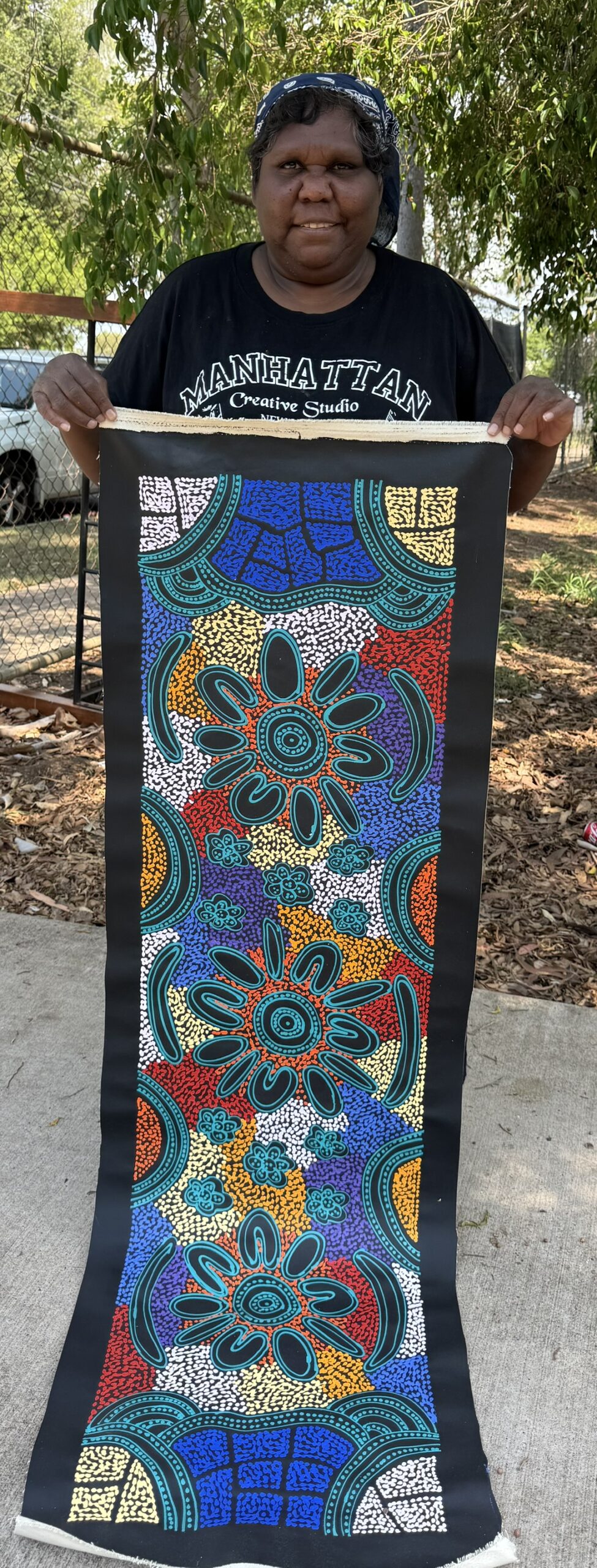 Today, Sharon lives in Darwin along with her sisters, where she continues to produce works that both honour her cultural lineage and shine as contemporary art pieces appreciated by collectors throughout Australia and internationally.