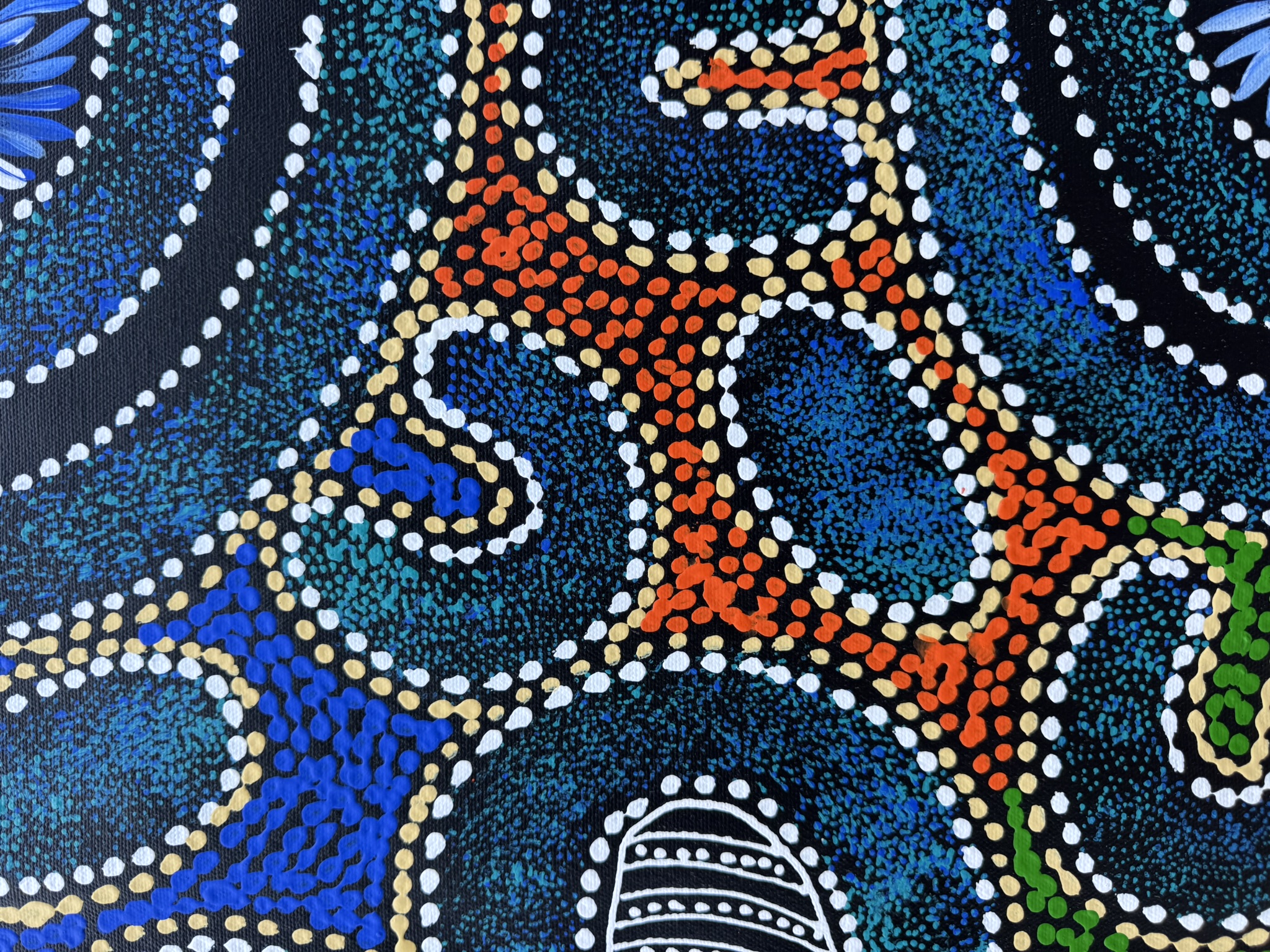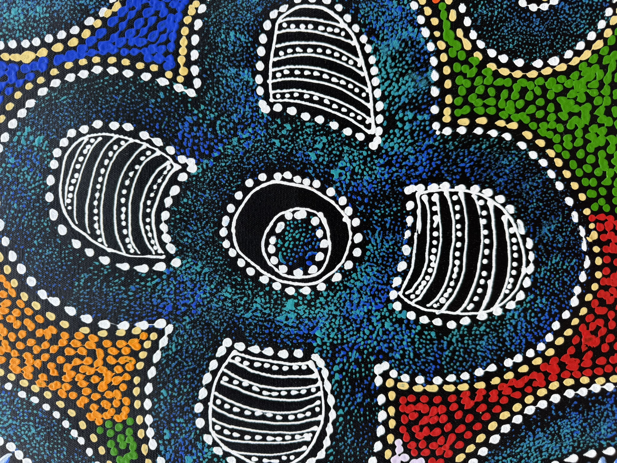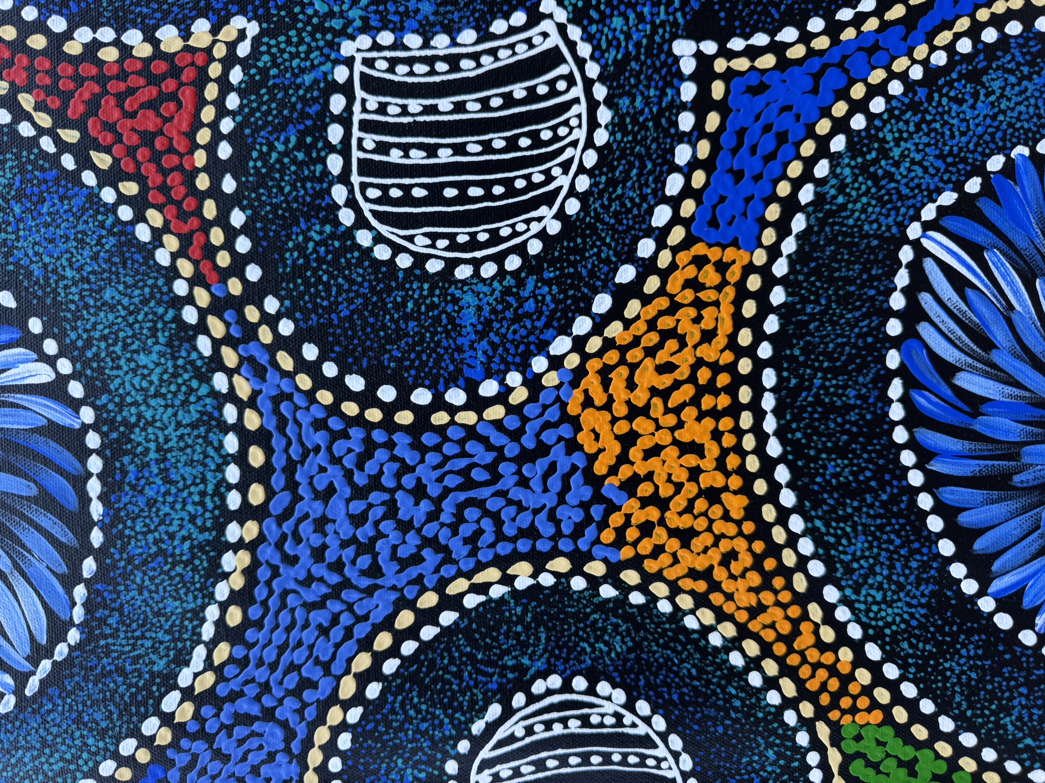 Sharon’s work focuses on themes such as bush medicine plants, bush tucker, “My Country” dreaming, emu and thorny‐lizard tracks, and women’s ceremonial body-painting designs. Through layered dots and fluid sweeping lines, she translates her cultural knowledge and connection to her ancestral landscape into vibrant acrylic on canvas works.