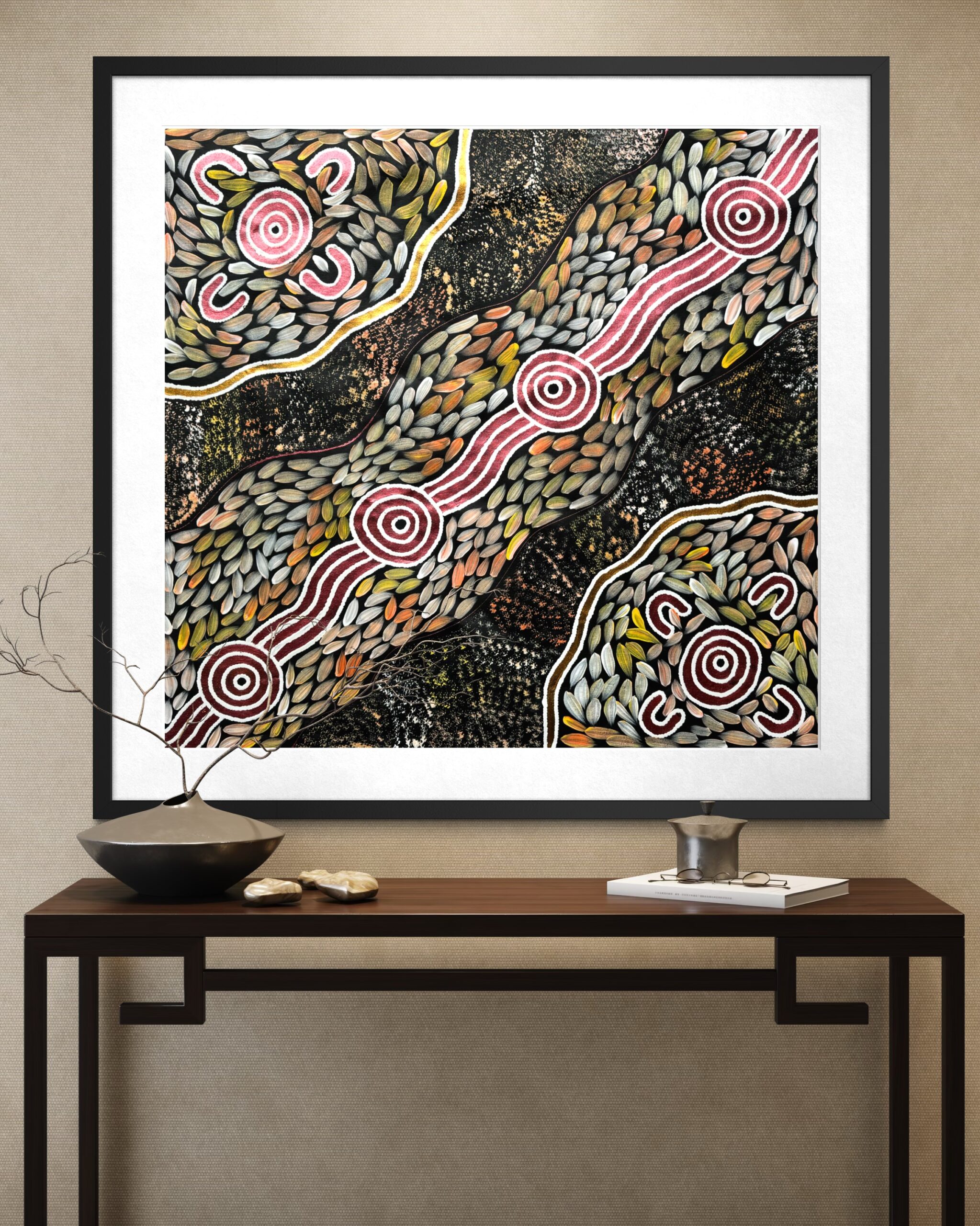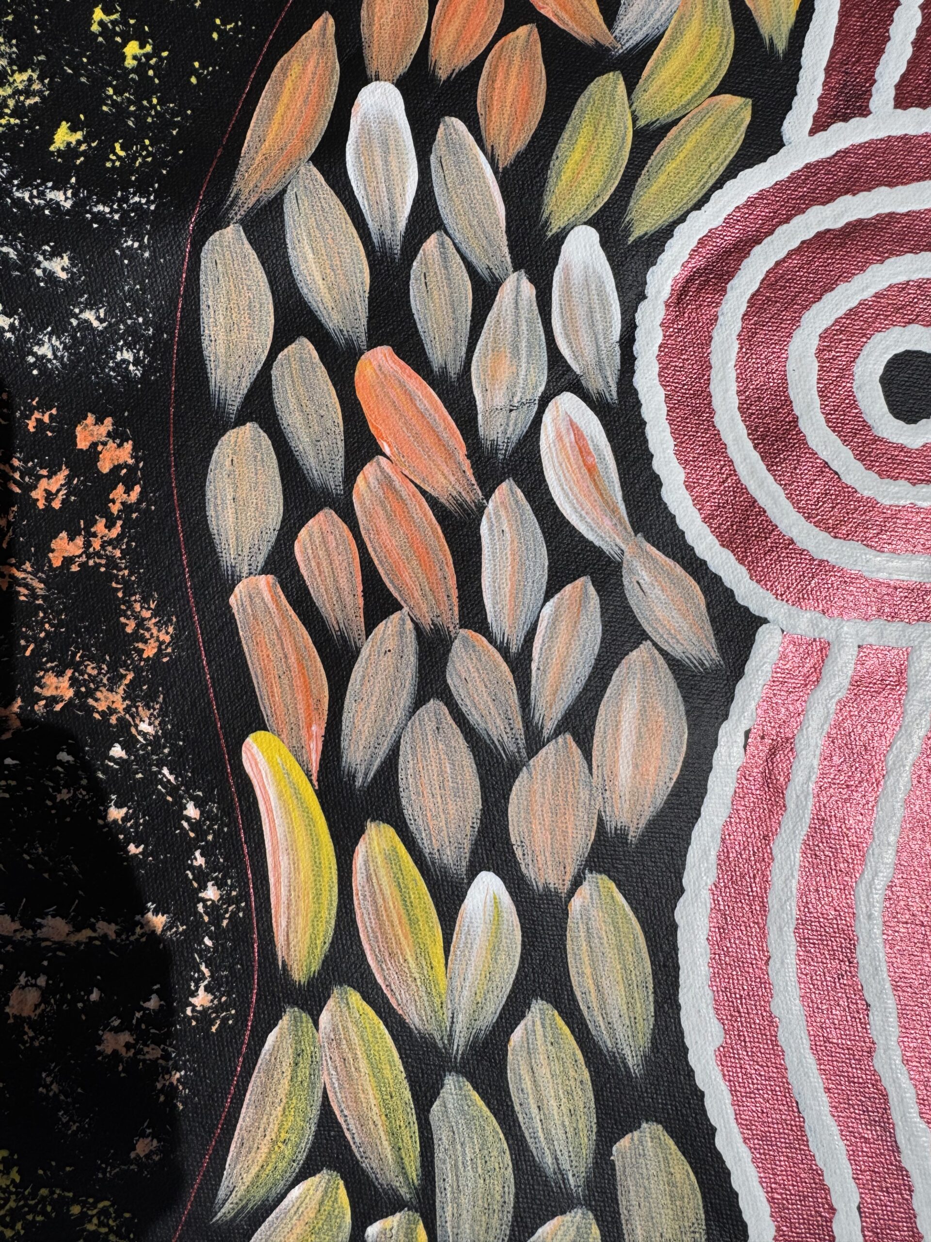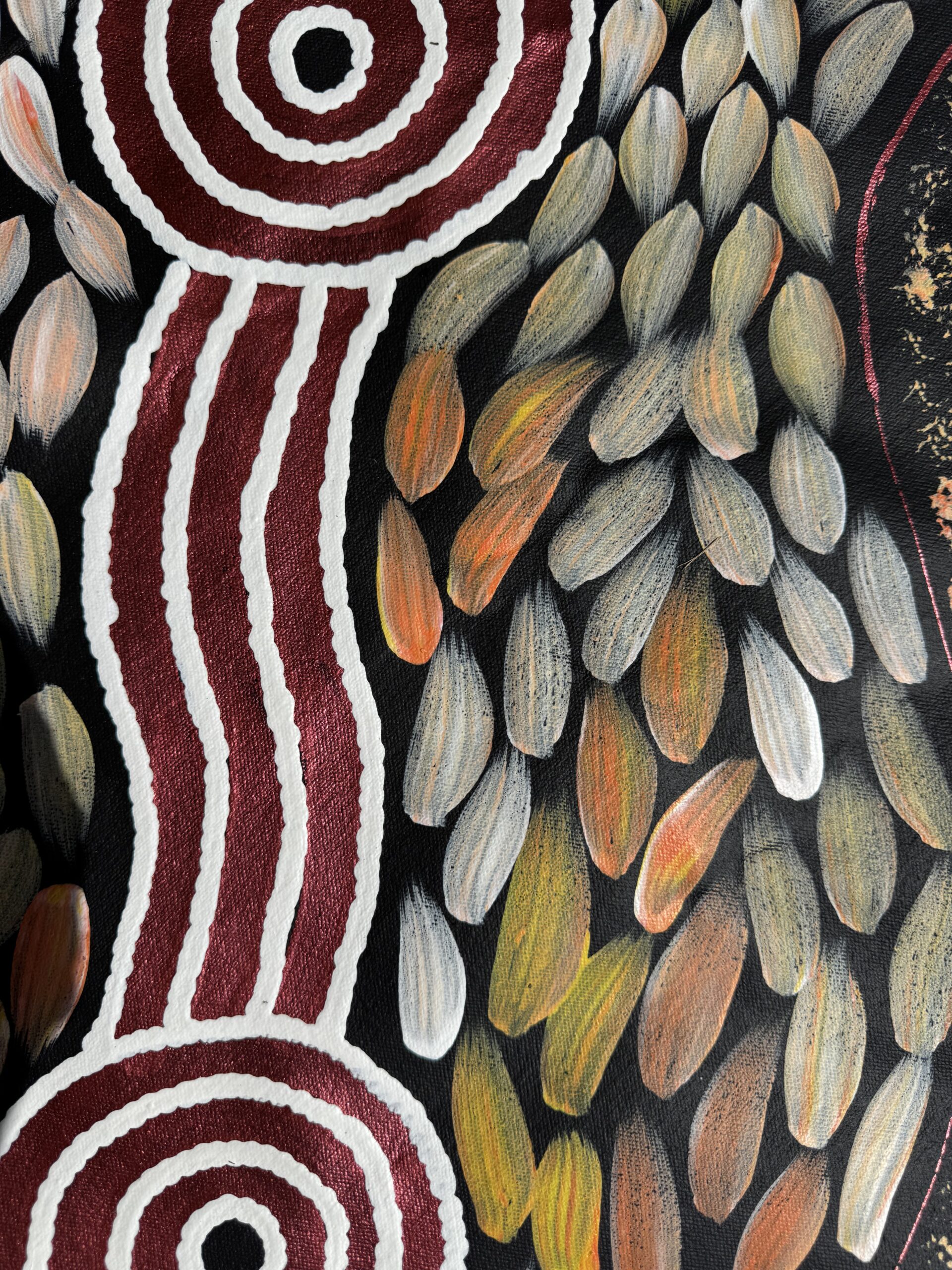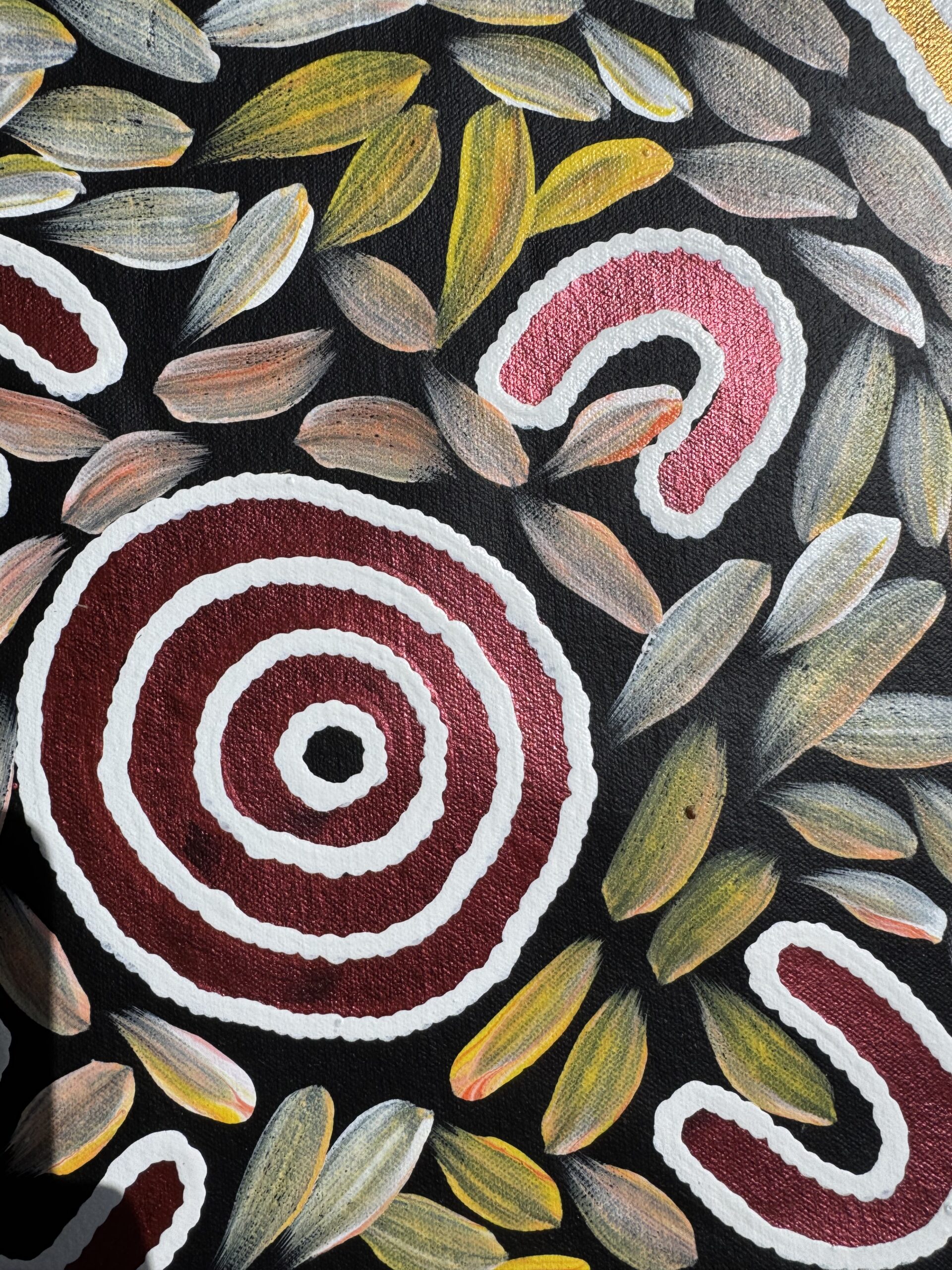 This painting tells the story of bush medicine — the traditional knowledge of healing plants, leaves, roots, and bark that has been passed down through generations. Bush medicine is central to life on Country, used to treat sickness, cleanse the body, protect spirit, and maintain balance between people and the land.
