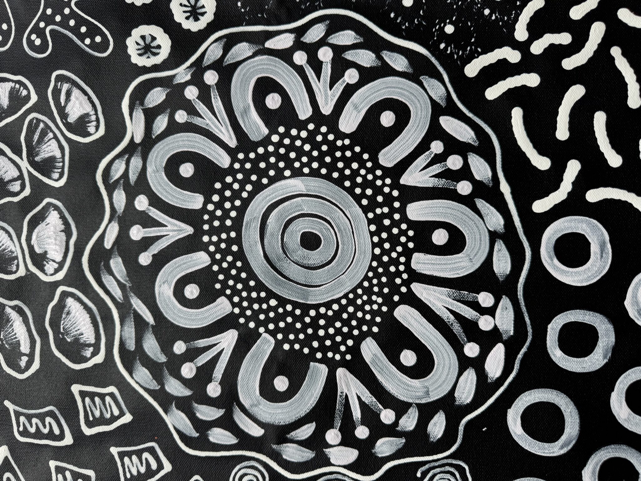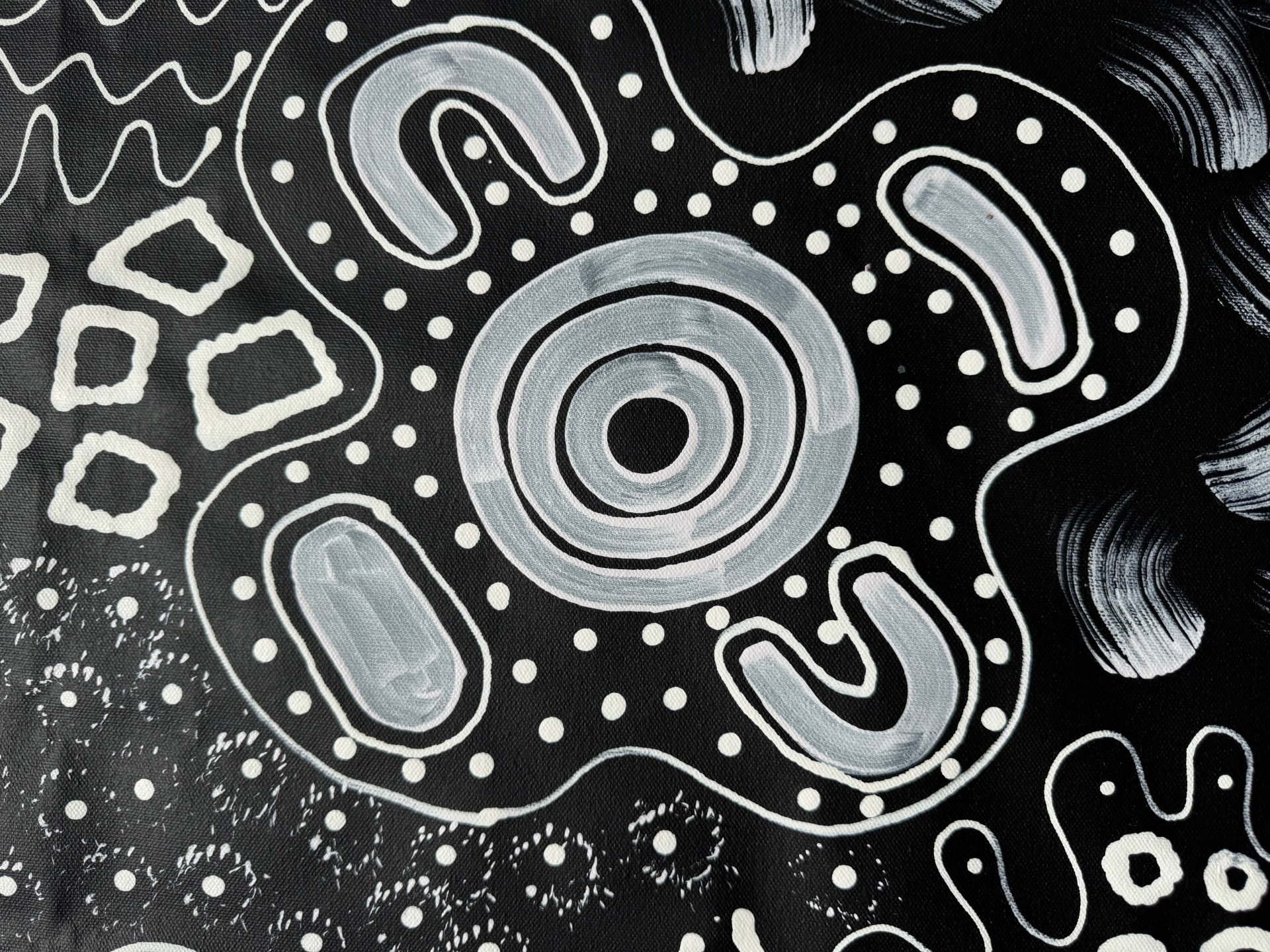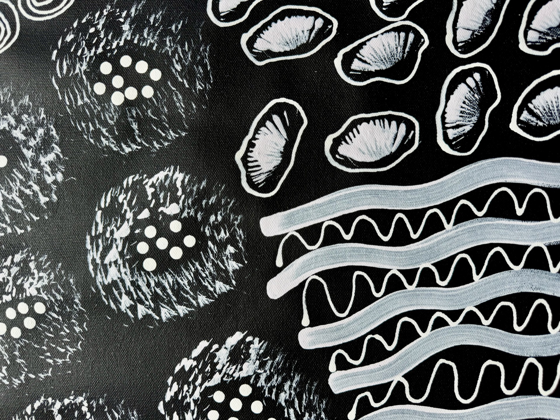 This painting tells the story of a woman walking across her Country collecting bush tucker to feed her family. The circles represent important places in the land, waterholes, resting places, and gathering sites where women meet and share knowledge. The flowing lines show the paths she travels as she moves through the desert, following the tracks and seasons that guide her to food.