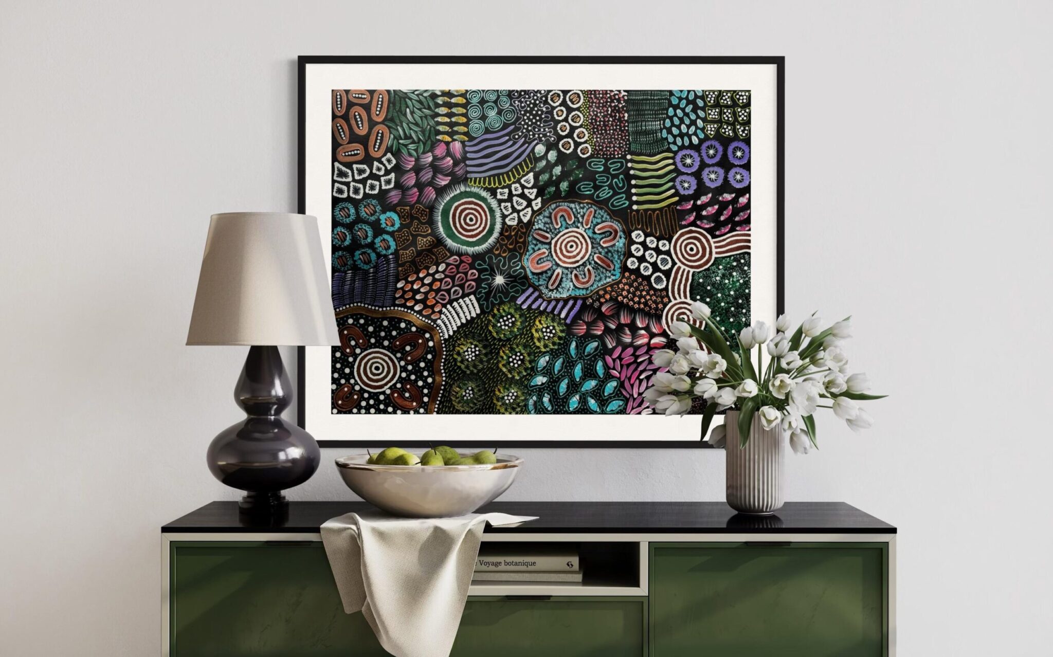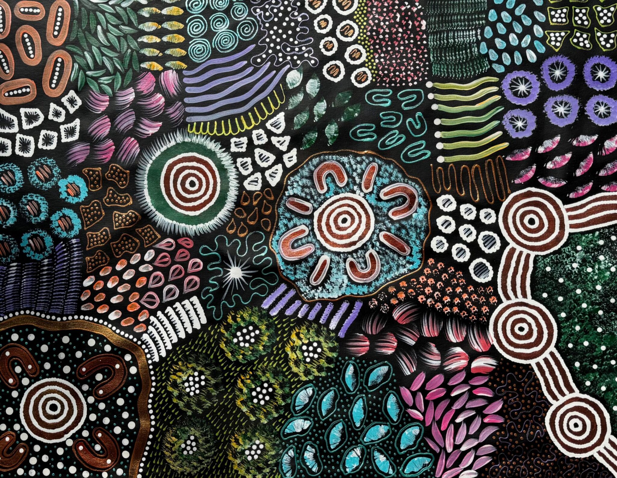 Sharon’s paintings vividly depict the waterholes, creeks, and sand hills surrounding Papunya. She is particularly renowned for her Kapi Tjukurrpa (Water Dreaming) works, which illustrate the elements of a storm—wind, rain, thunderclouds, and lightning. The lines in her pieces symbolize rain and the flow of water from the waterholes, often flooding the normally dry creek beds.