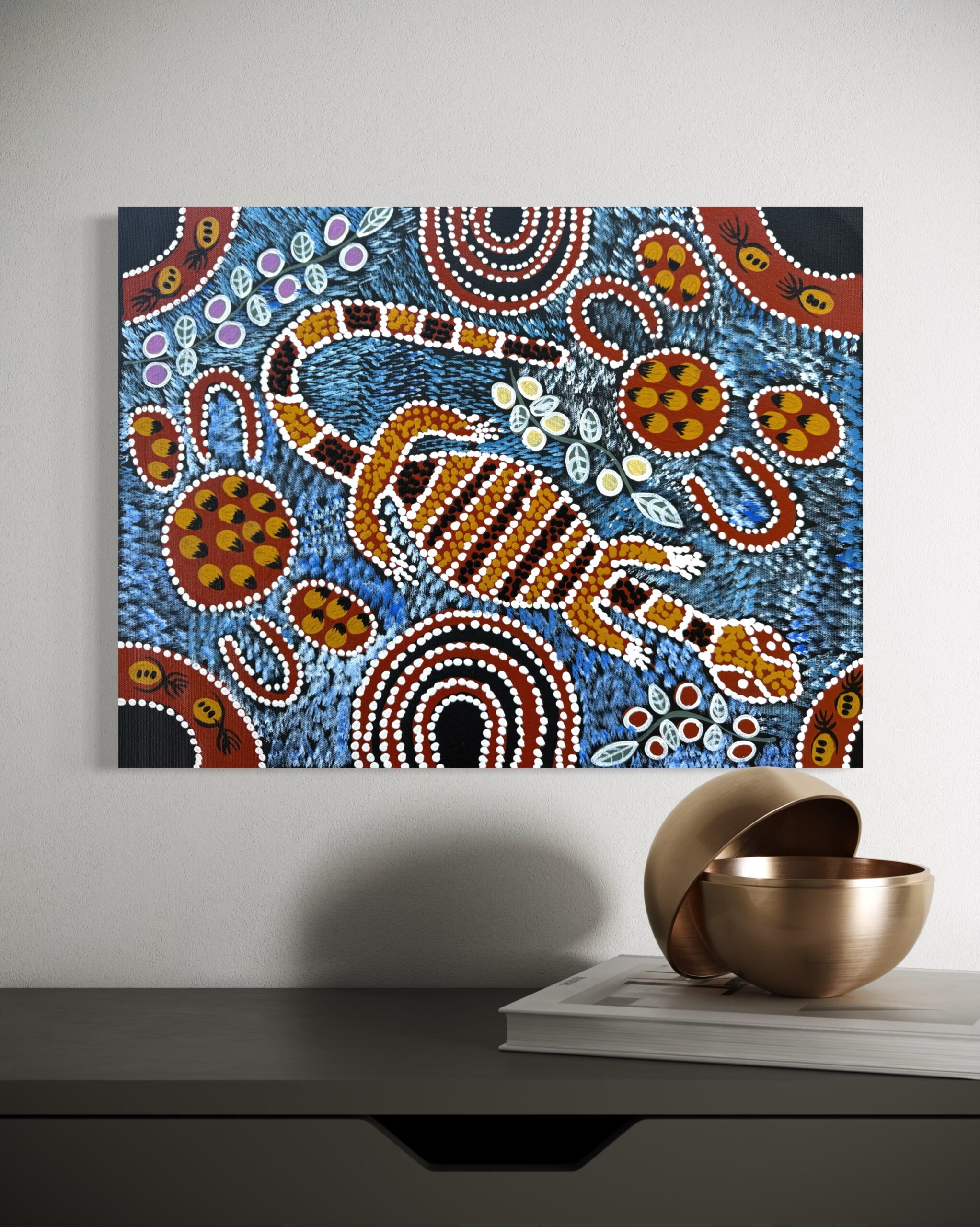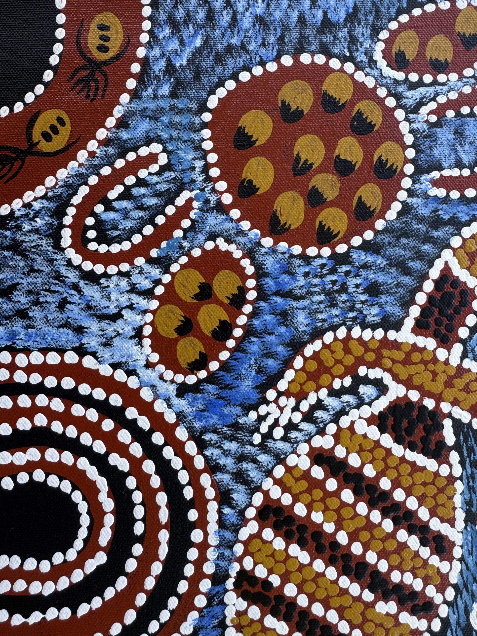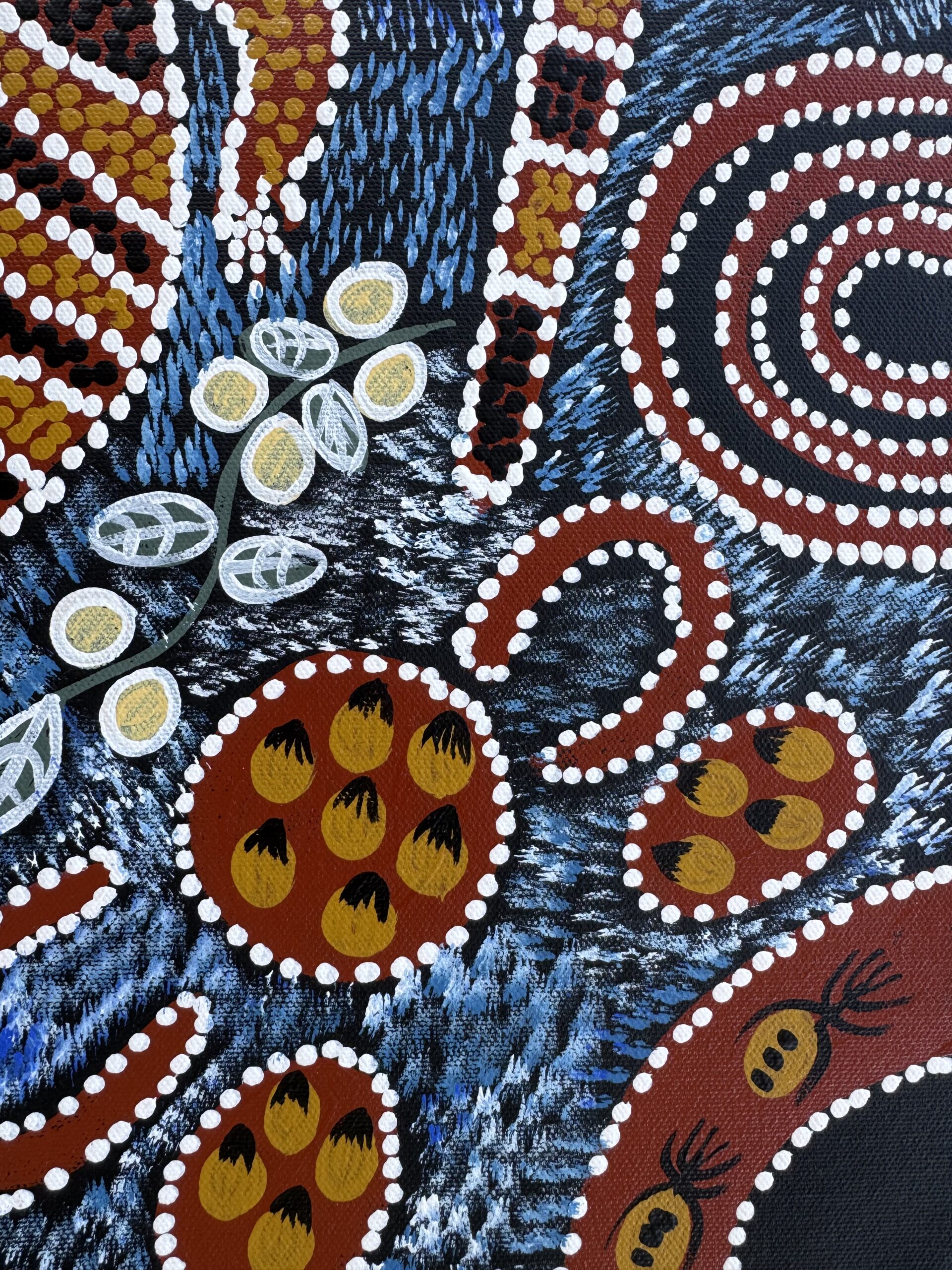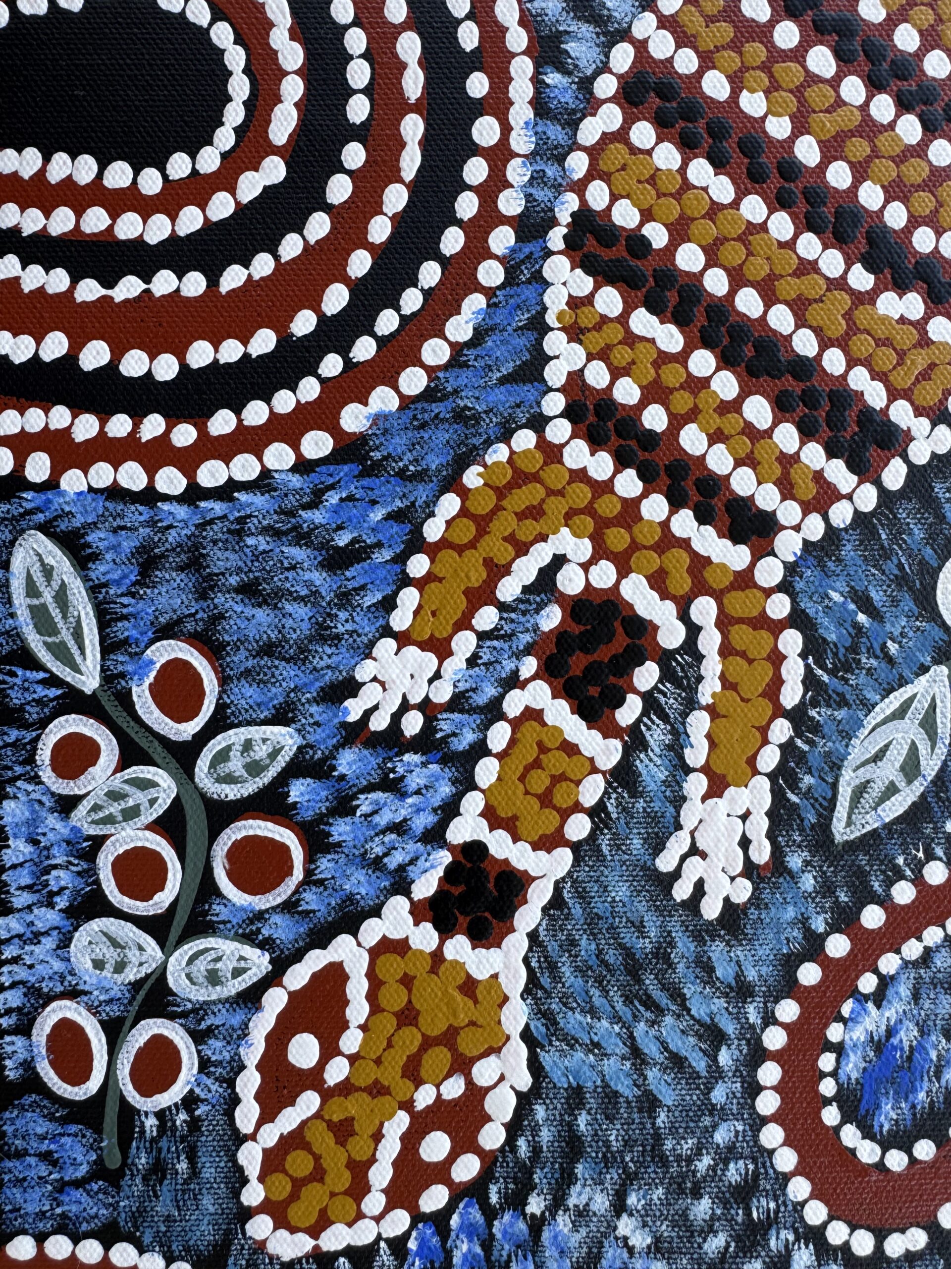 The rich dot work and layered patterns map the landscape — the paths walked, the places of gathering, and the connection between people, animals, and Country. Bush berries represent sustenance, sharing, and women’s knowledge, while the goanna symbolises survival, skill, and respect for the land’s resources.