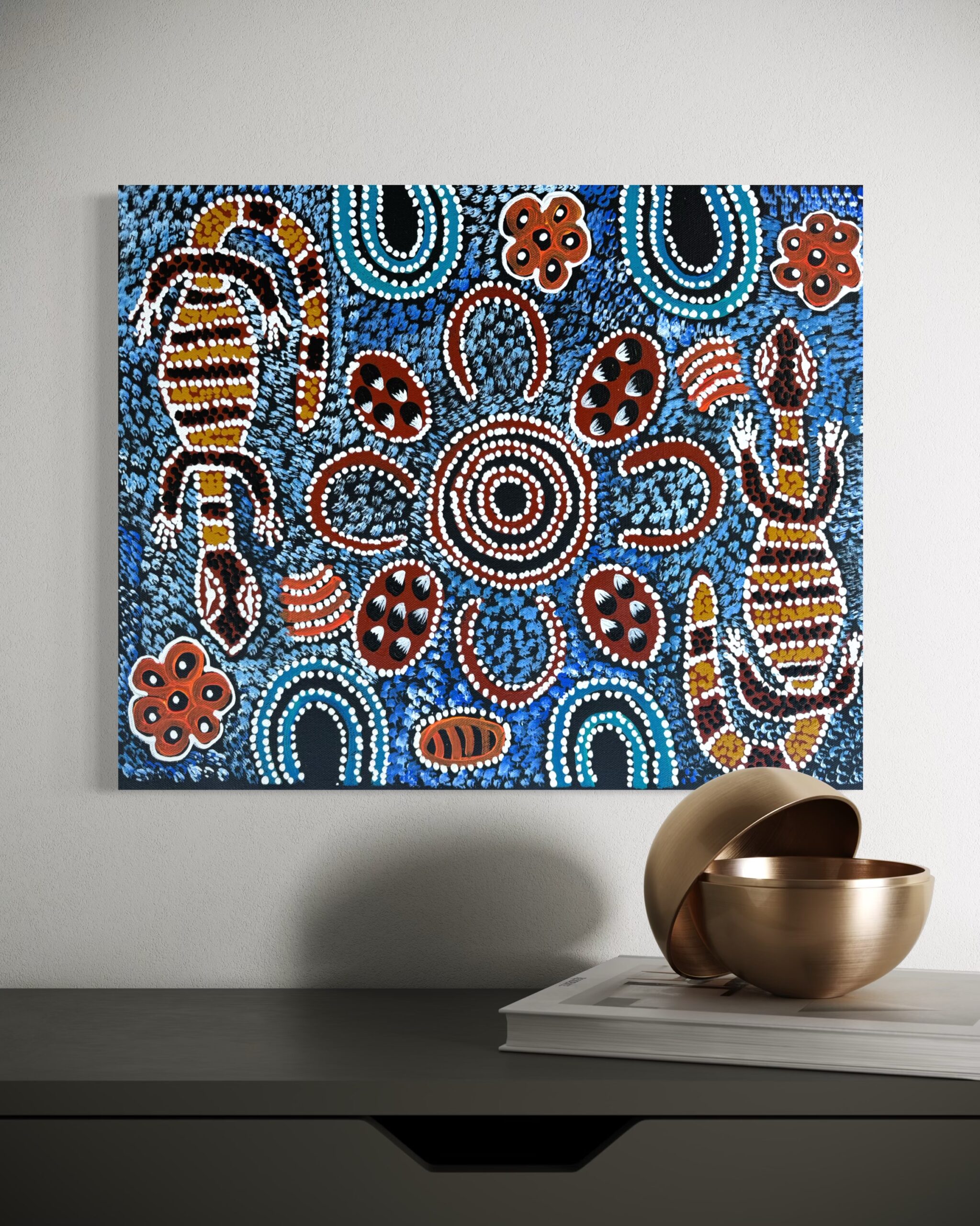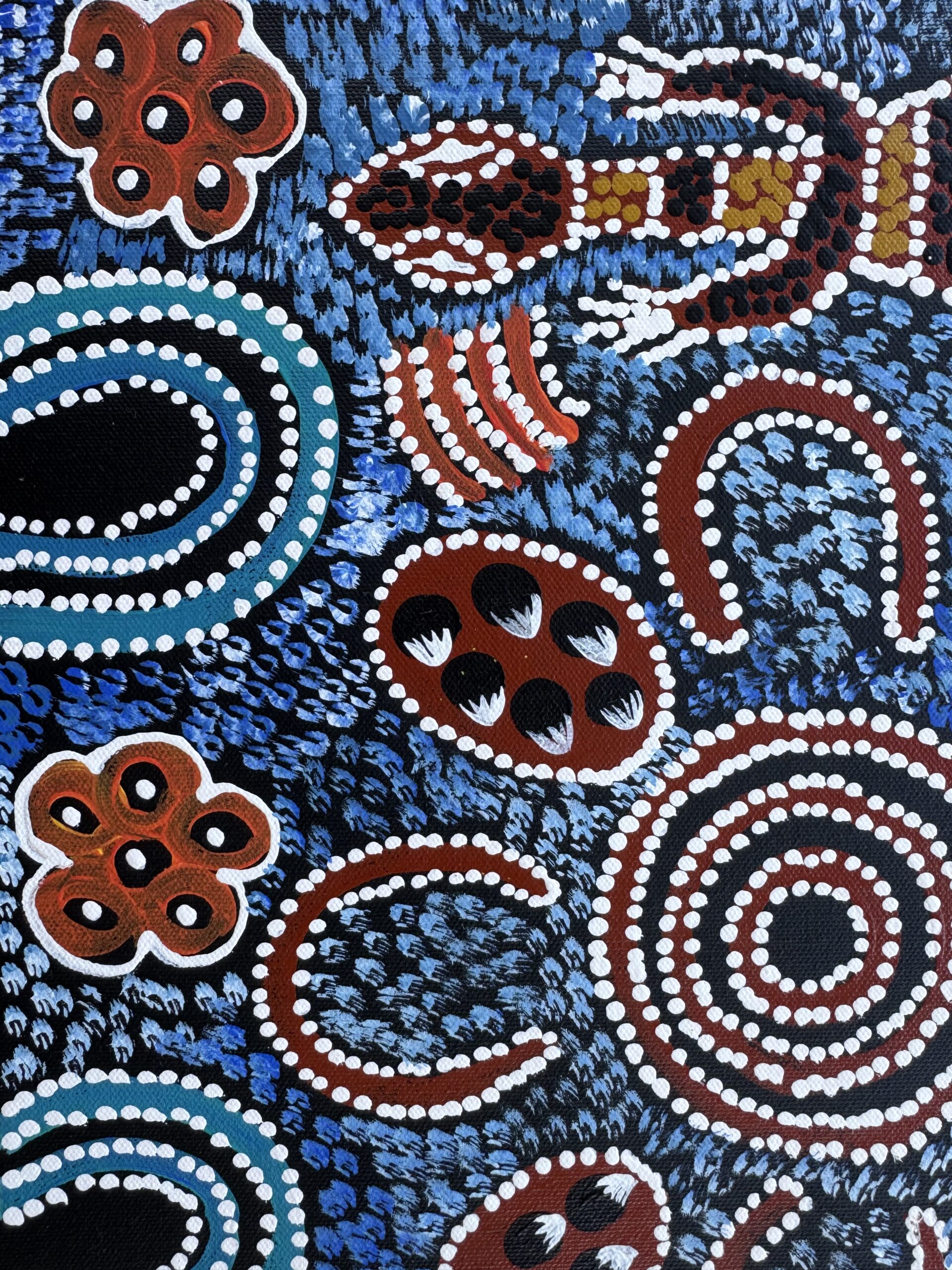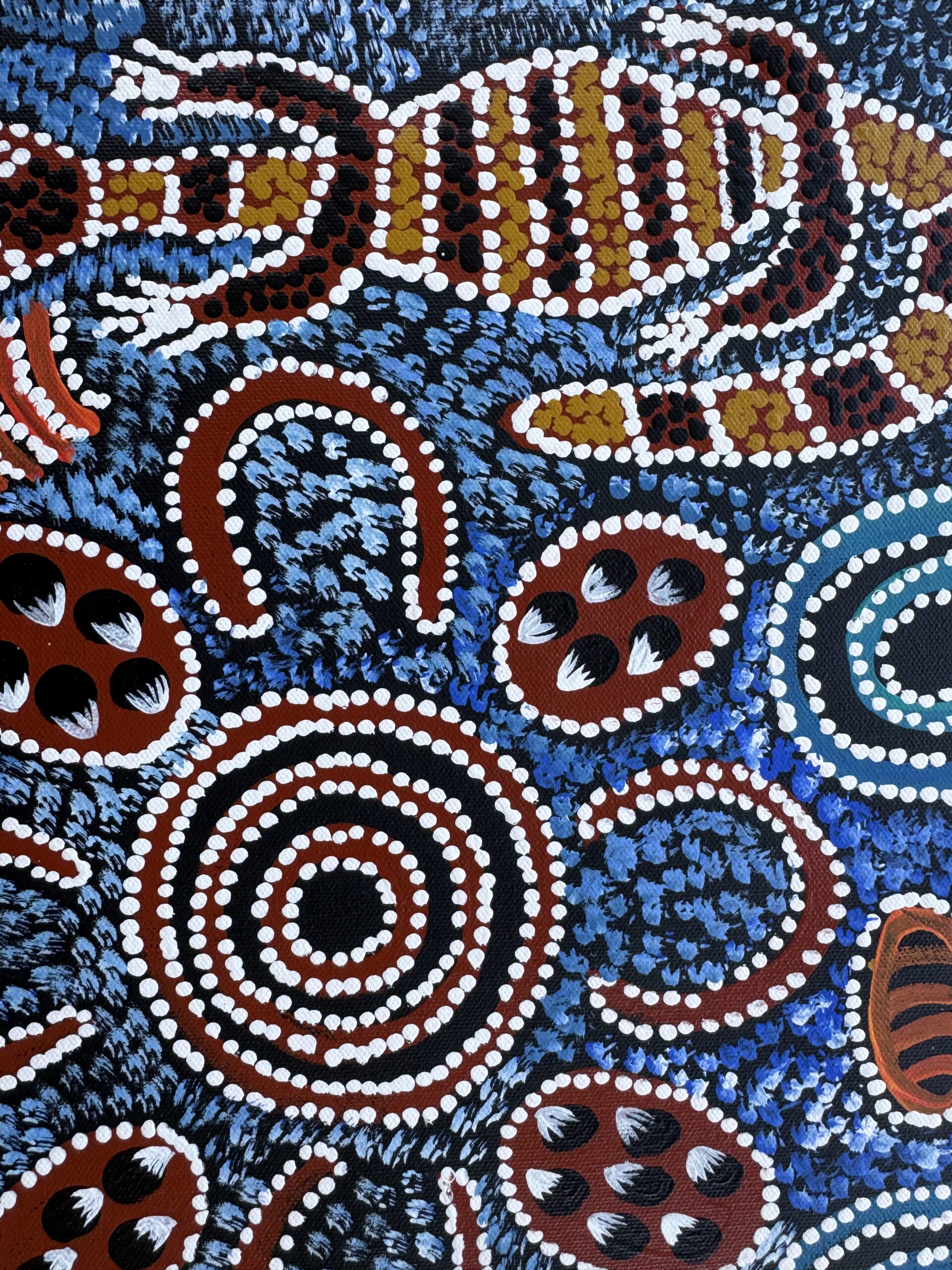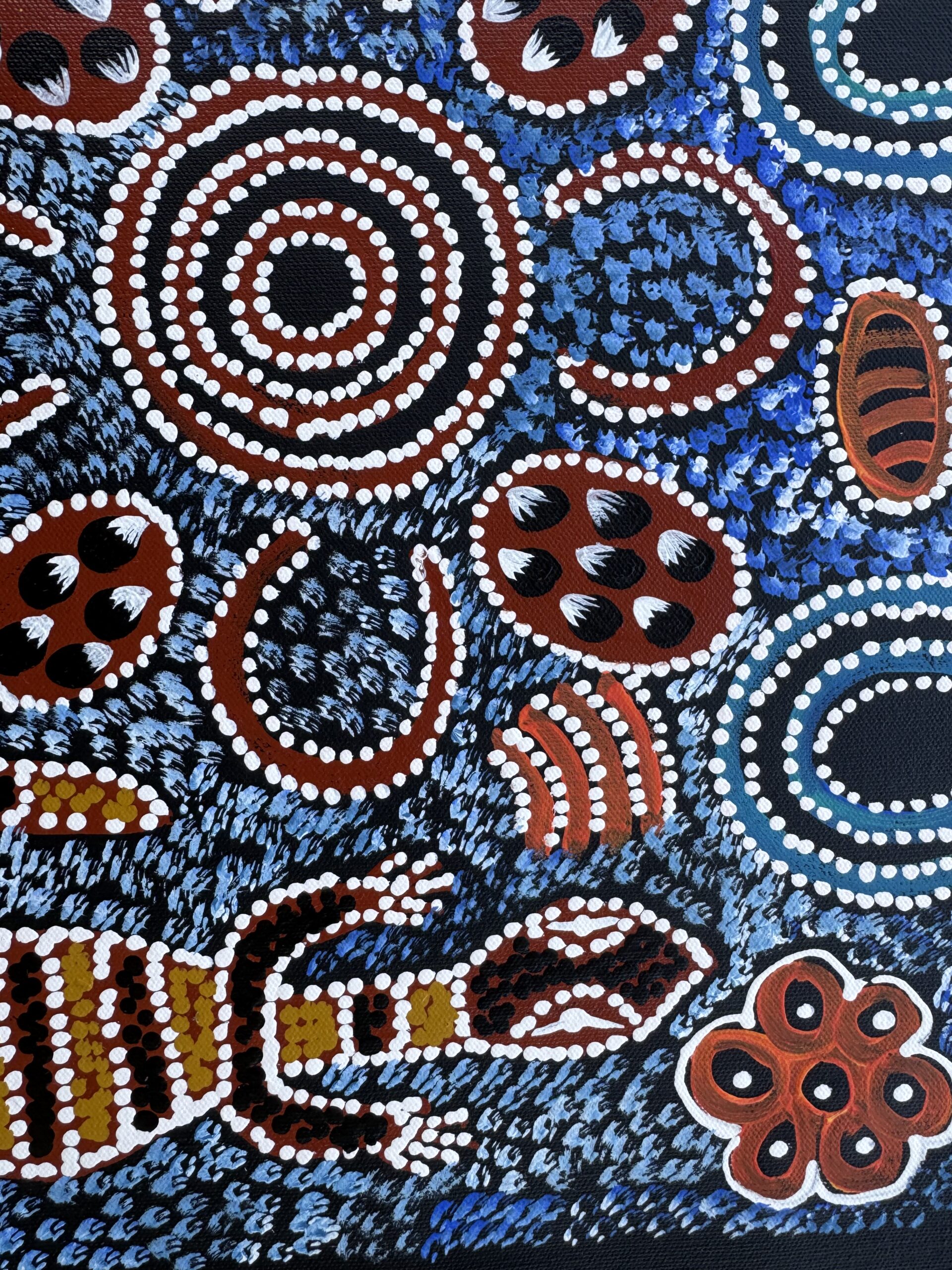 The rich dot work and layered patterns map the landscape — the paths walked, the places of gathering, and the connection between people, animals, and Country. Bush berries represent sustenance, sharing, and women’s knowledge, while the goanna symbolises survival, skill, and respect for the land’s resources.