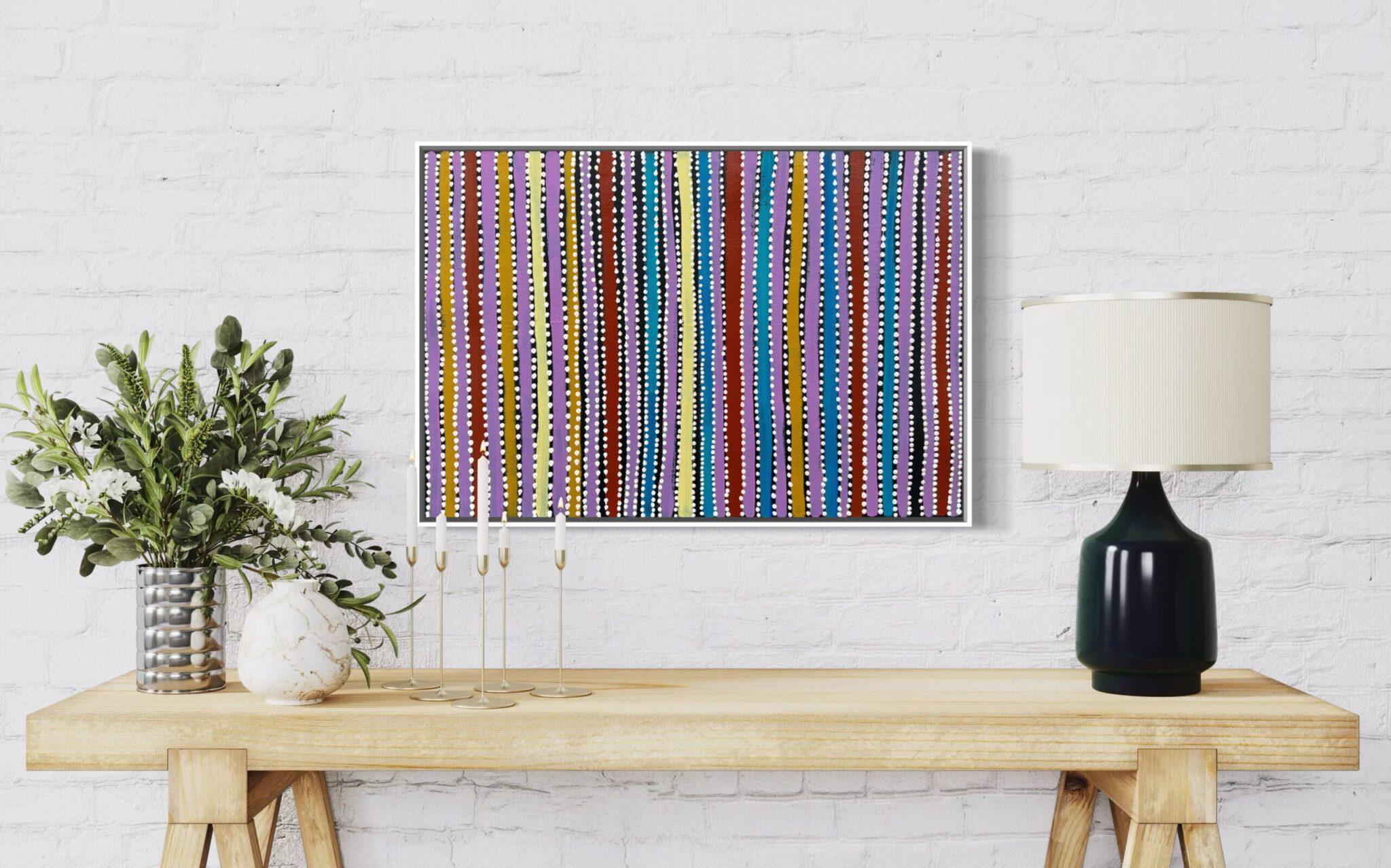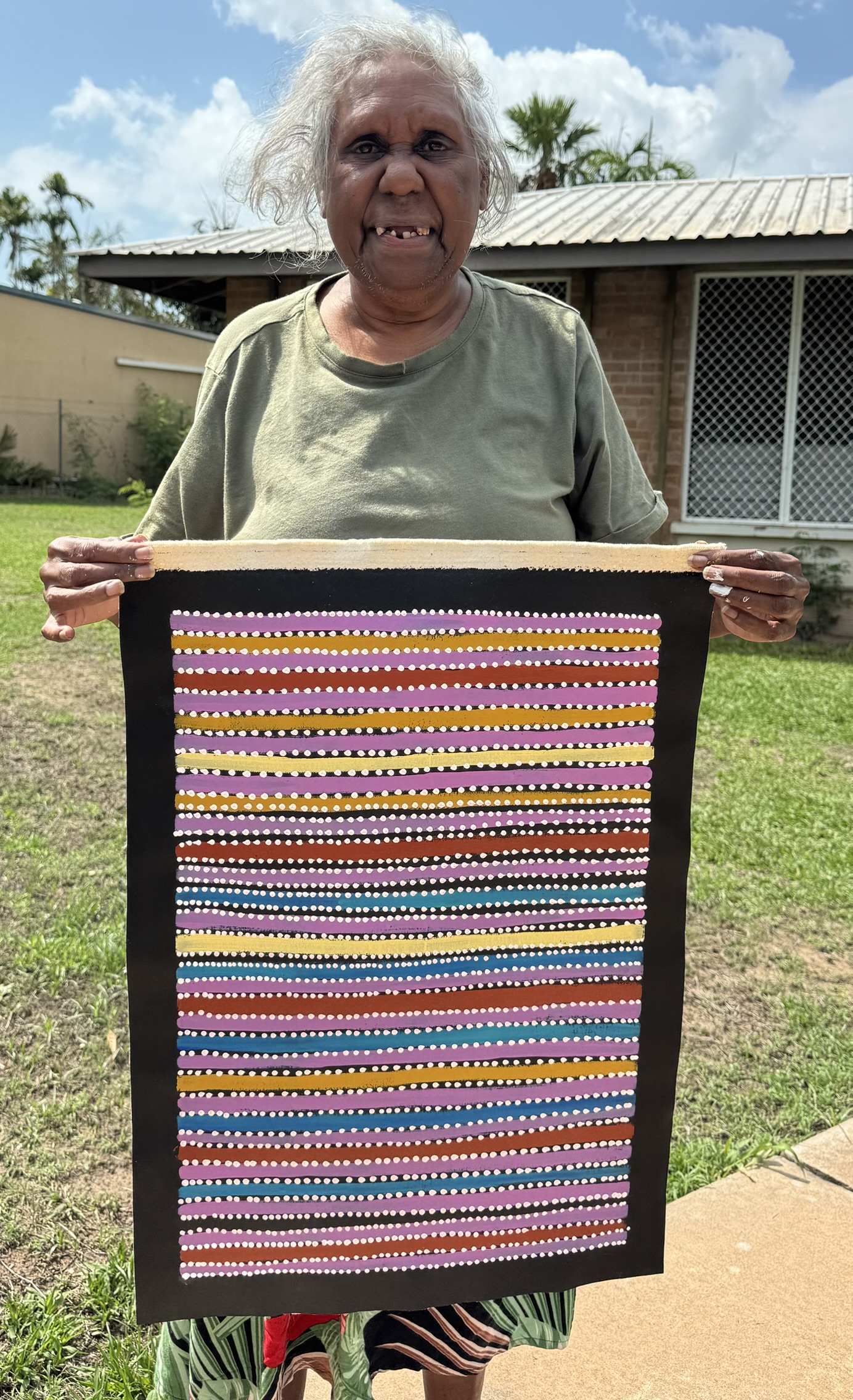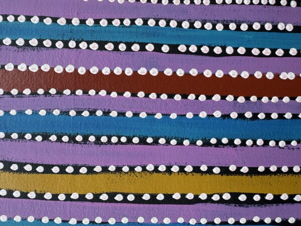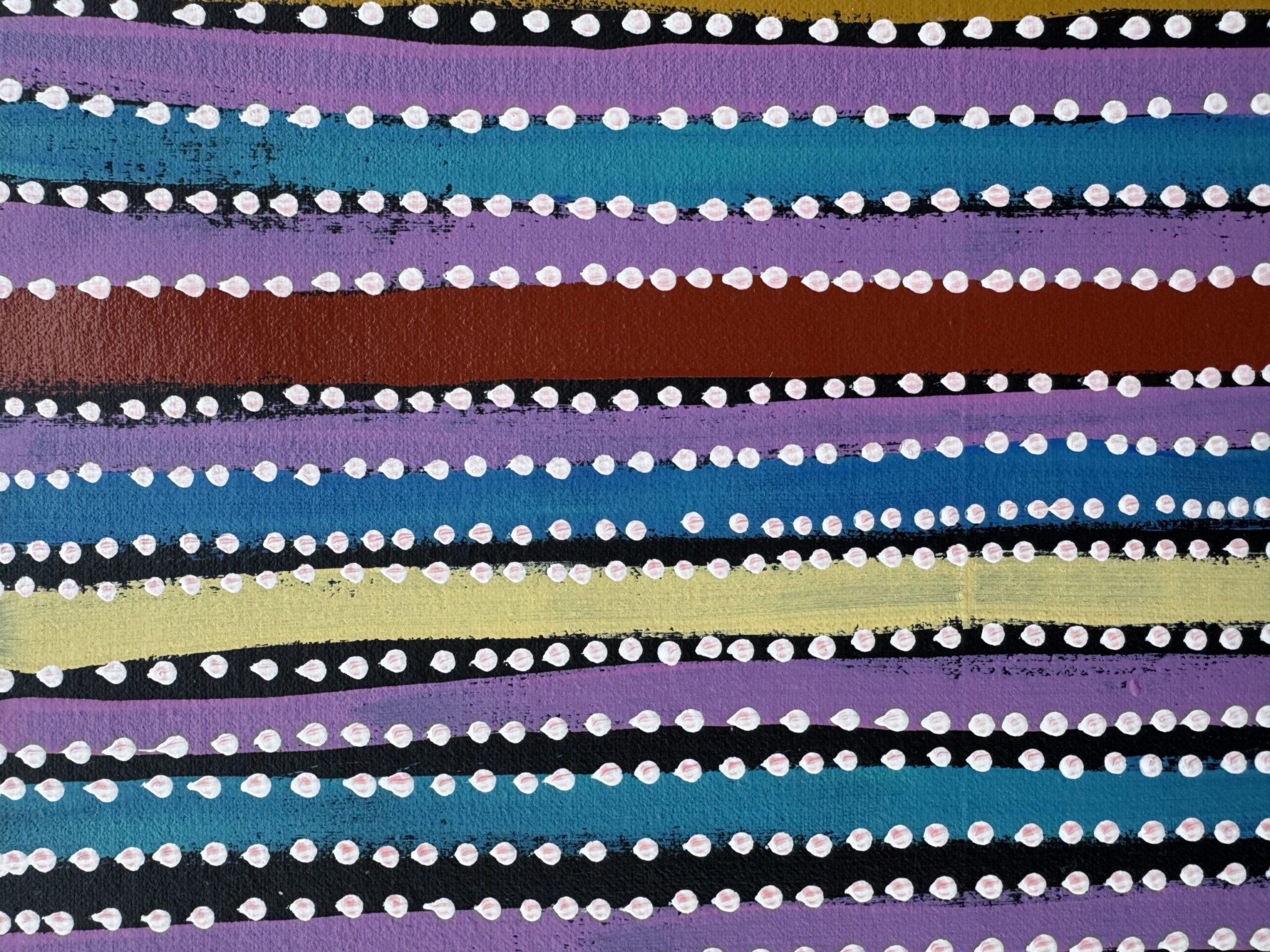 Lanita Numina is the eldest of the six well known desert artists, the Numina Sisters. She has two brothers, her dear father has passed and her mother is living and still painting in Darwin. Like her sisters, Lanita went to primary school on Stirling Station near Tennant Creek. She comes from a long line of desert painters of the contemporary Aboriginal art and dot-dot central desert movement. Lanita lived with her mother and aunties on Stirling Station near Ti Tree. She started painting later than her other sisters. Lanita was surrounded by her well renowned painter aunties: Gloria and Kathleen Petyerre, who are well established artists in Alice Springs. Lanita lives in Darwin with her little sister Sharon.
