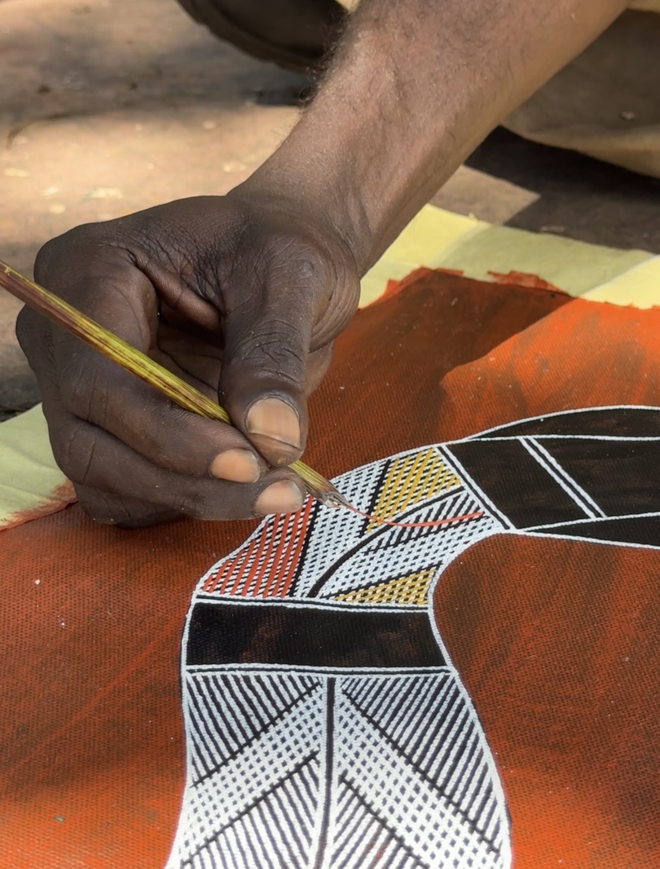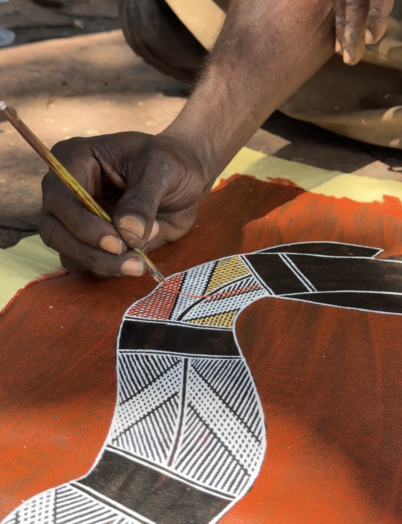 Terrence’s artwork is an extension of these stories and experiences. Each piece reflects the landscapes, ancestral narratives, and cultural knowledge that have shaped his life, offering viewers a glimpse into the living culture of West Arnhem Land. Through both his guiding and his art, Terrence plays an important role in sharing and preserving the traditions of his people for future generations.